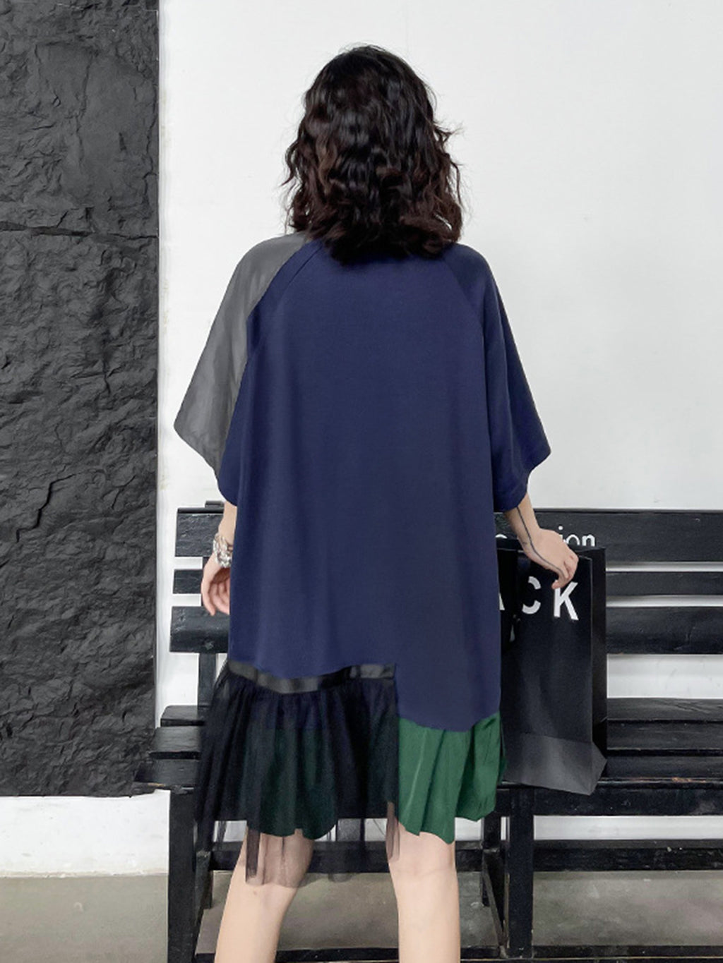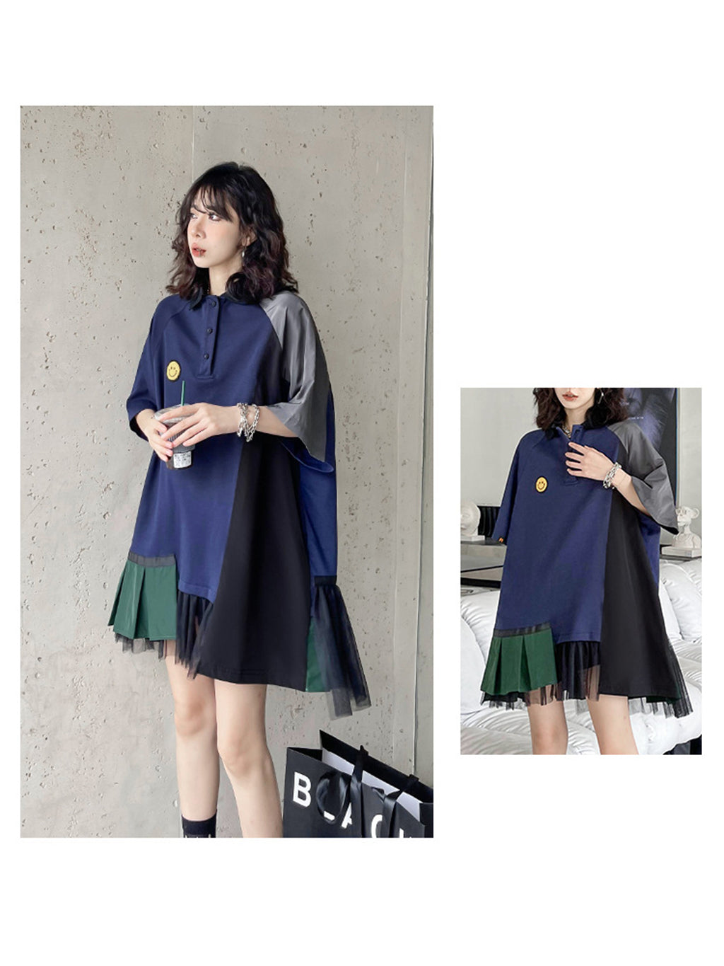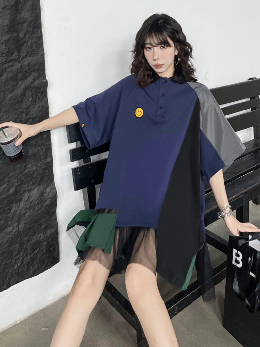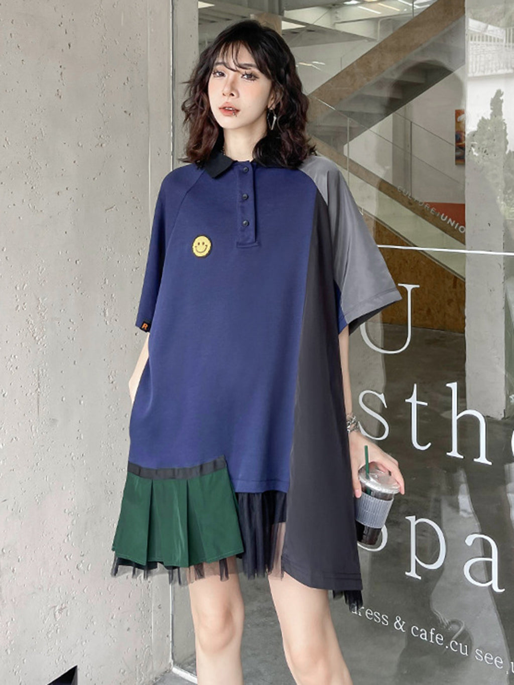 クラシックなポロ襟に、グリーンとブラックの切替えプリーツやチュールを重ねた大胆な構成が印象的なドレス。フロントにはワンポイントでスマイルパッチを添え、ユニークなアクセントに。袖と身頃に異なるカラーと素材が組み合わさることで、角度によって印象が変化する構成。ゆったりとしたシルエットが抜け感を演出しつつ、裾のチュールが軽やかさと個性を引き立てる。