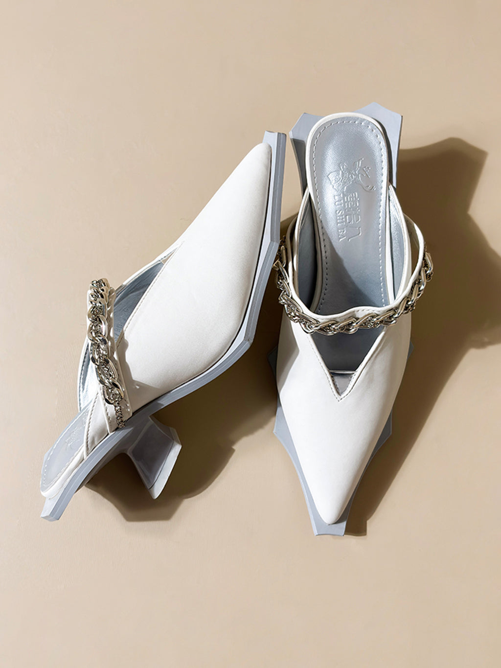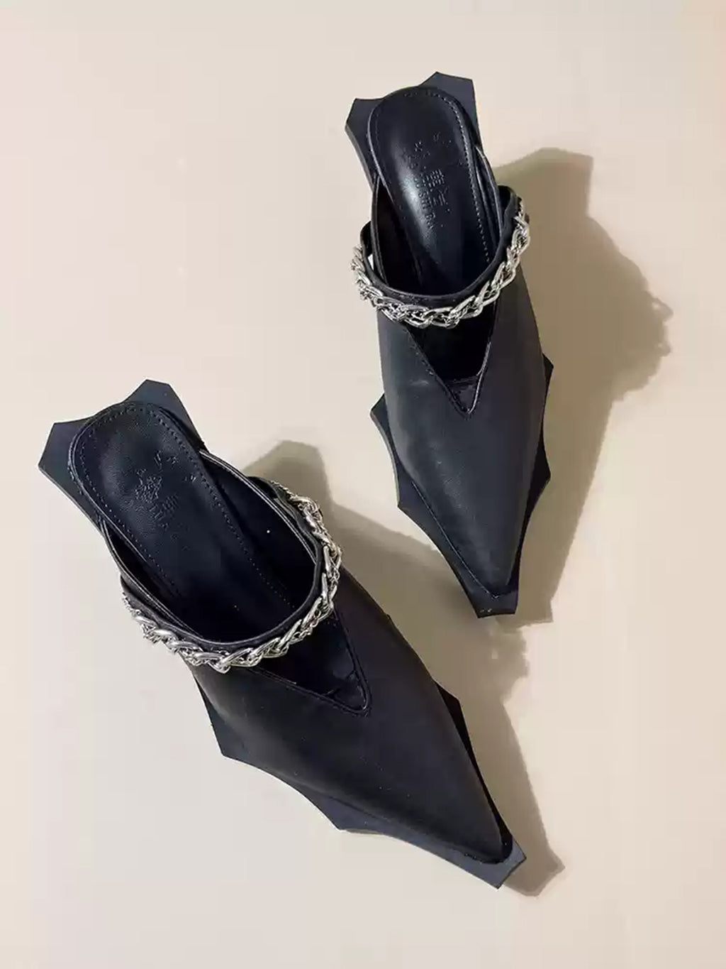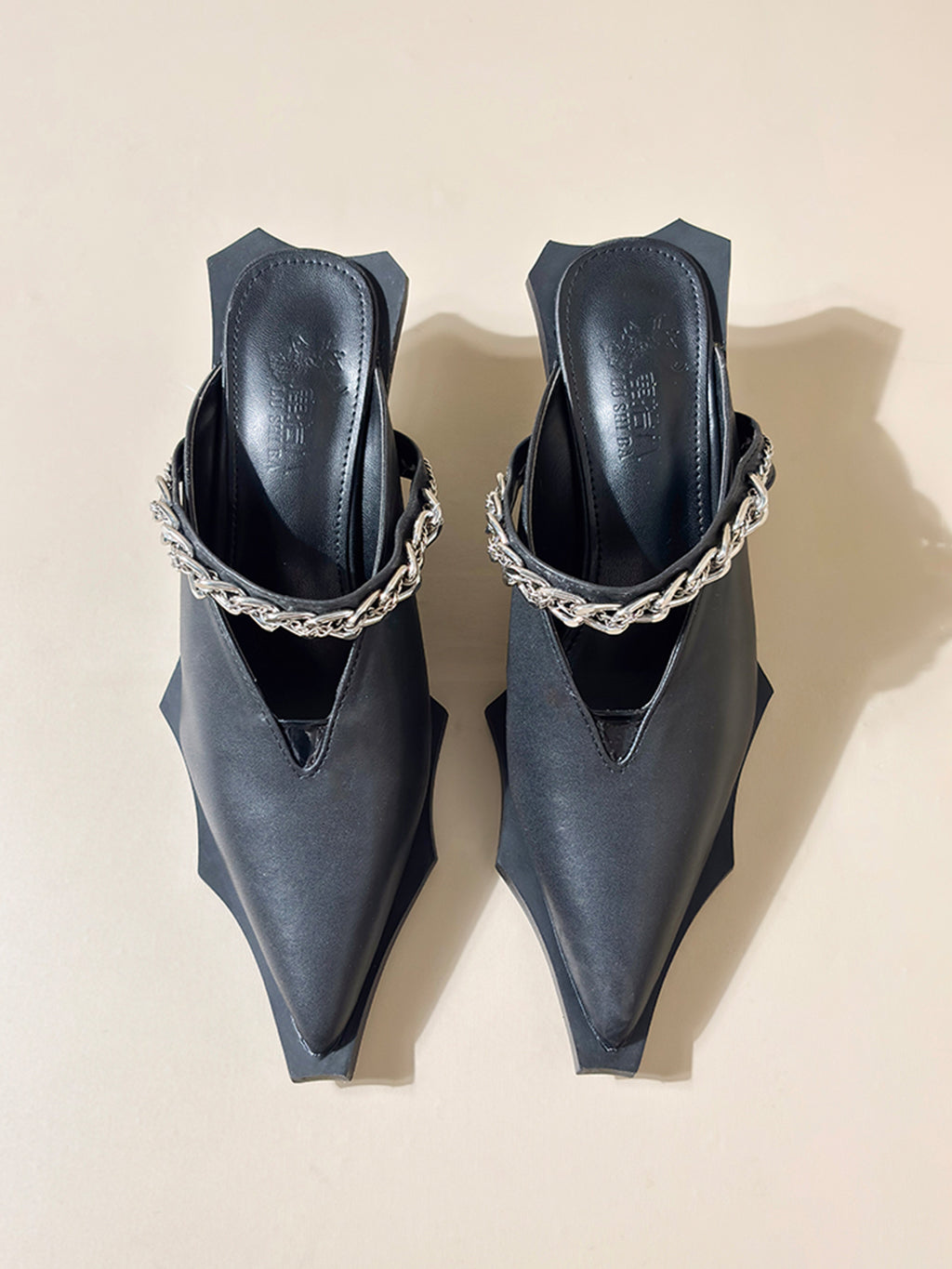 エッジの効いたシルエットが際立つ、個性的なミュール。