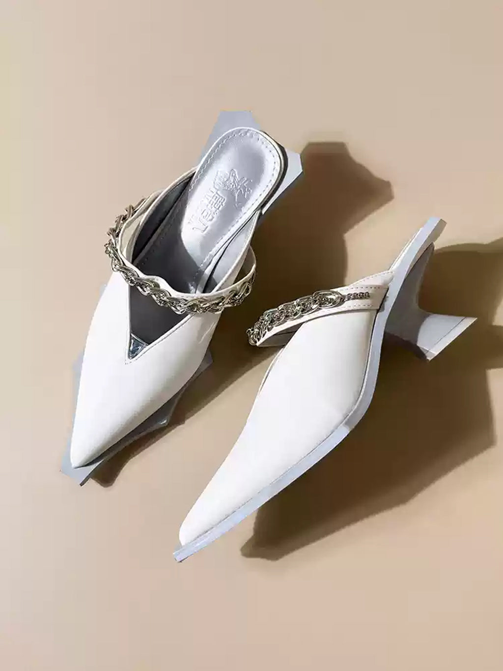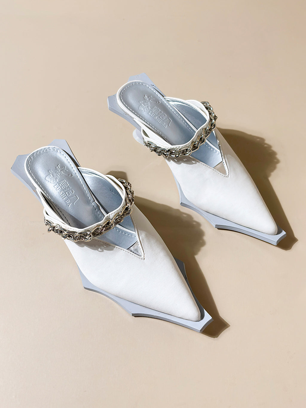 甲を覆うシャープなカッティングと、足首にかかるチェーンストラップが大胆なアクセントに。