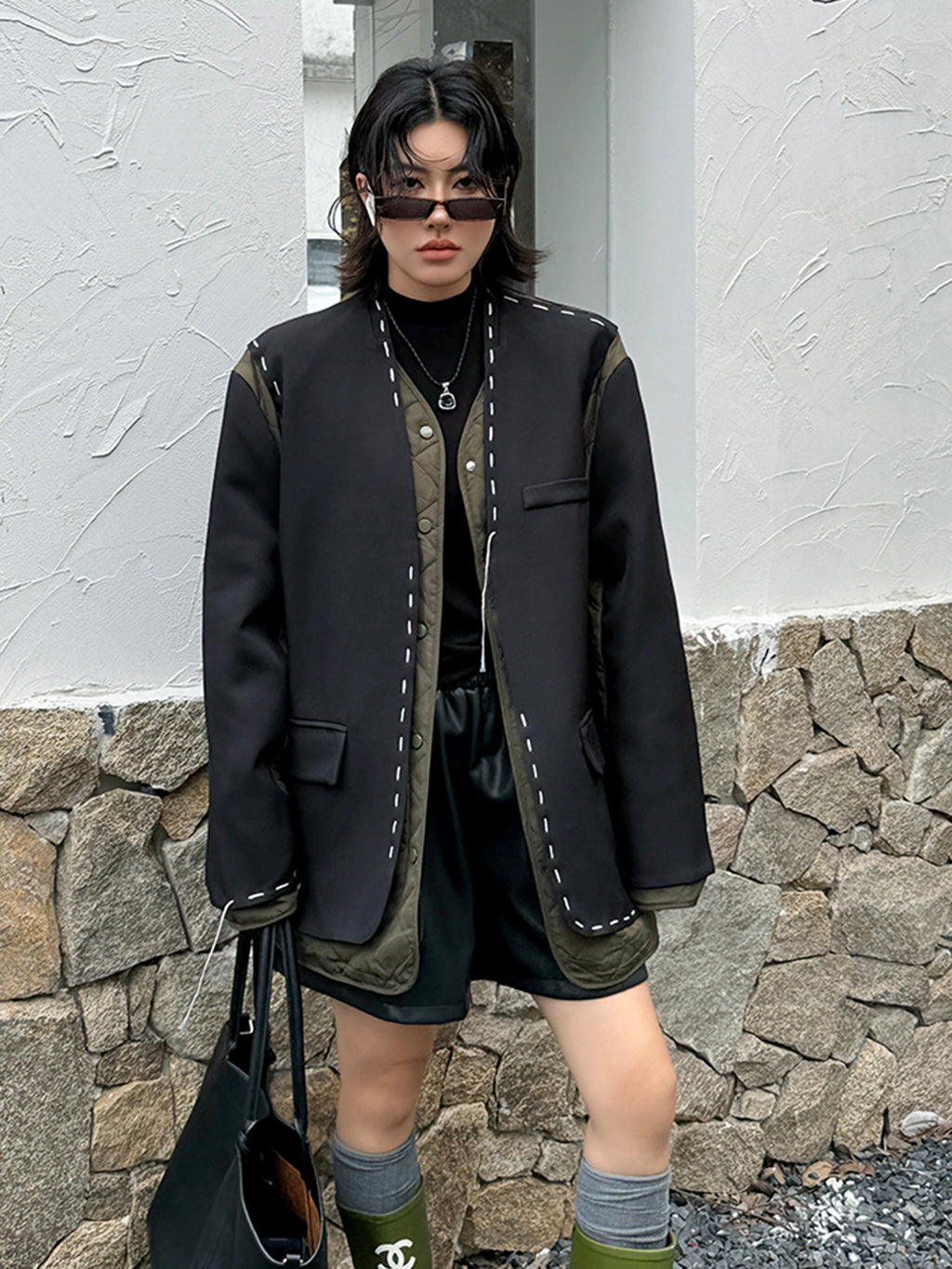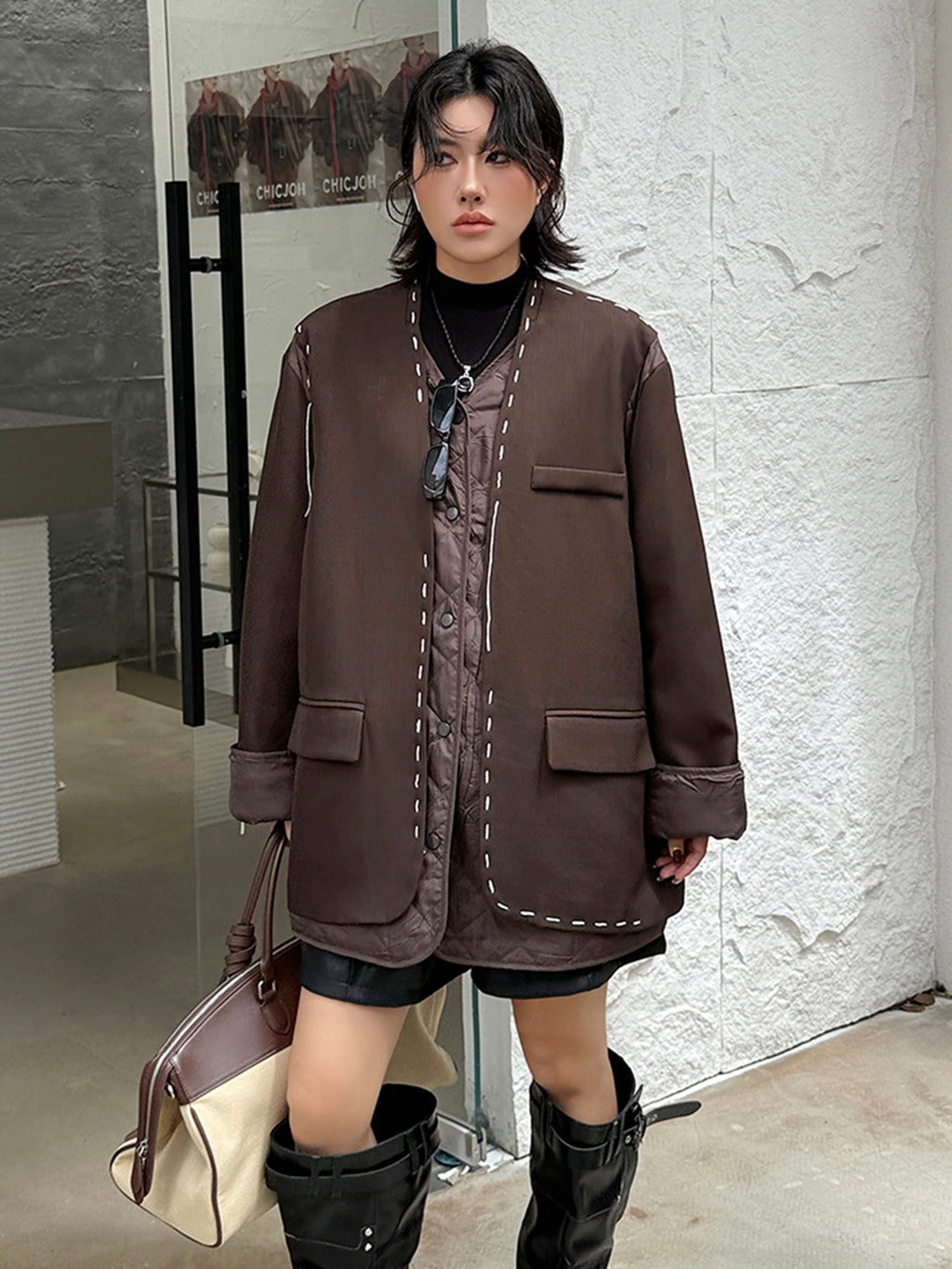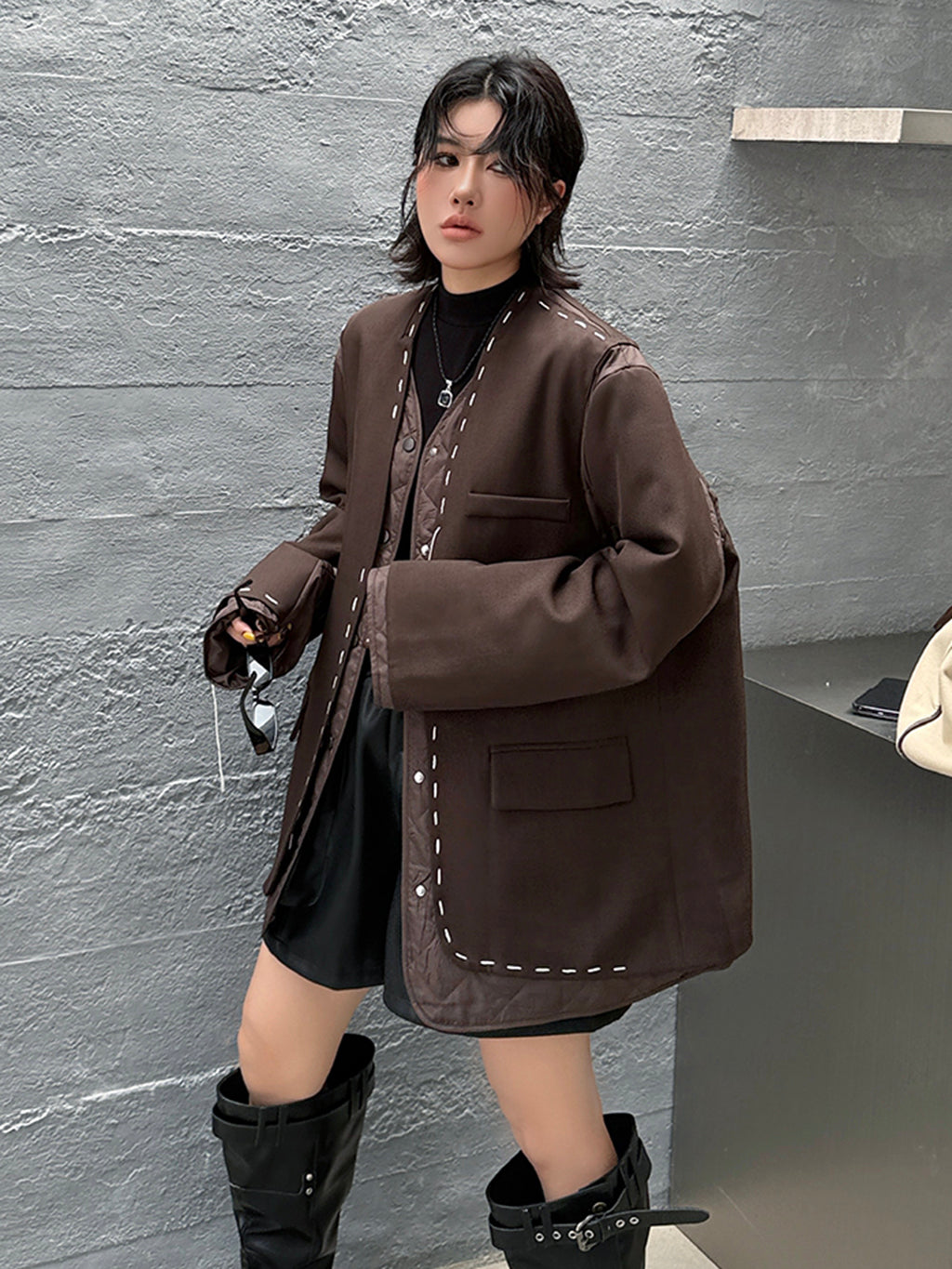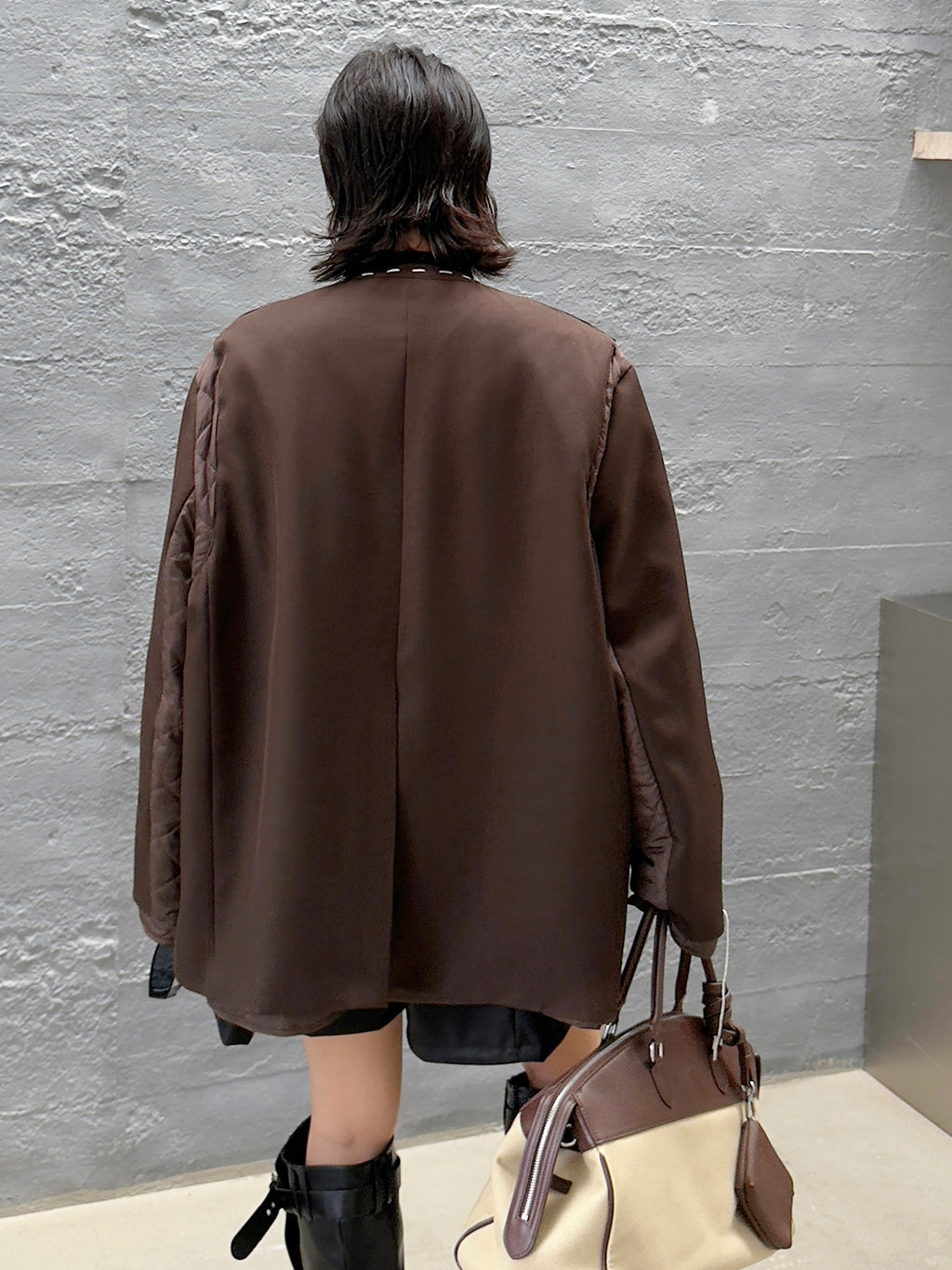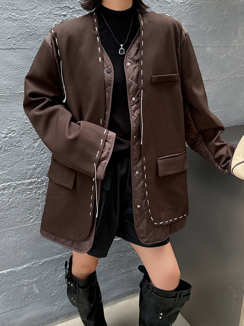 ゆったりとしたシルエットにドロップショルダーを組み合わせたノーカラージャケット。前立てと裾、ポケット縁には大きめステッチのような装飾を施し、シンプルながら視線を引きつけるデザインに仕上げた。袖と身頃には異素材を切り替えて構築的な立体感を演出。中綿入りのキルティングが内側から覗くことで、温かみと奥行きを加える。ヒップを覆う程よい丈感で、軽やかながら季節の変わり目にも重宝する。