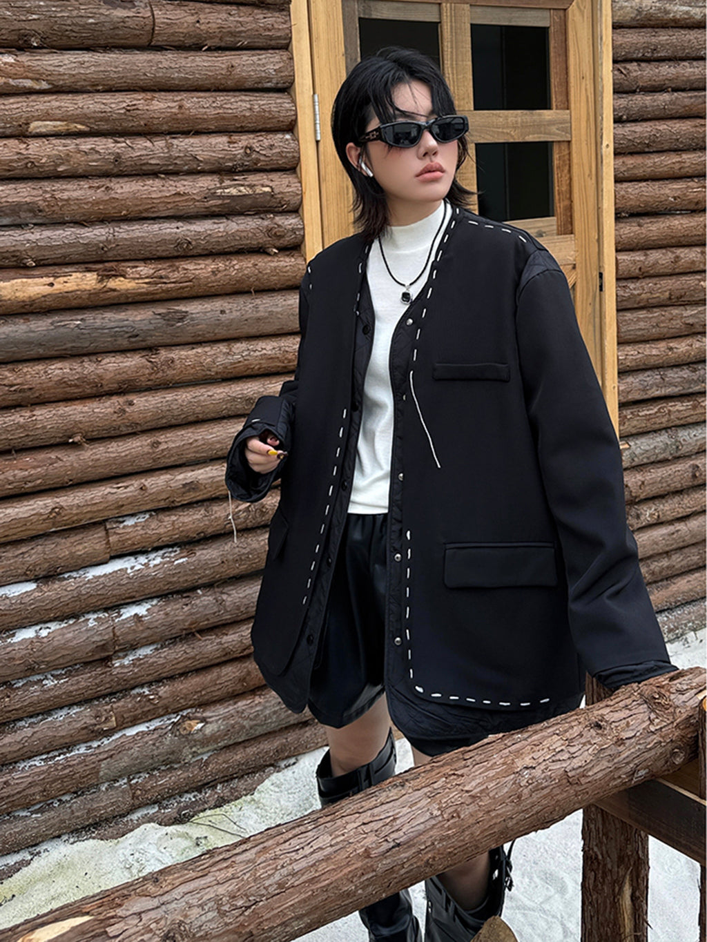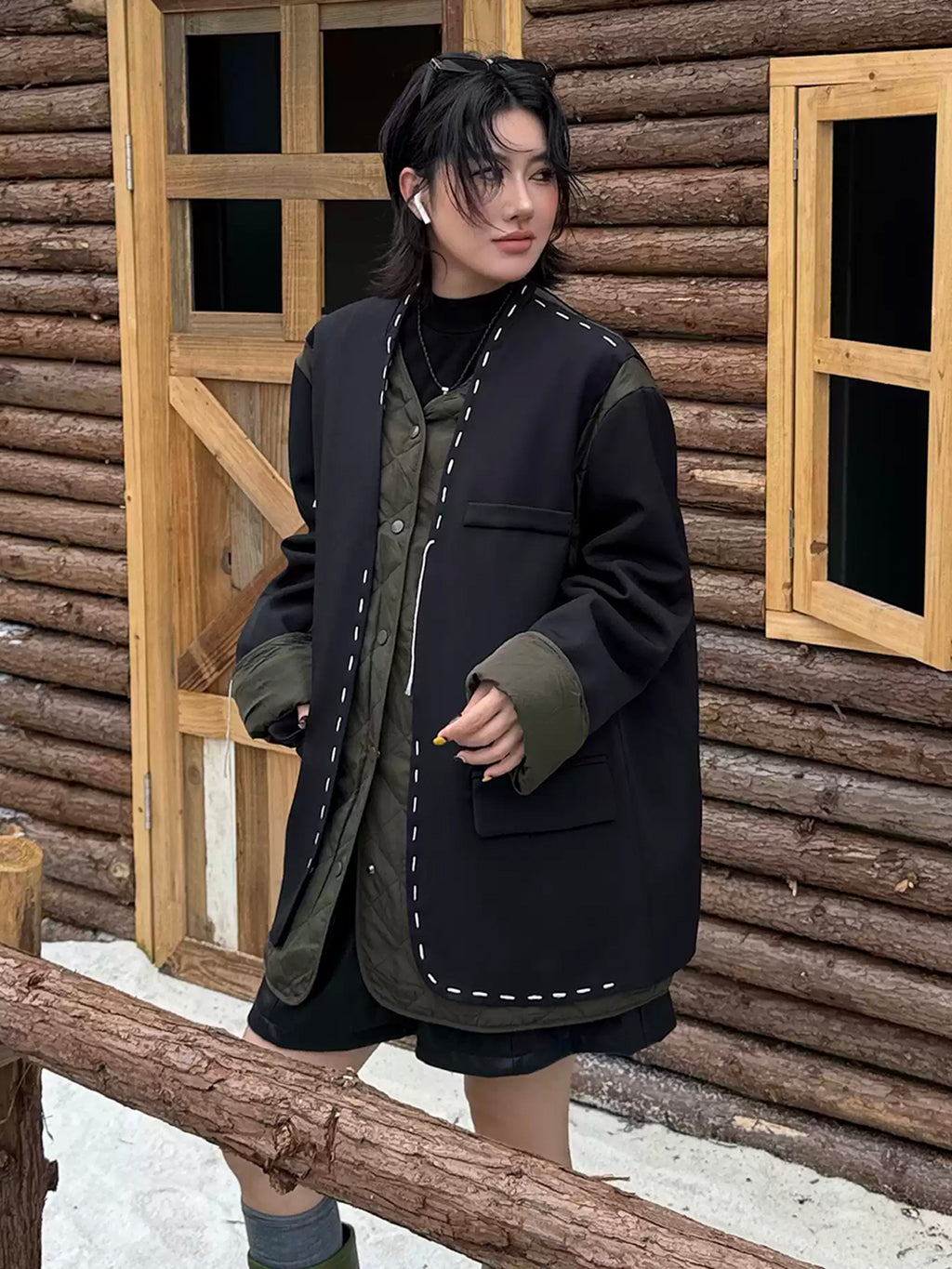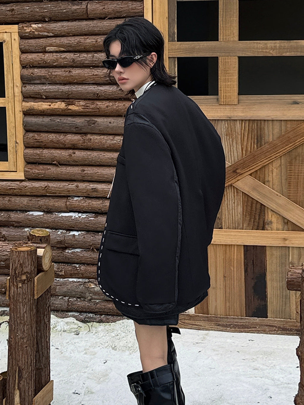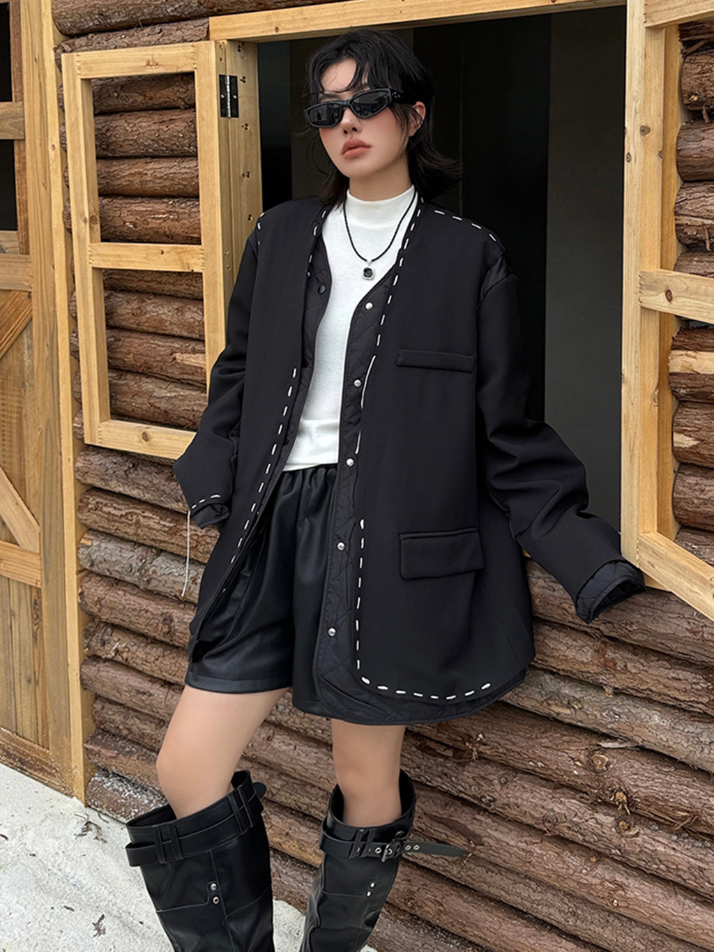 ゆったりとしたシルエットにドロップショルダーを組み合わせたノーカラージャケット。前立てと裾、ポケット縁には大きめステッチのような装飾を施し、シンプルながら視線を引きつけるデザインに仕上げた。袖と身頃には異素材を切り替えて構築的な立体感を演出。中綿入りのキルティングが内側から覗くことで、温かみと奥行きを加える。ヒップを覆う程よい丈感で、軽やかながら季節の変わり目にも重宝する。