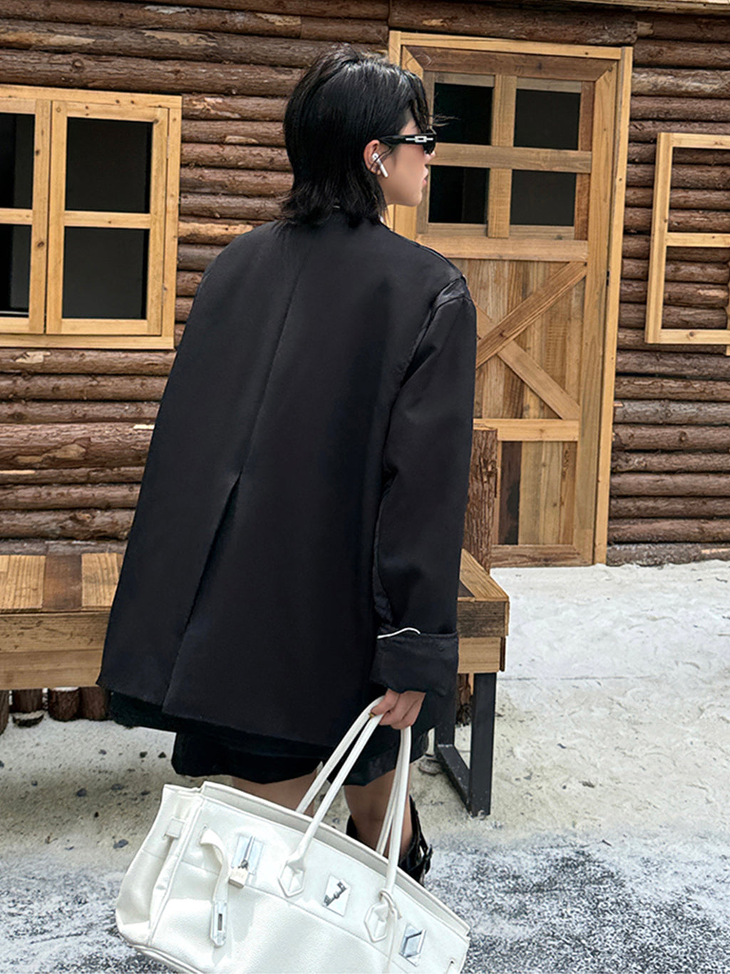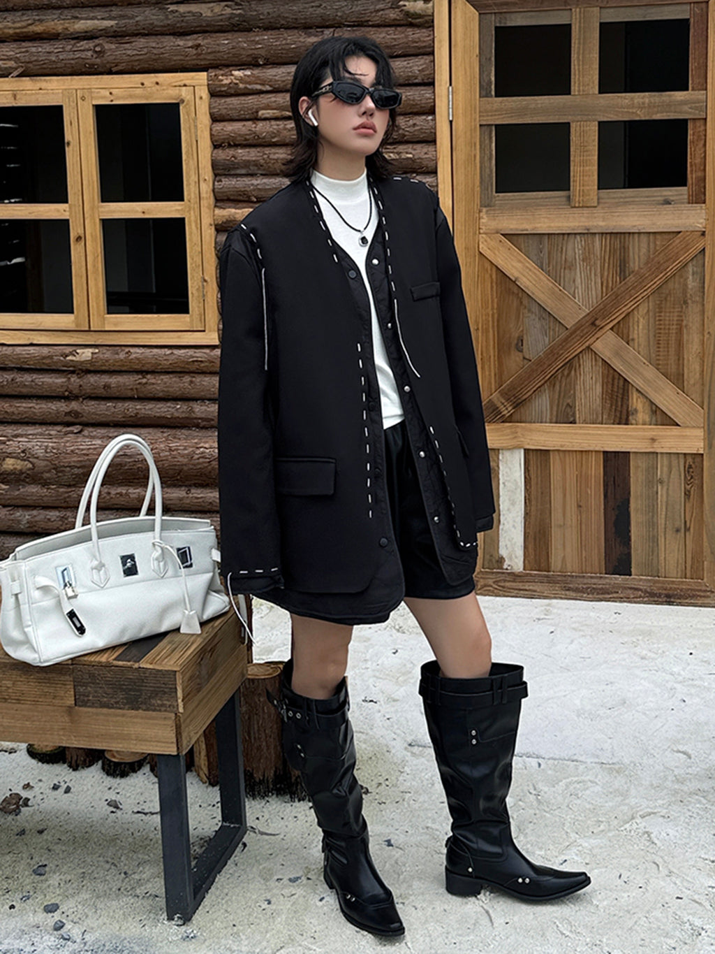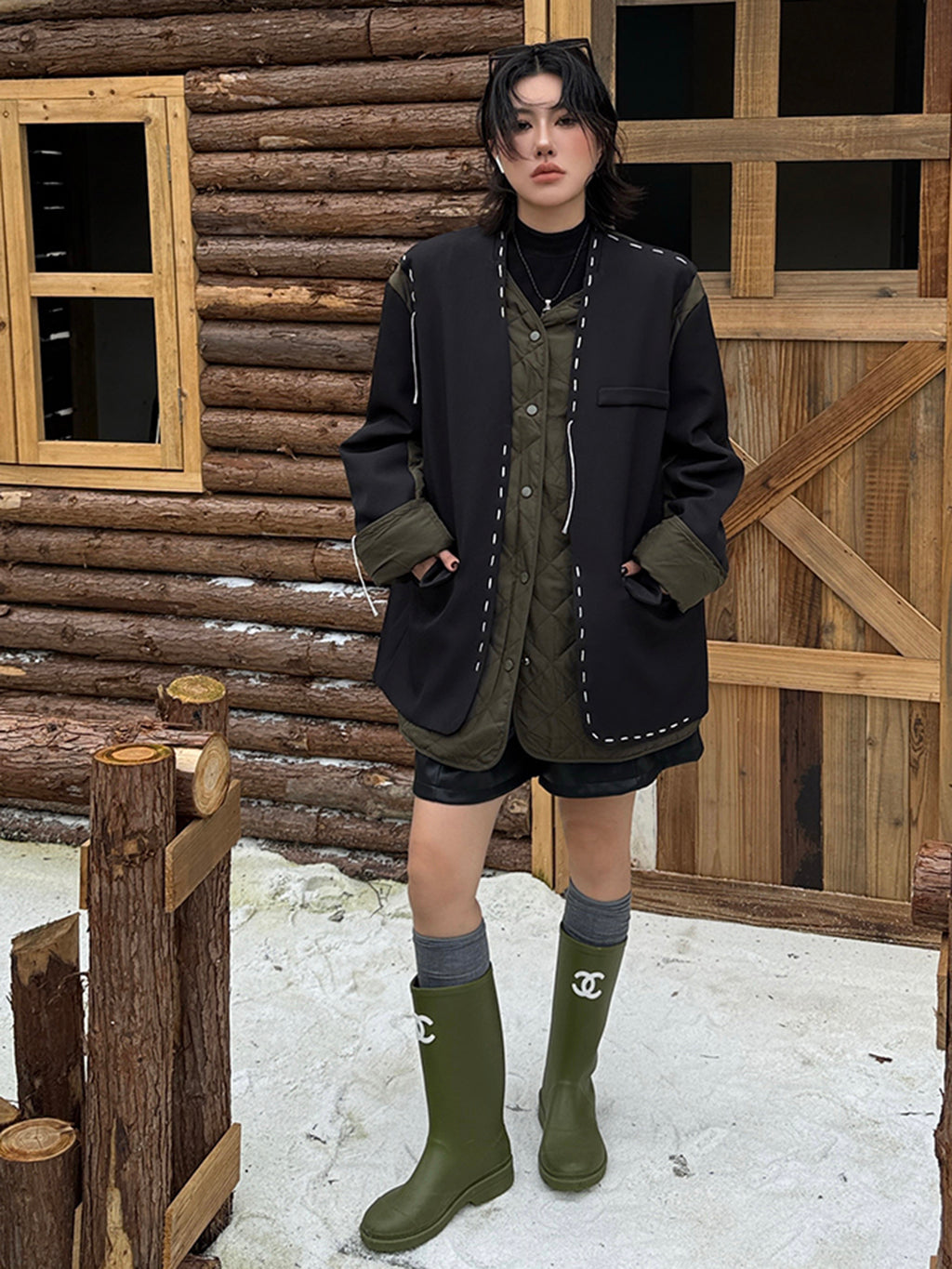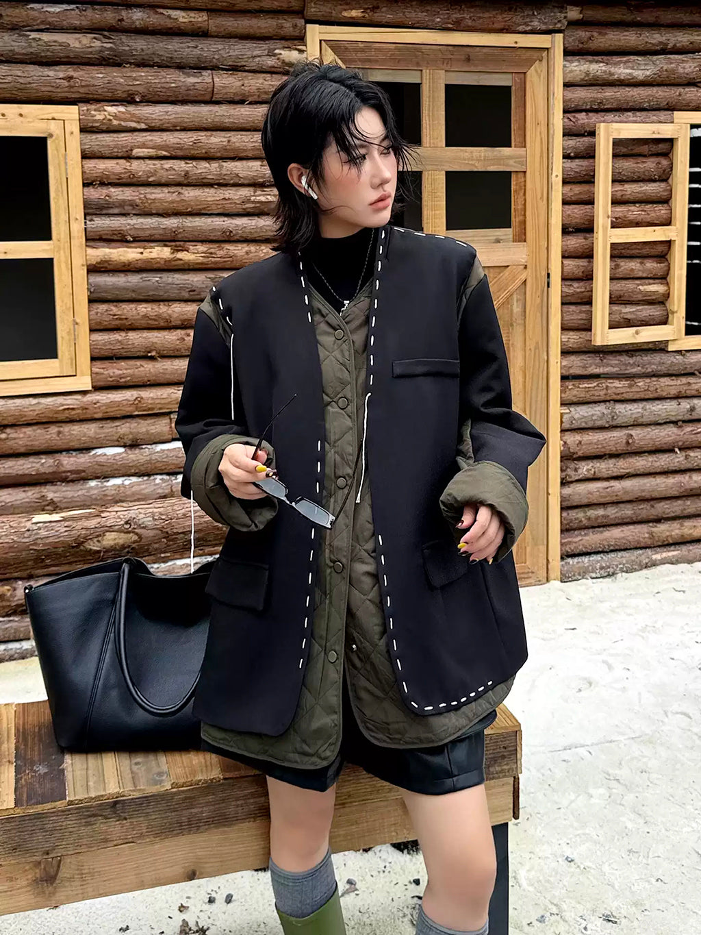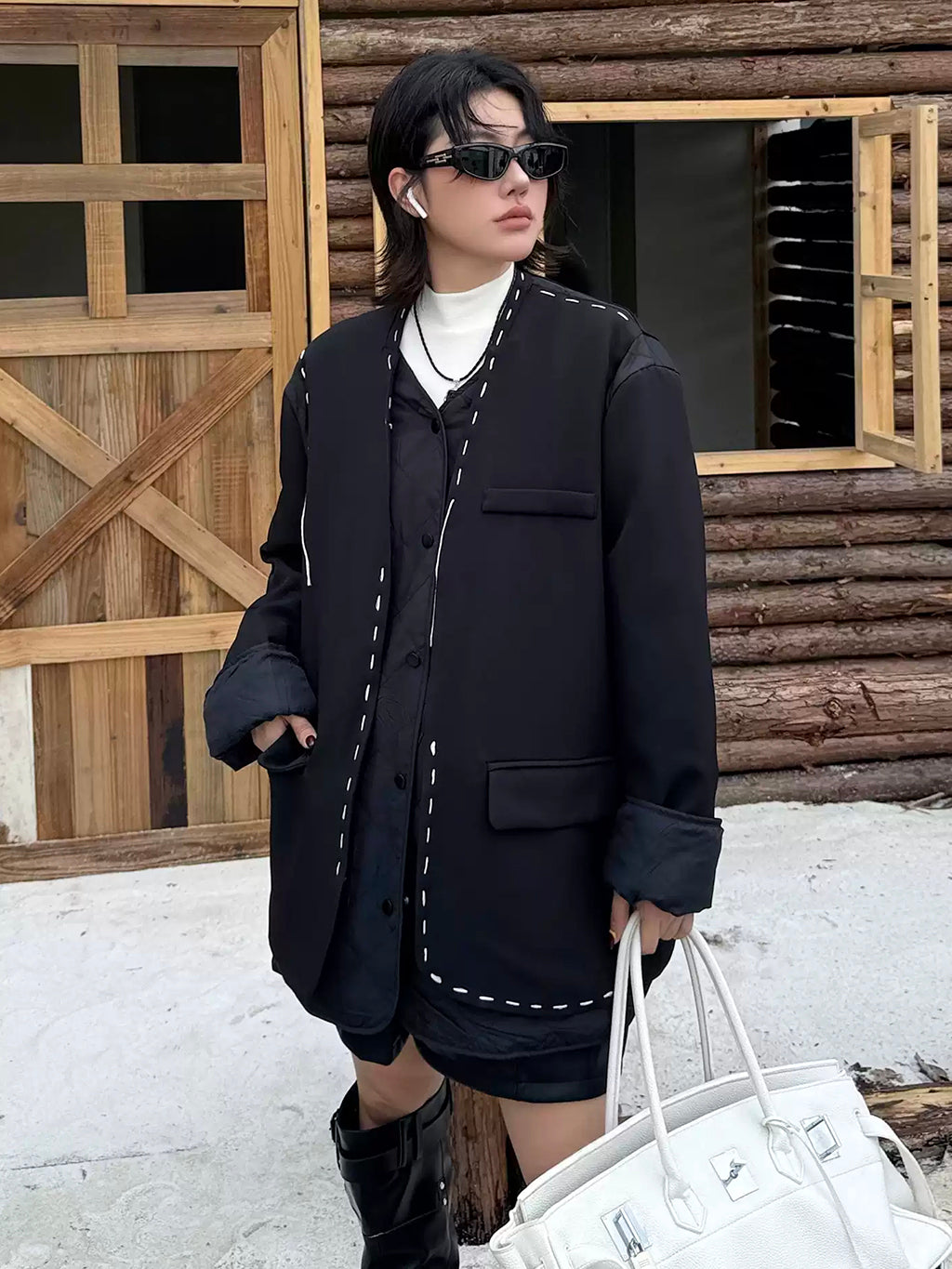 ゆったりとしたシルエットにドロップショルダーを組み合わせたノーカラージャケット。前立てと裾、ポケット縁には大きめステッチのような装飾を施し、シンプルながら視線を引きつけるデザインに仕上げた。袖と身頃には異素材を切り替えて構築的な立体感を演出。中綿入りのキルティングが内側から覗くことで、温かみと奥行きを加える。ヒップを覆う程よい丈感で、軽やかながら季節の変わり目にも重宝する。