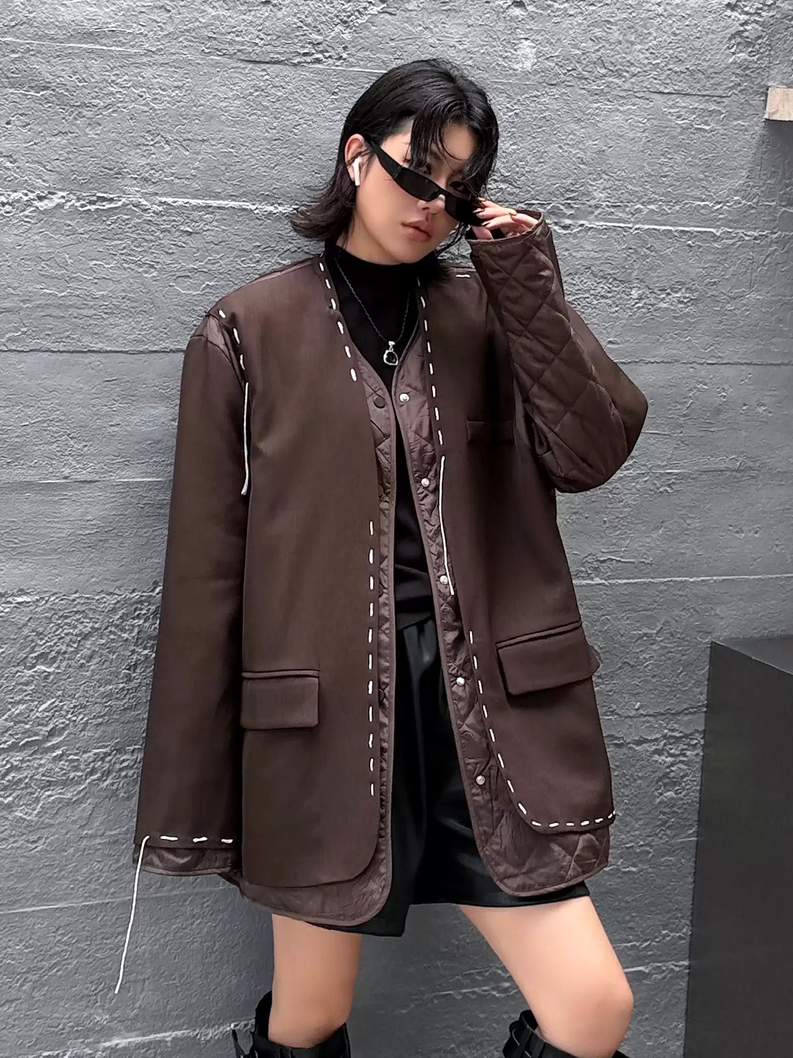 ゆったりとしたシルエットにドロップショルダーを組み合わせたノーカラージャケット。前立てと裾、ポケット縁には大きめステッチのような装飾を施し、シンプルながら視線を引きつけるデザインに仕上げた。袖と身頃には異素材を切り替えて構築的な立体感を演出。中綿入りのキルティングが内側から覗くことで、温かみと奥行きを加える。ヒップを覆う程よい丈感で、軽やかながら季節の変わり目にも重宝する。