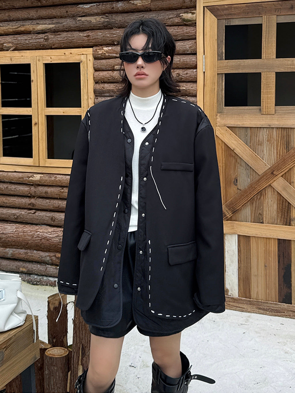 ゆったりとしたシルエットにドロップショルダーを組み合わせたノーカラージャケット。前立てと裾、ポケット縁には大きめステッチのような装飾を施し、シンプルながら視線を引きつけるデザインに仕上げた。袖と身頃には異素材を切り替えて構築的な立体感を演出。中綿入りのキルティングが内側から覗くことで、温かみと奥行きを加える。ヒップを覆う程よい丈感で、軽やかながら季節の変わり目にも重宝する。