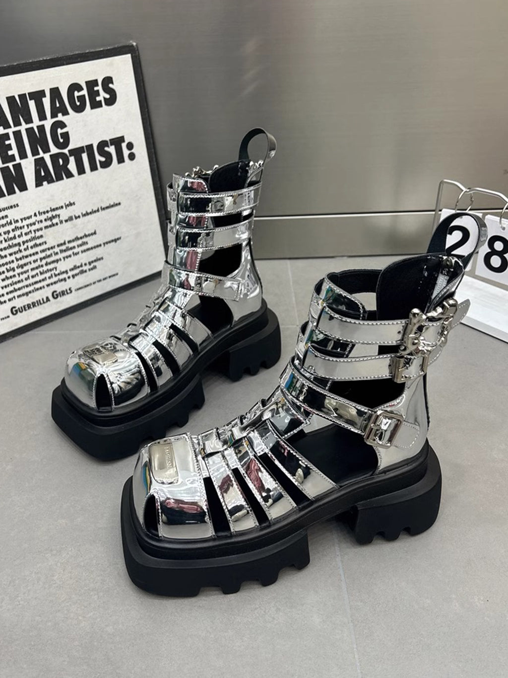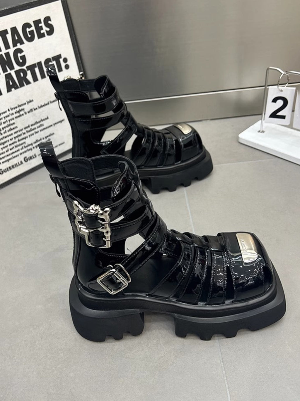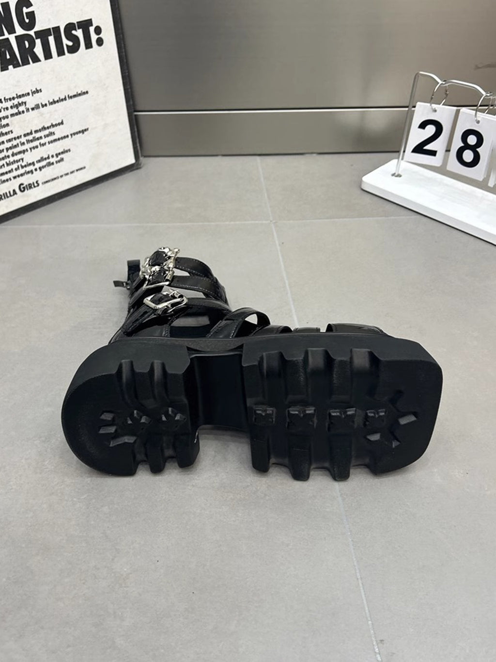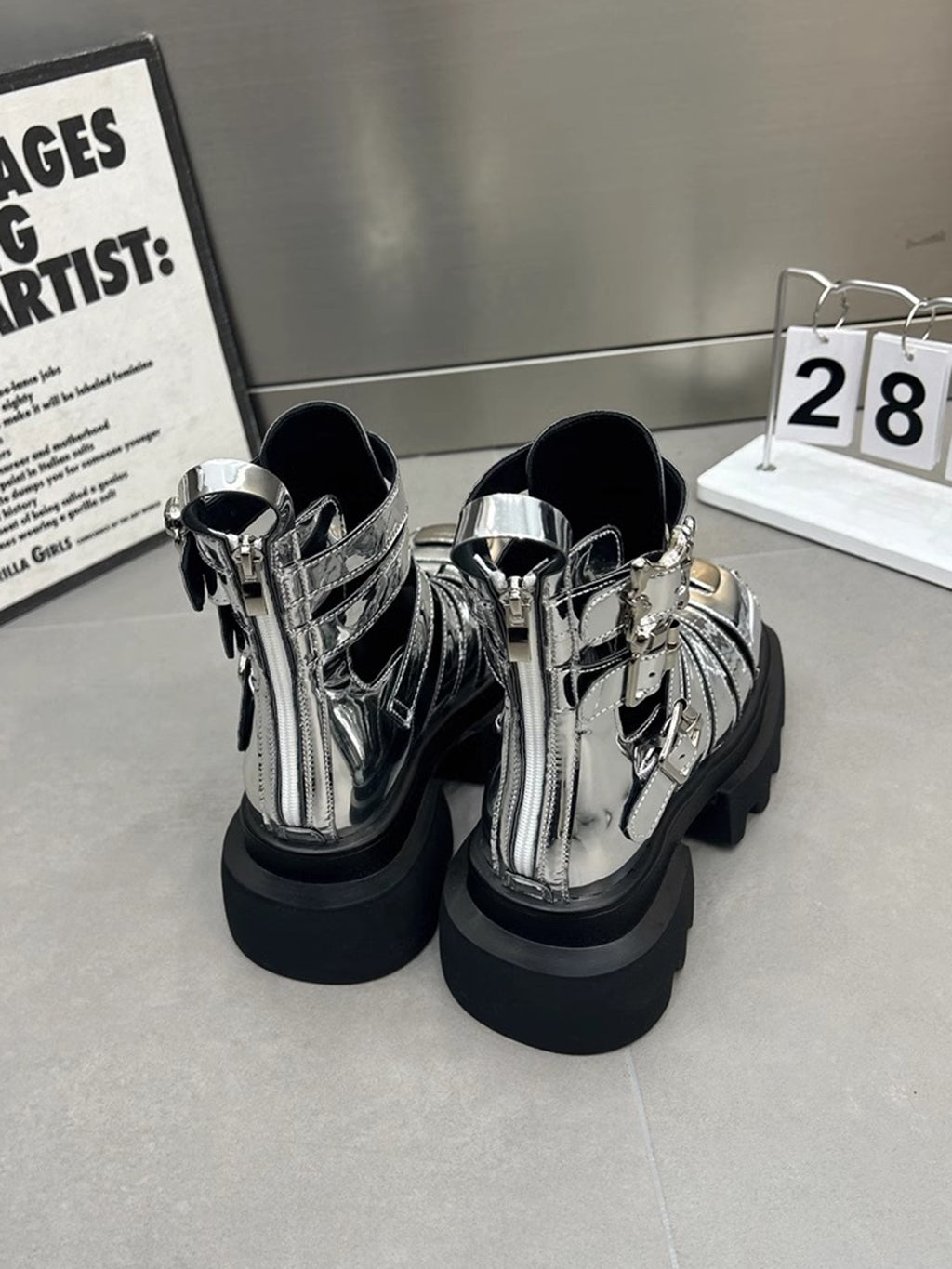 重厚なアウトソールと複数のバックルストラップを組み合わせたグラディエーターデザインのシューズ。メタルディテールがアクセントとなり、ブラックとシルバーの艶感が都会的な雰囲気を演出。足元に強さを加えるボリューム感が魅力で、カジュアルからモードまで幅広いコーディネートを引き立てる。