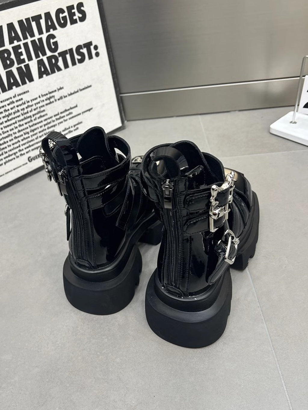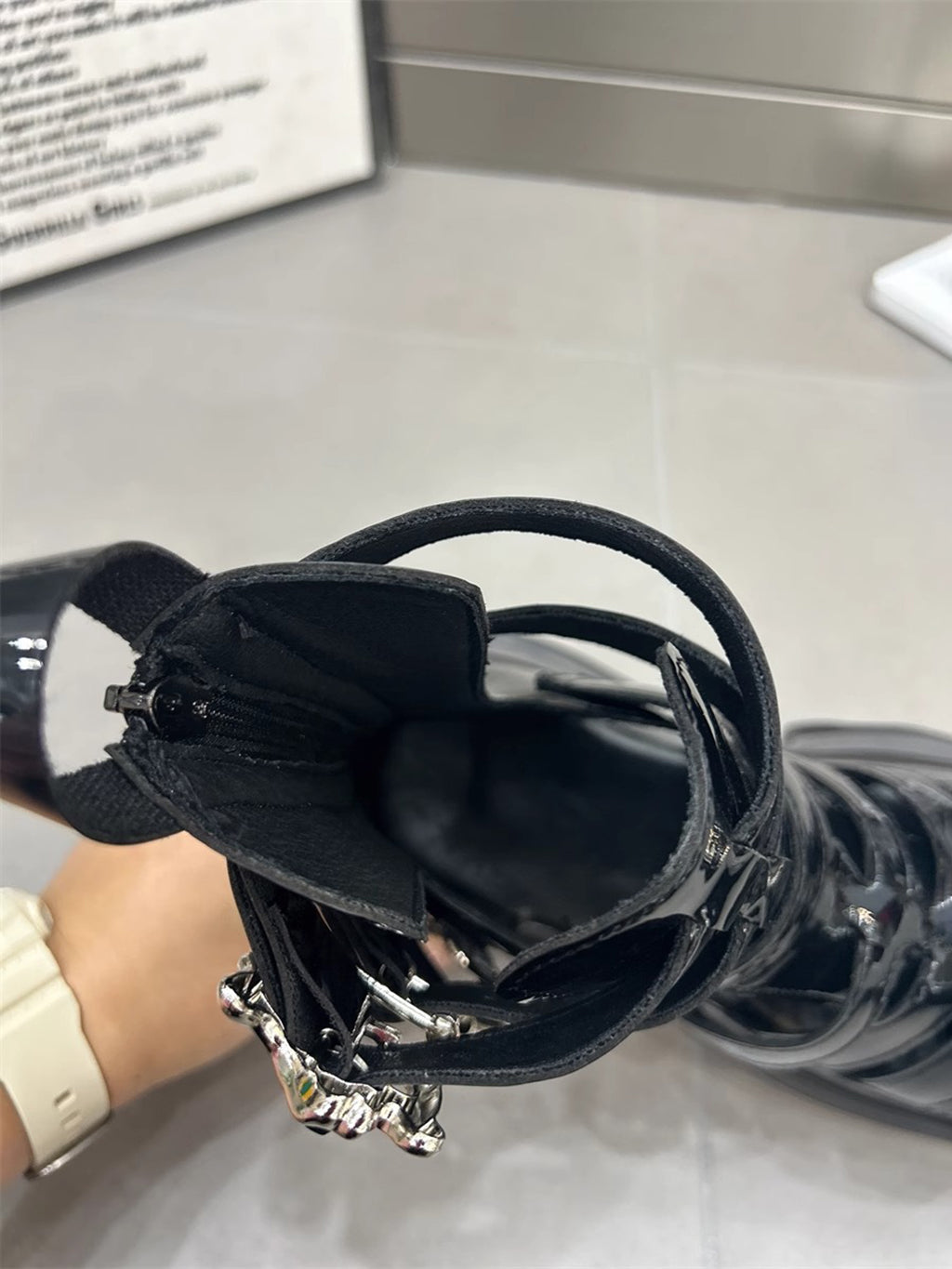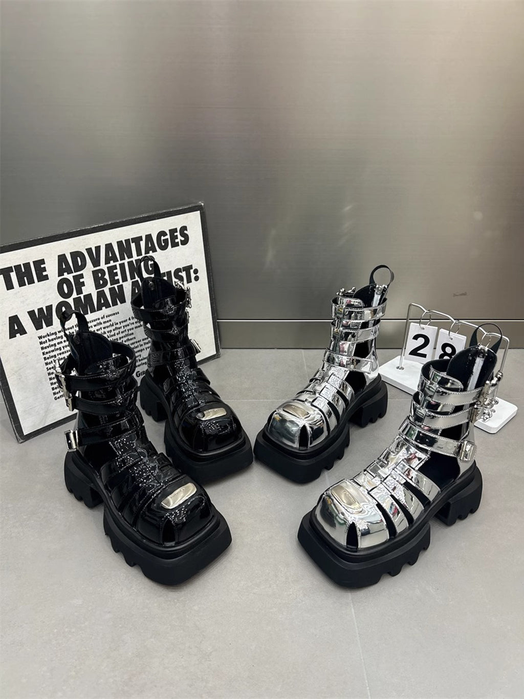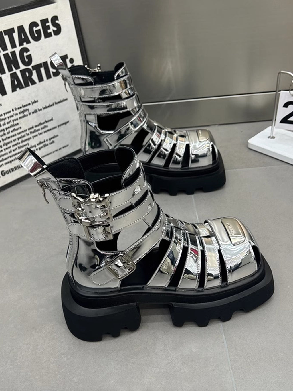 重厚なアウトソールと複数のバックルストラップを組み合わせたグラディエーターデザインのシューズ。メタルディテールがアクセントとなり、ブラックとシルバーの艶感が都会的な雰囲気を演出。足元に強さを加えるボリューム感が魅力で、カジュアルからモードまで幅広いコーディネートを引き立てる。