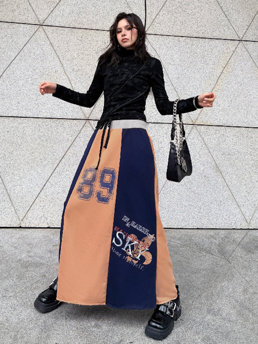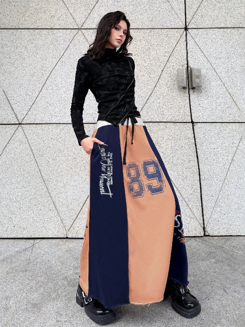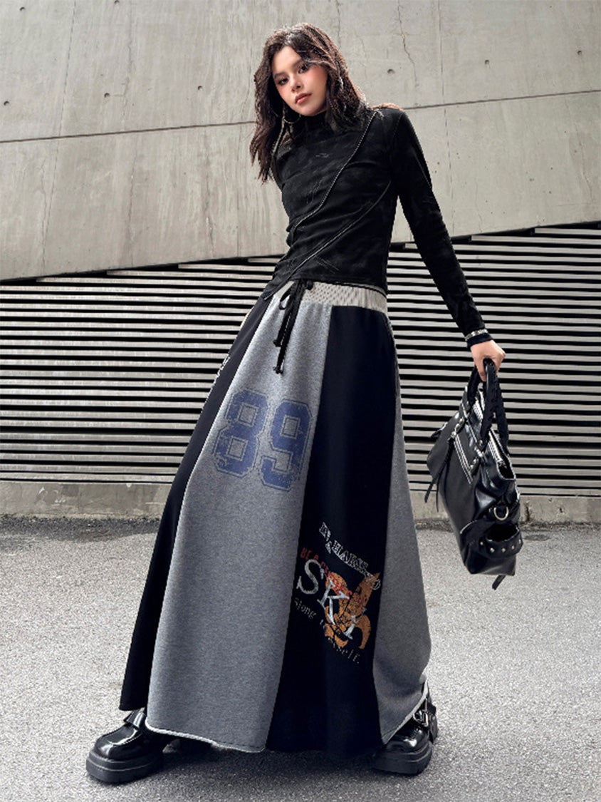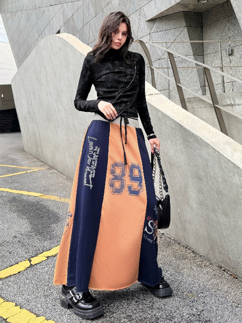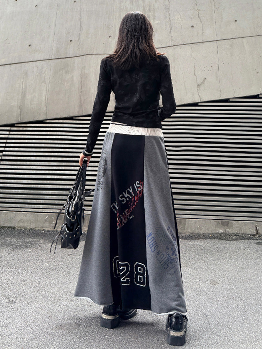 ダークトーンのブラッシュパターンを配したトップスは、斜めラインを描く立体カッティングが特徴的なシルエット。組み合わされるロングスカートは複数のパネルを組み合わせた構造で、ナンバーグラフィックやタイポプリントが大胆に配置される。ドローコード仕様のウエストと広がるフレアラインがストリートムードを強め、動きの中で配色ブロックが印象的な表情を作るシリーズ構成。