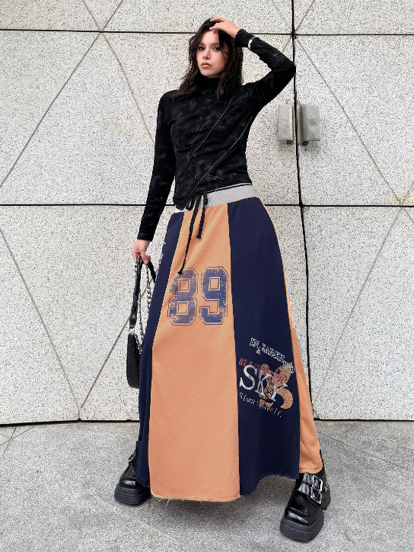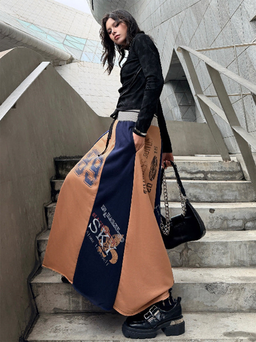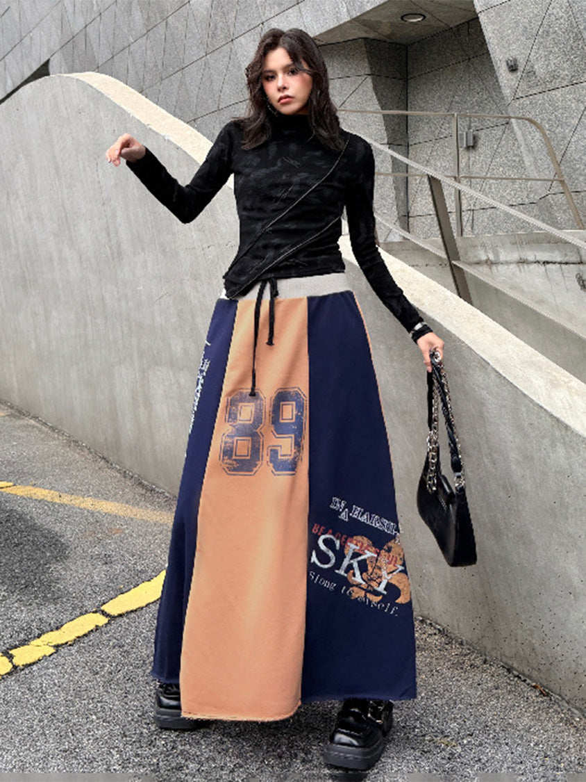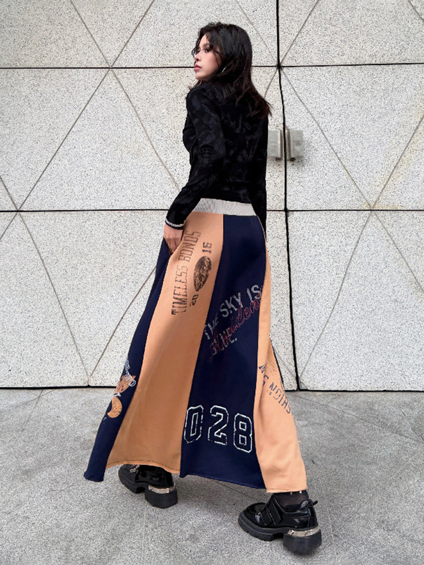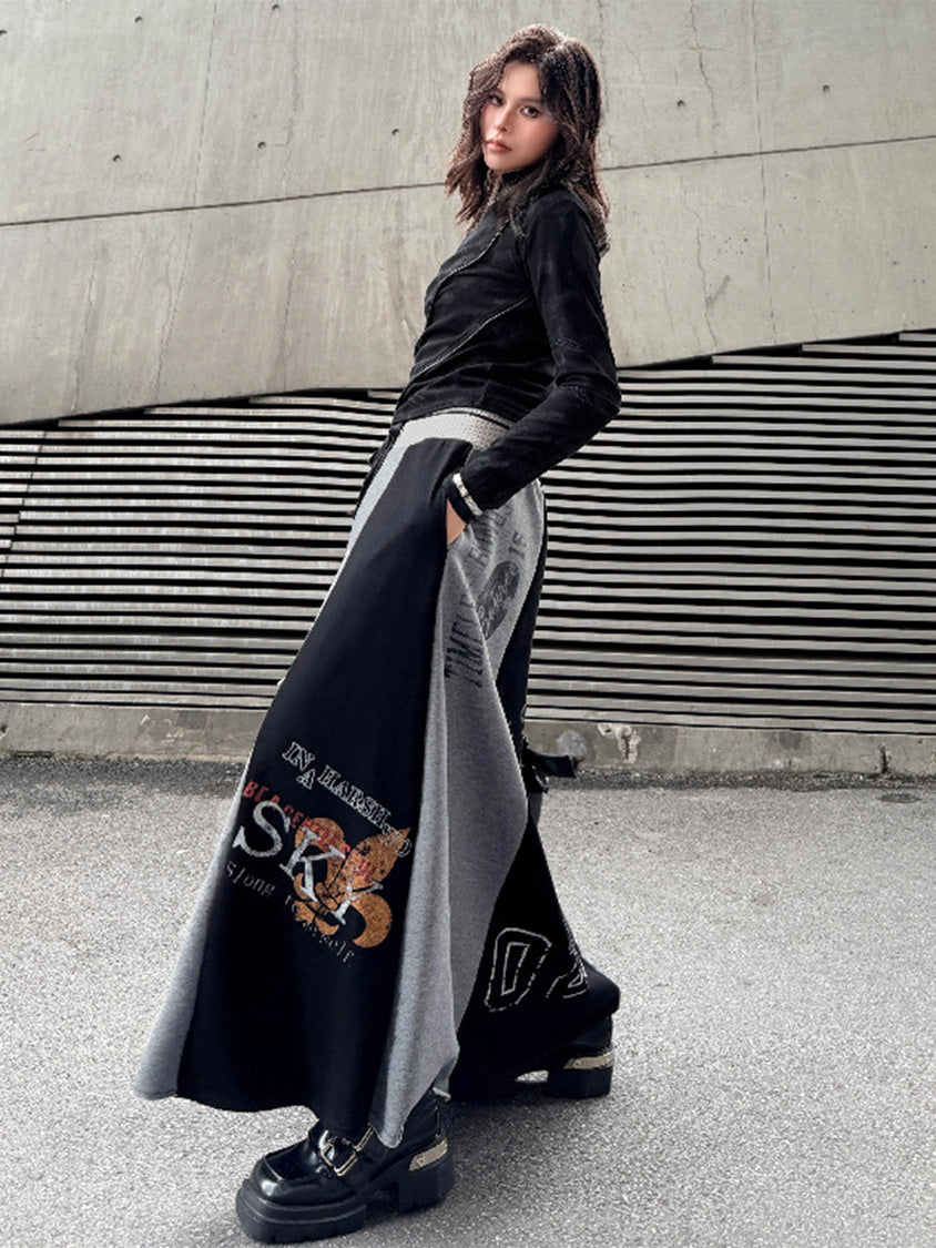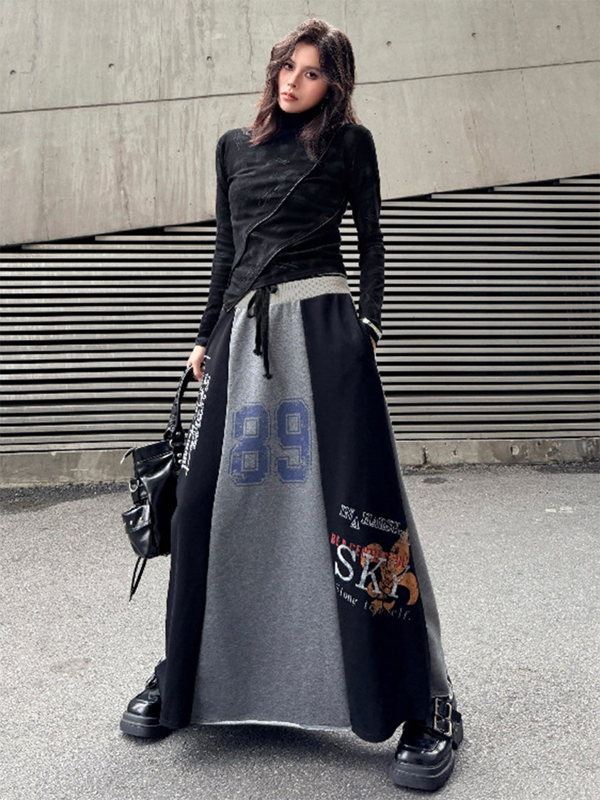 ダークトーンのブラッシュパターンを配したトップスは、斜めラインを描く立体カッティングが特徴的なシルエット。組み合わされるロングスカートは複数のパネルを組み合わせた構造で、ナンバーグラフィックやタイポプリントが大胆に配置される。ドローコード仕様のウエストと広がるフレアラインがストリートムードを強め、動きの中で配色ブロックが印象的な表情を作るシリーズ構成。