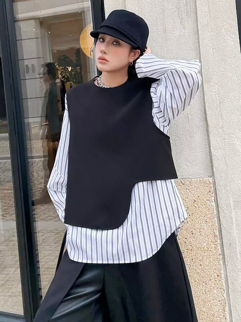 無地のトップラインにストライプスリーブを重ねた構築的レイヤード構成。フロントは滑らかな曲線カットで陰影を描き、視線を縦方向へ導く造形。袖部分にはピッチの揃ったストライプを配し、量感あるフォルムが動作にリズムを与える。モード感を強めるミニマルな面構成と、シャツ構造を想起させる切り替えにより、都会的で引き締まった空気を纏う。