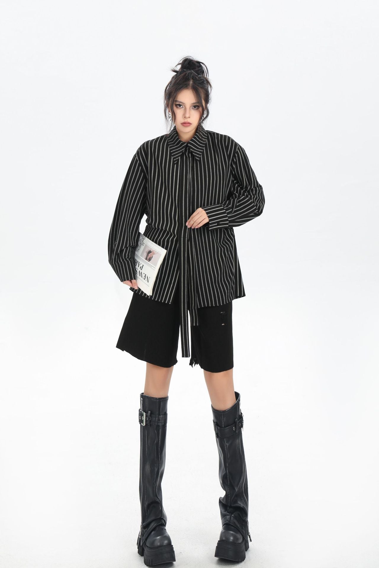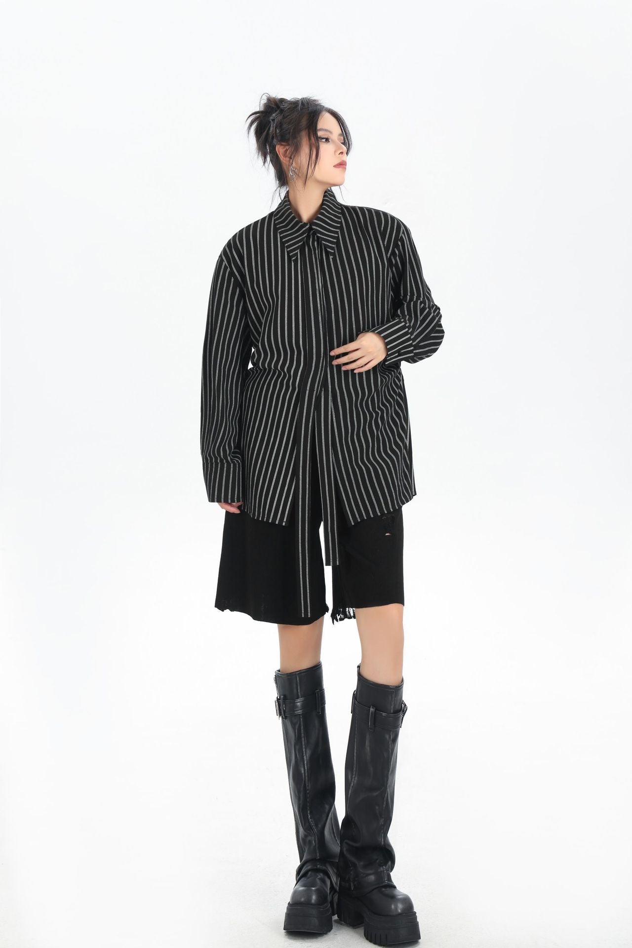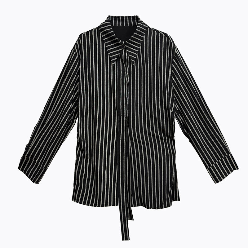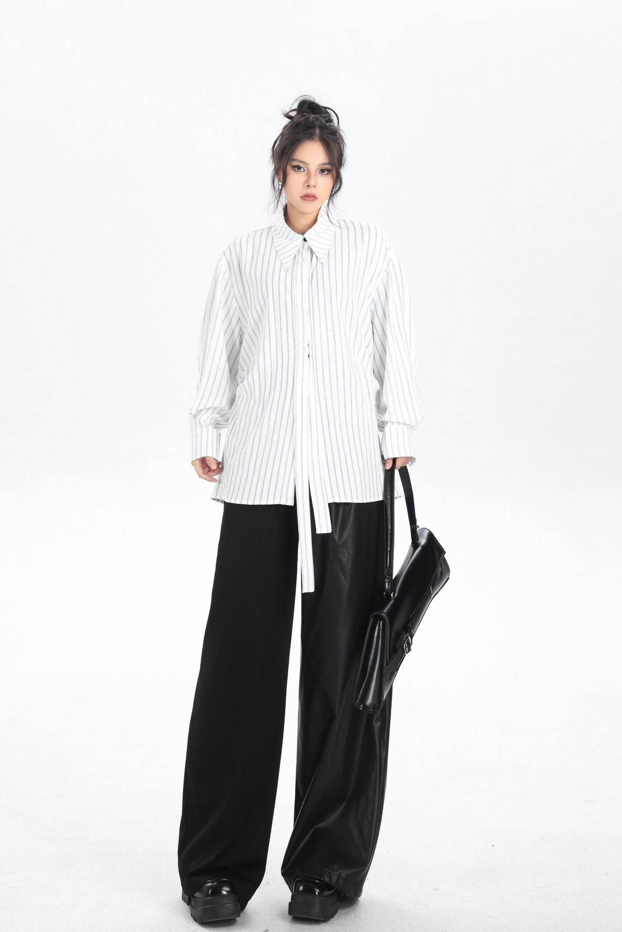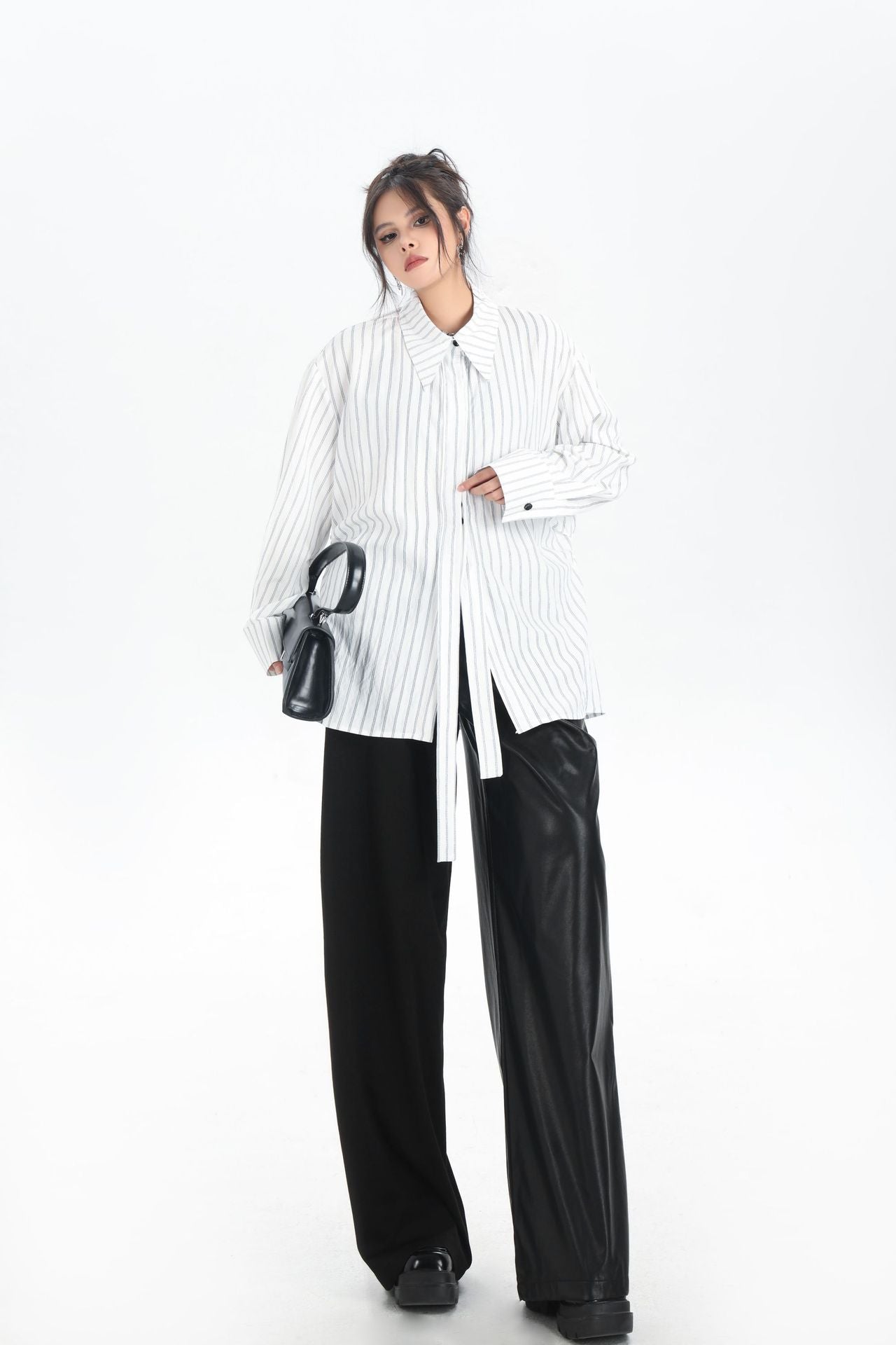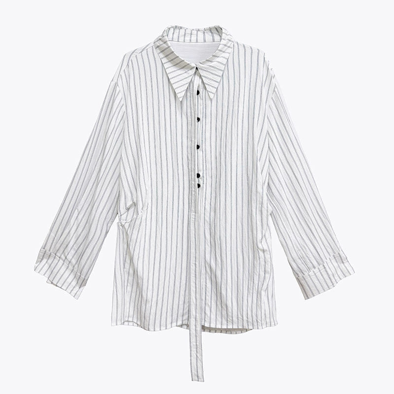 シャープな縦ストライプと程よくゆとりのあるルーズシルエットが印象的なドロップショルダーシャツ。大きめにとられた襟と、胸元から裾にかけて垂れる細リボンがアクセントになり、着こなしに動きをもたらす。両袖にはカフスディテールを施し、全体の印象を引き締めている。しなやかで通気性のあるコットンリネンの素材感が、見た目にも軽やかな仕上がり。パンツともスカートとも相性がよく、レイヤードにも重宝する。