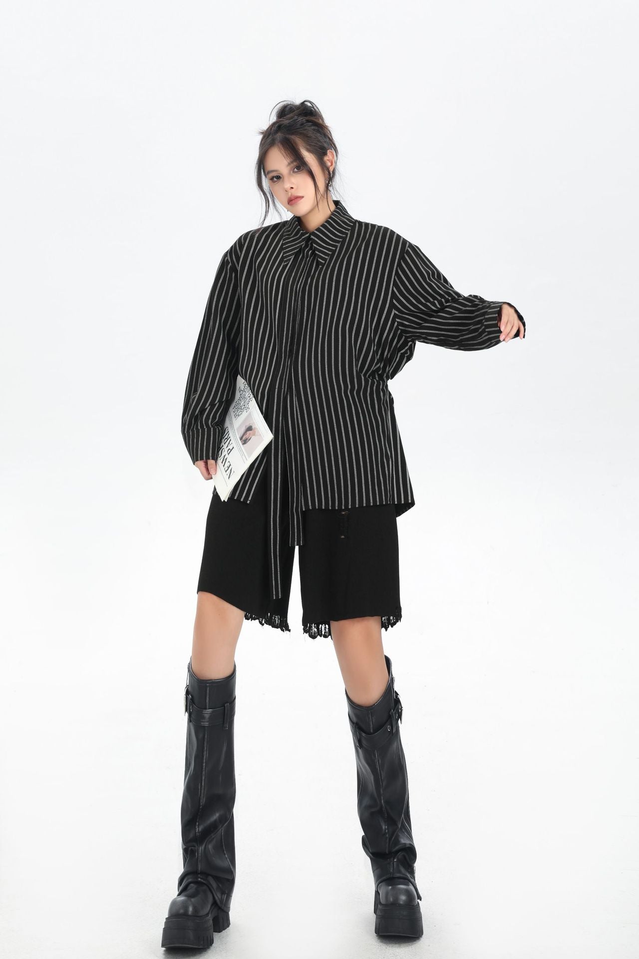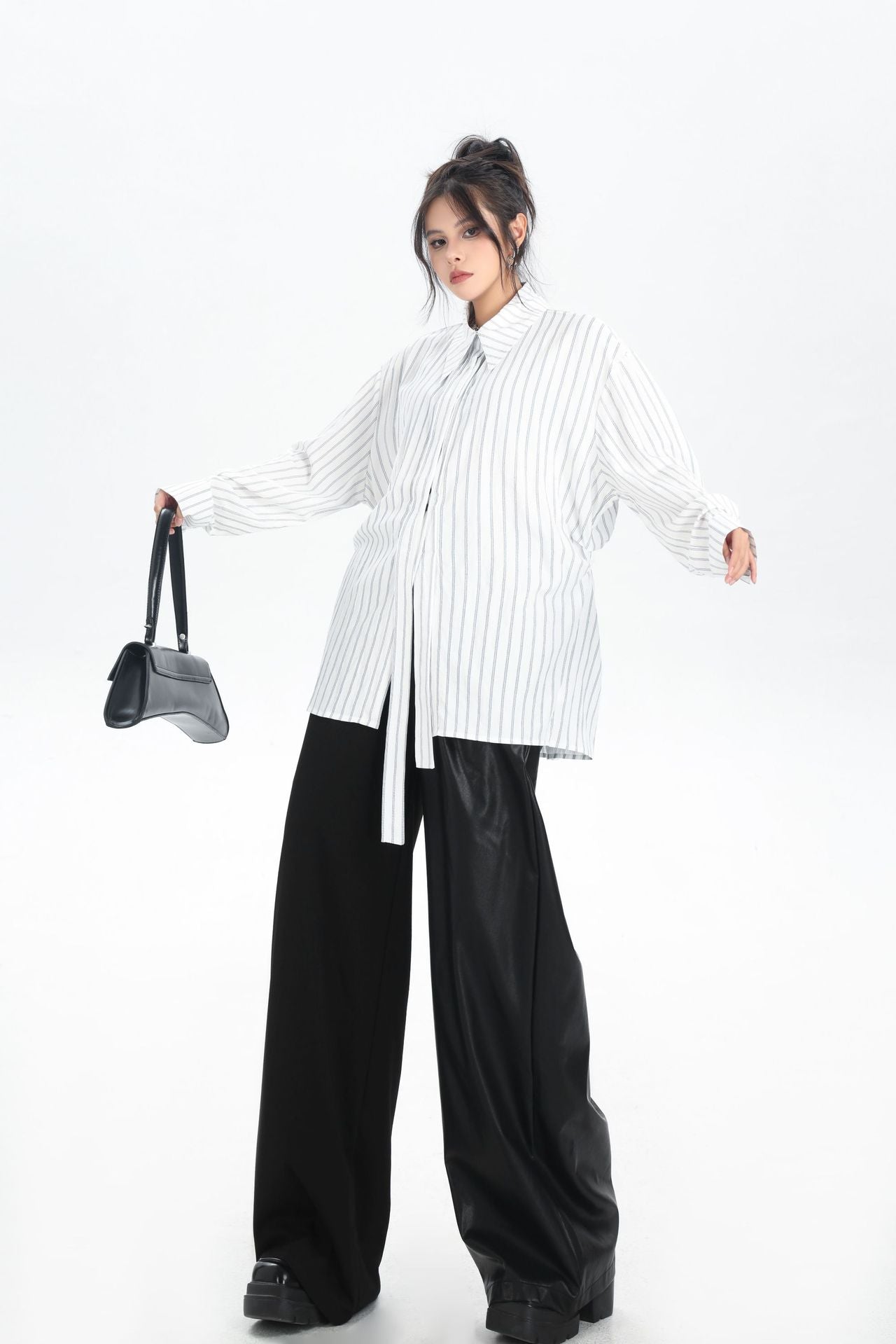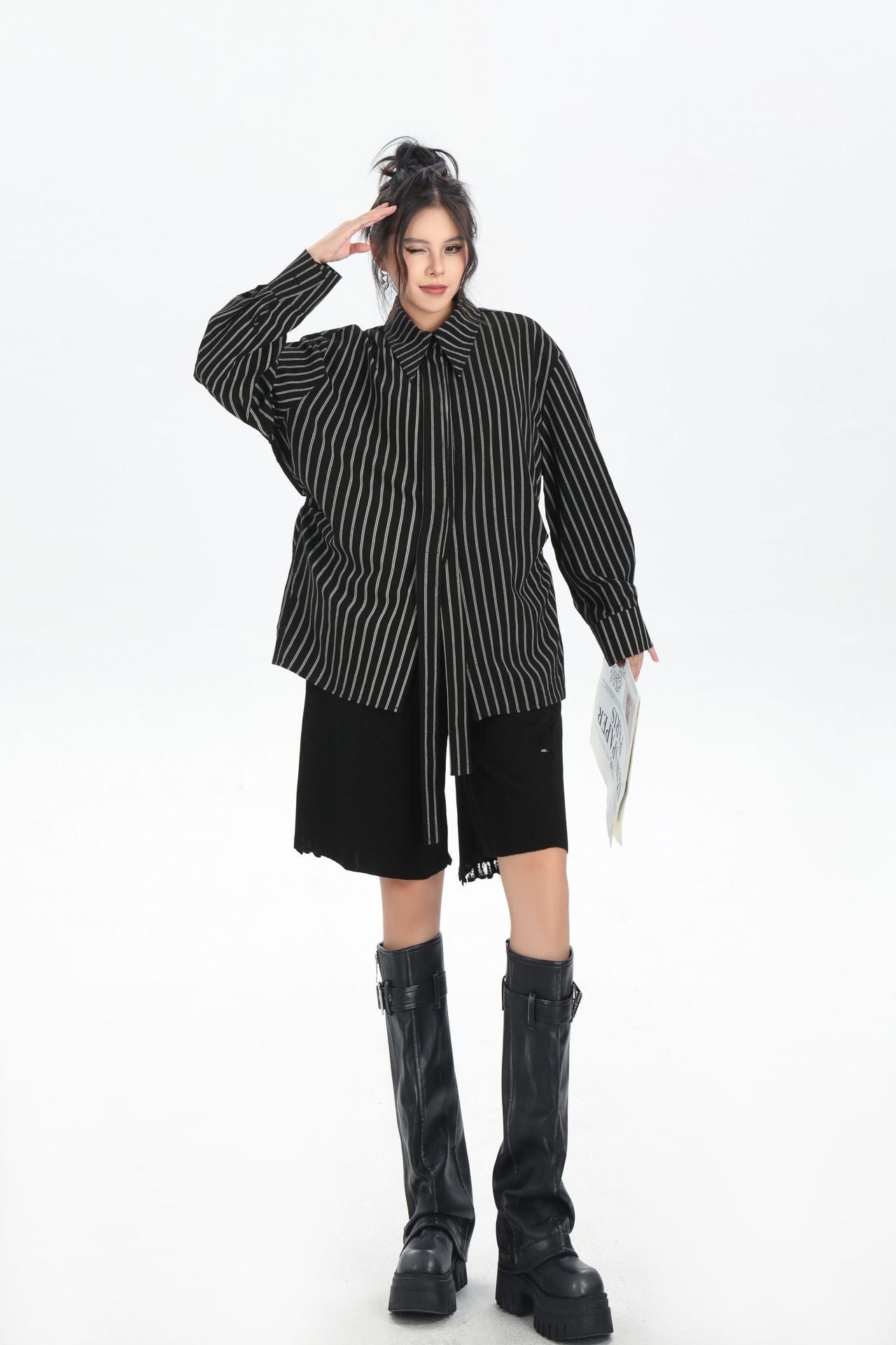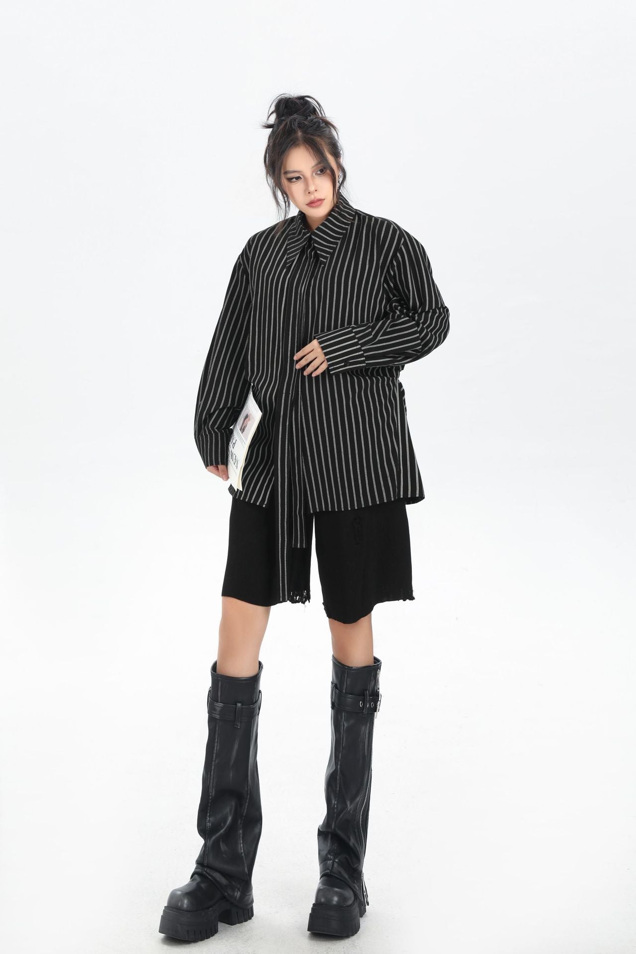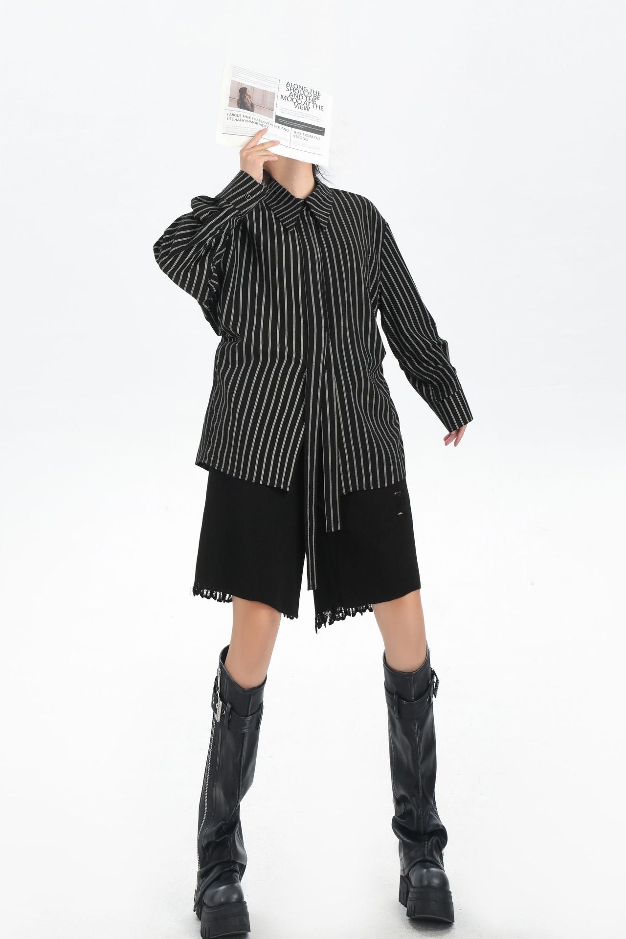 シャープな縦ストライプと程よくゆとりのあるルーズシルエットが印象的なドロップショルダーシャツ。大きめにとられた襟と、胸元から裾にかけて垂れる細リボンがアクセントになり、着こなしに動きをもたらす。両袖にはカフスディテールを施し、全体の印象を引き締めている。しなやかで通気性のあるコットンリネンの素材感が、見た目にも軽やかな仕上がり。パンツともスカートとも相性がよく、レイヤードにも重宝する。