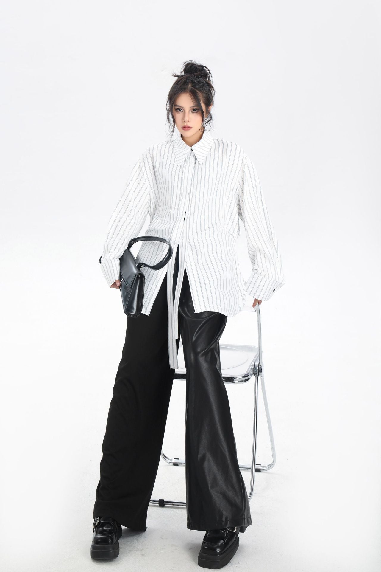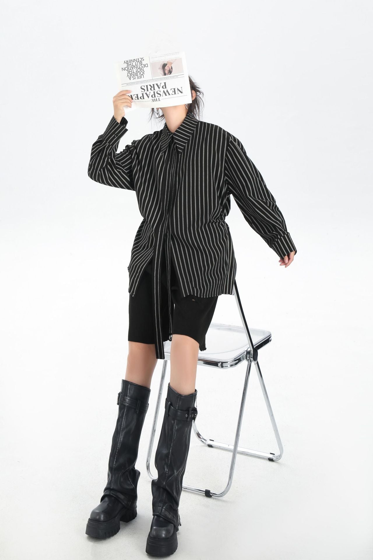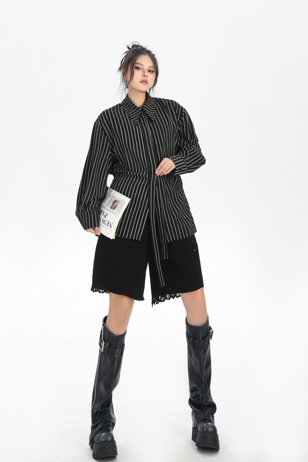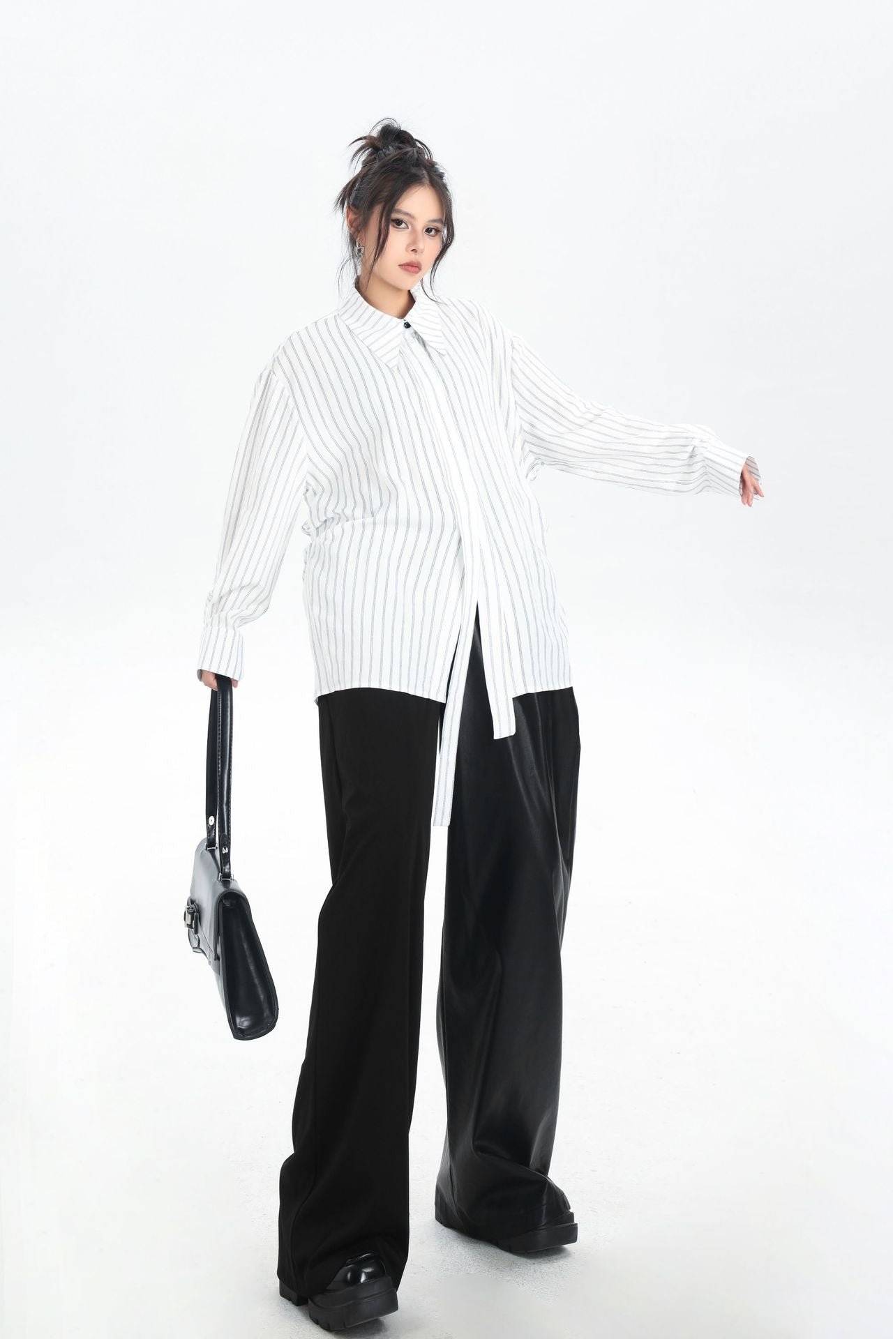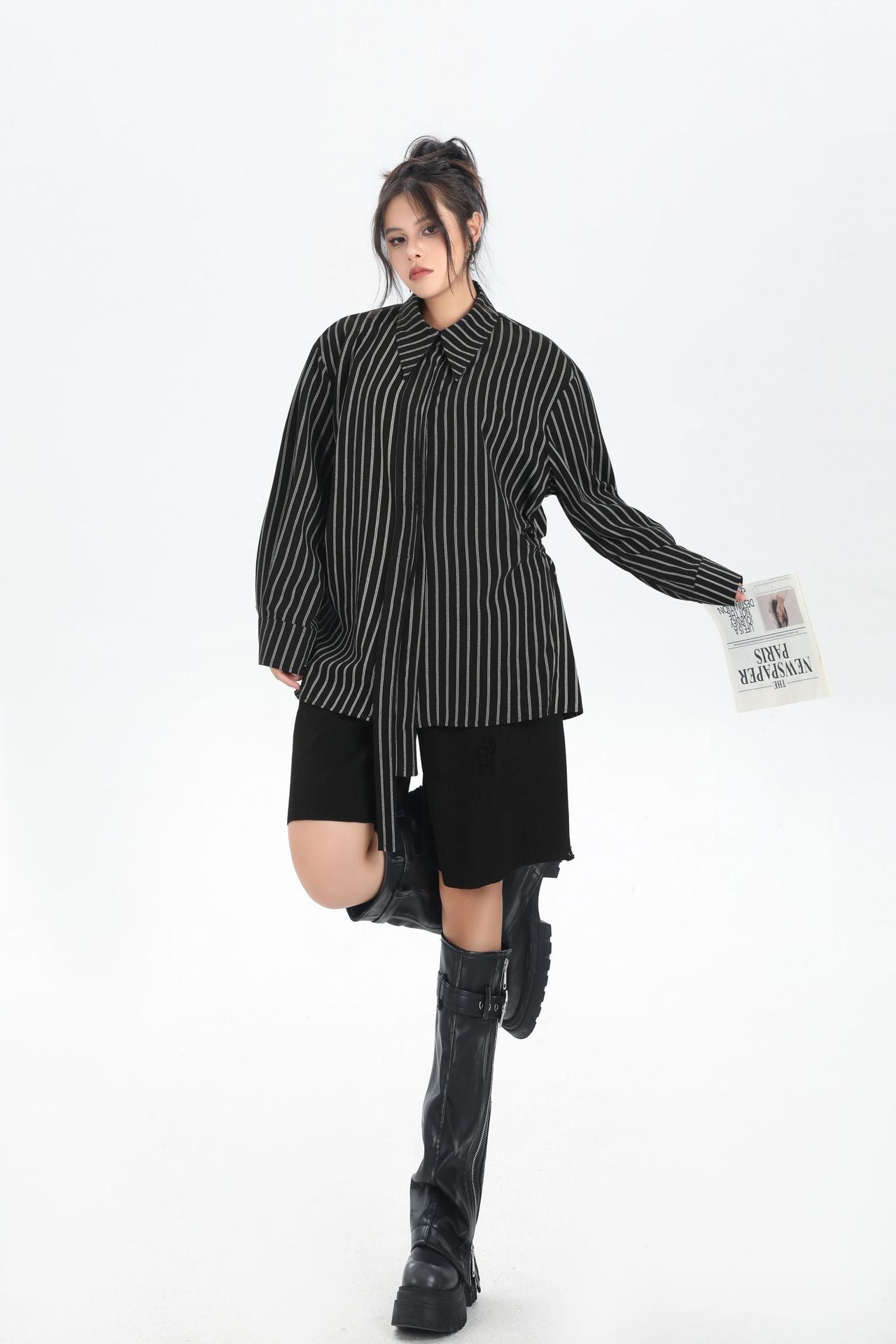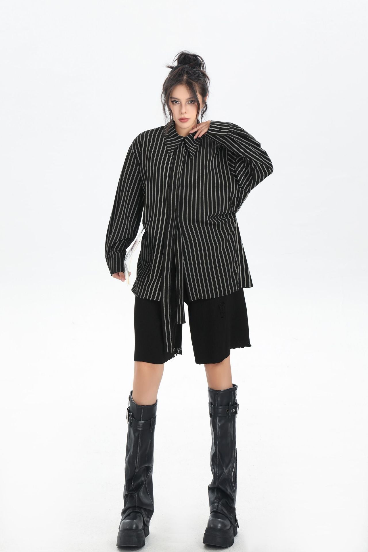 シャープな縦ストライプと程よくゆとりのあるルーズシルエットが印象的なドロップショルダーシャツ。大きめにとられた襟と、胸元から裾にかけて垂れる細リボンがアクセントになり、着こなしに動きをもたらす。両袖にはカフスディテールを施し、全体の印象を引き締めている。しなやかで通気性のあるコットンリネンの素材感が、見た目にも軽やかな仕上がり。パンツともスカートとも相性がよく、レイヤードにも重宝する。