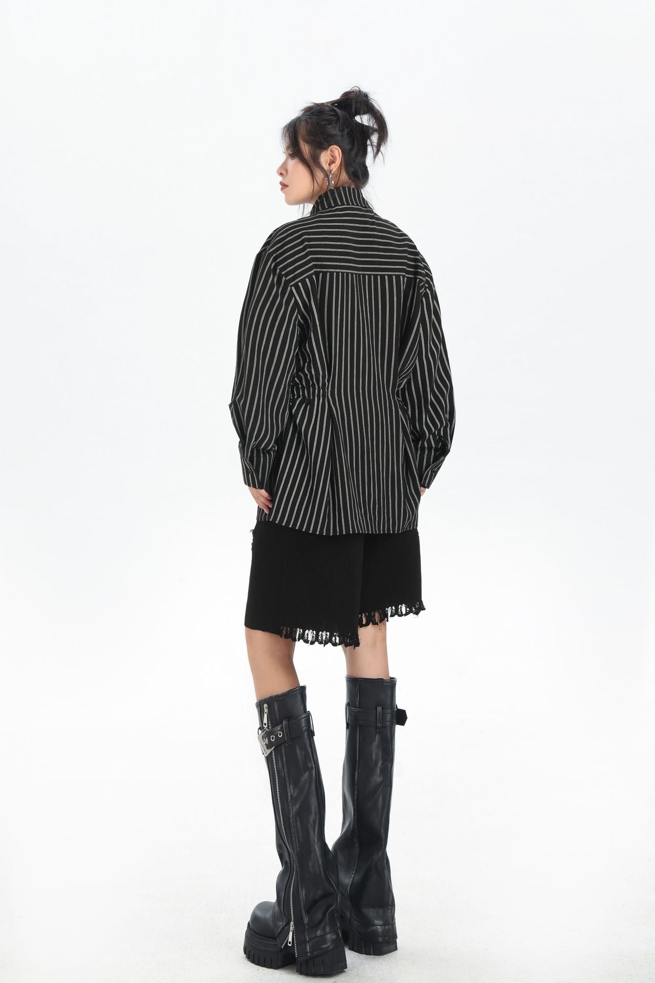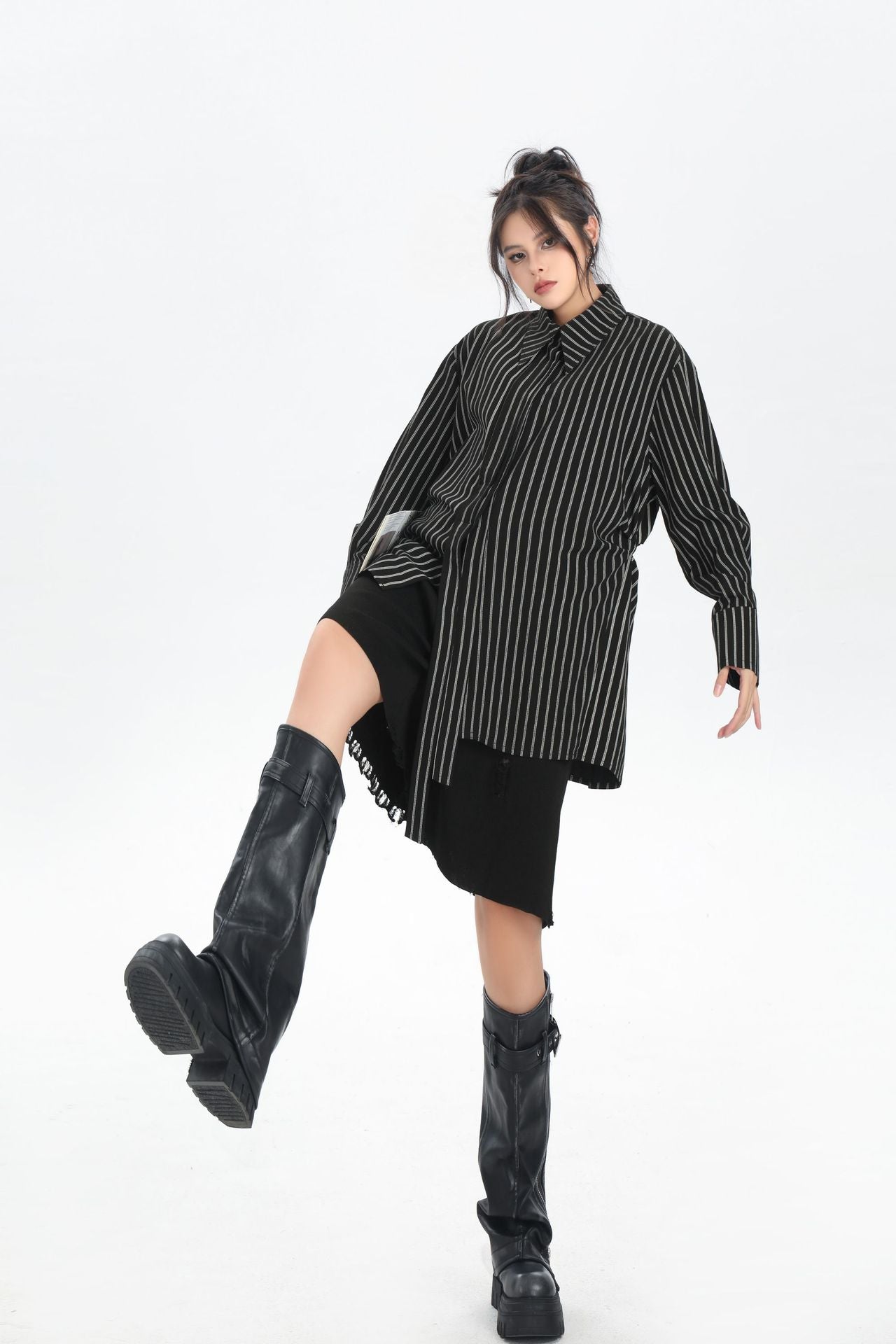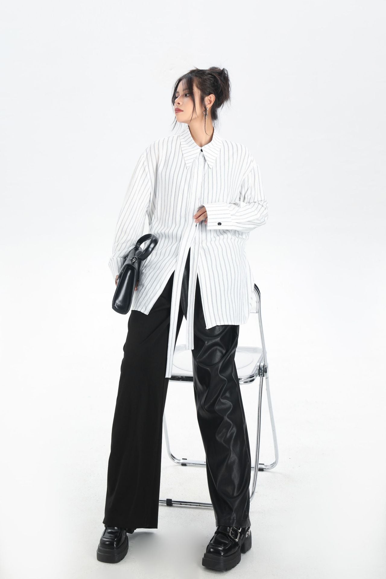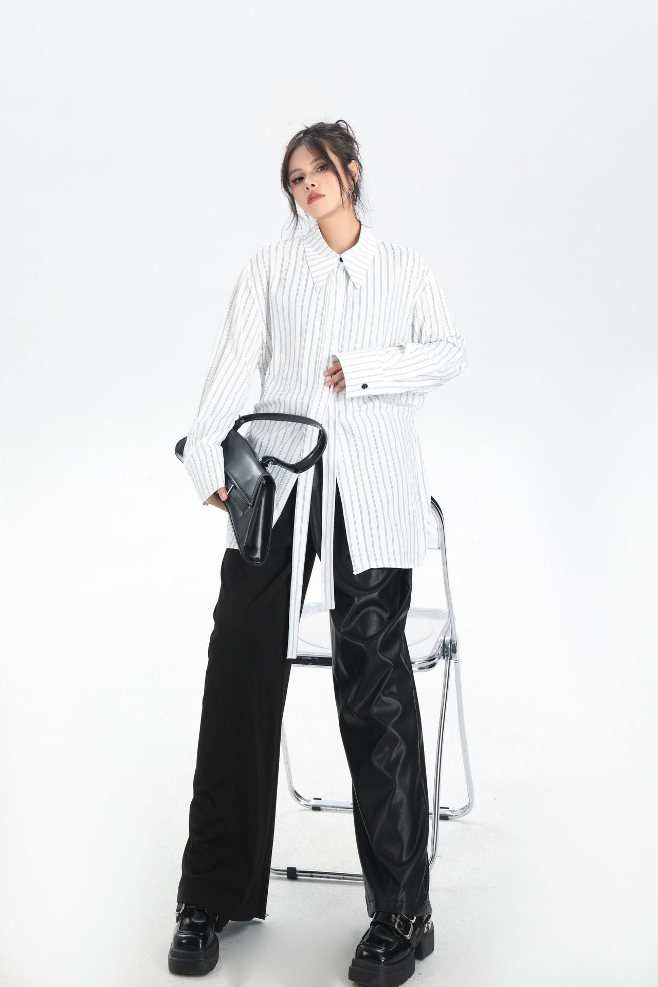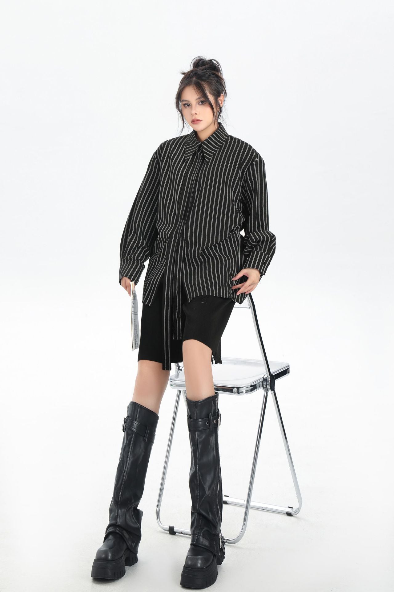 シャープな縦ストライプと程よくゆとりのあるルーズシルエットが印象的なドロップショルダーシャツ。大きめにとられた襟と、胸元から裾にかけて垂れる細リボンがアクセントになり、着こなしに動きをもたらす。両袖にはカフスディテールを施し、全体の印象を引き締めている。しなやかで通気性のあるコットンリネンの素材感が、見た目にも軽やかな仕上がり。パンツともスカートとも相性がよく、レイヤードにも重宝する。