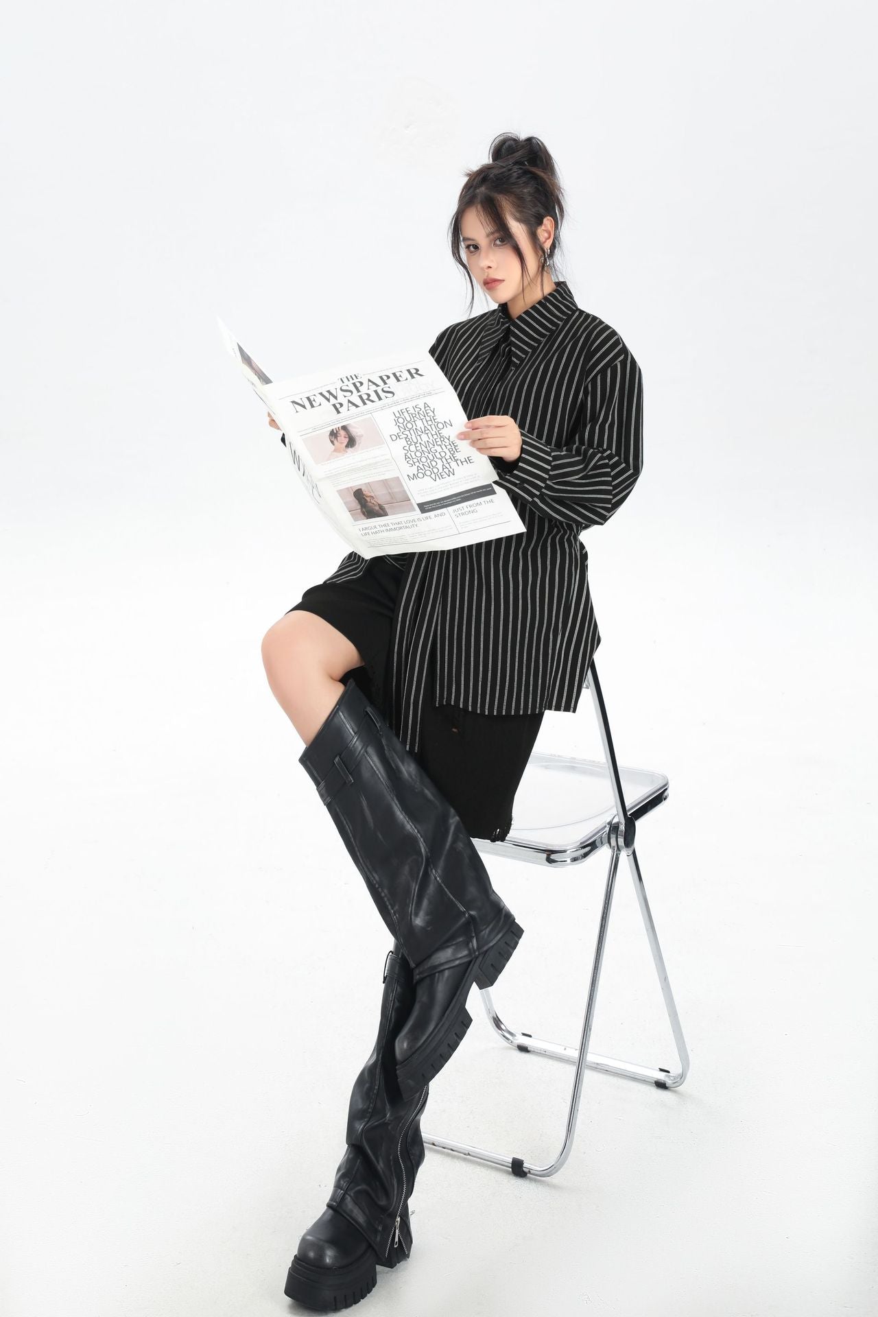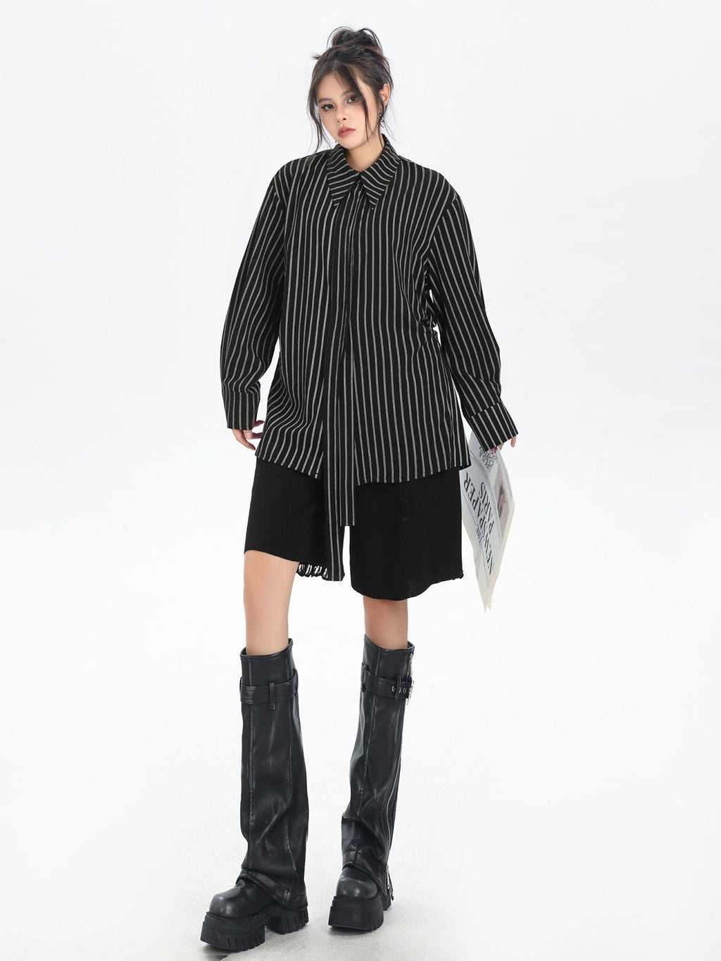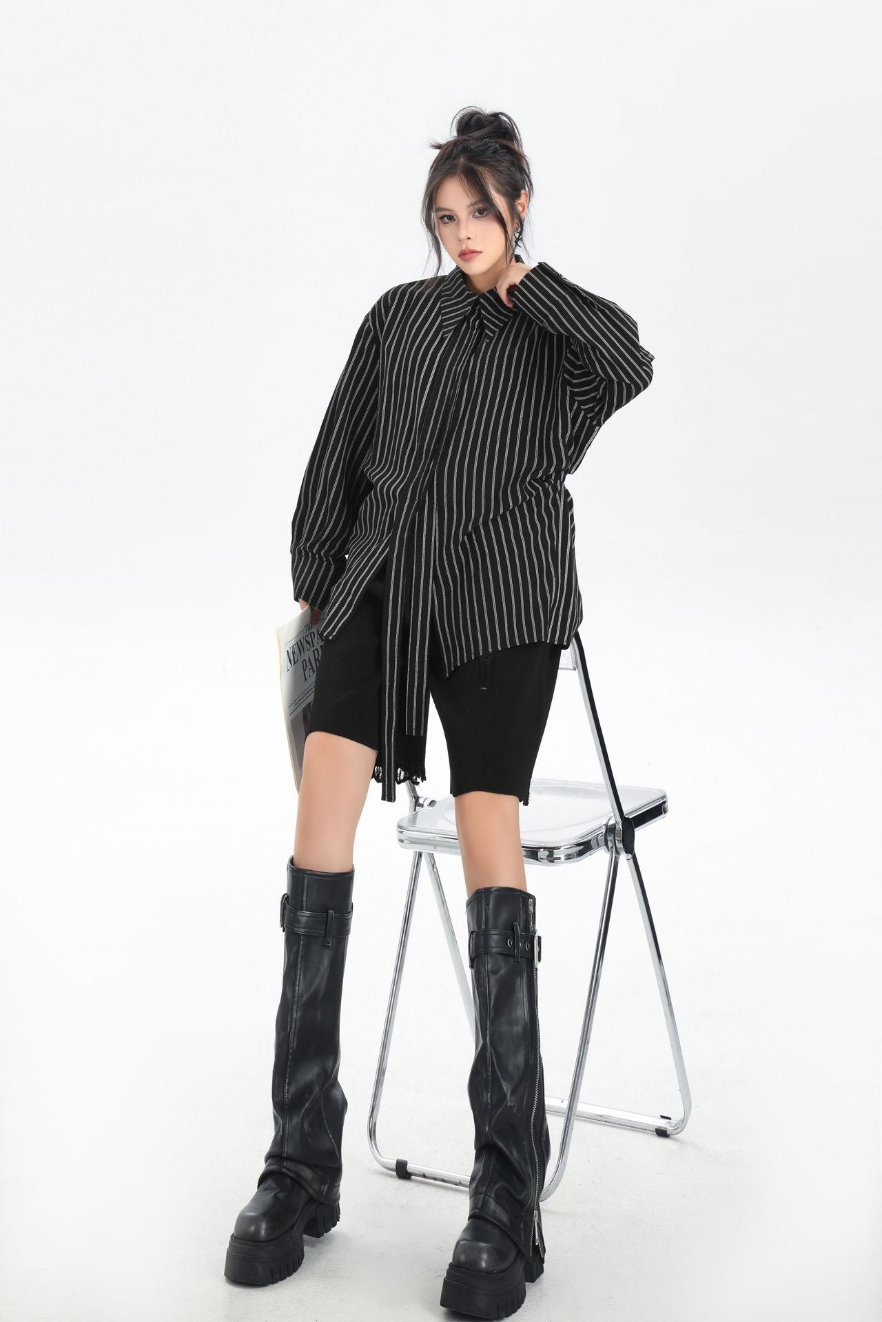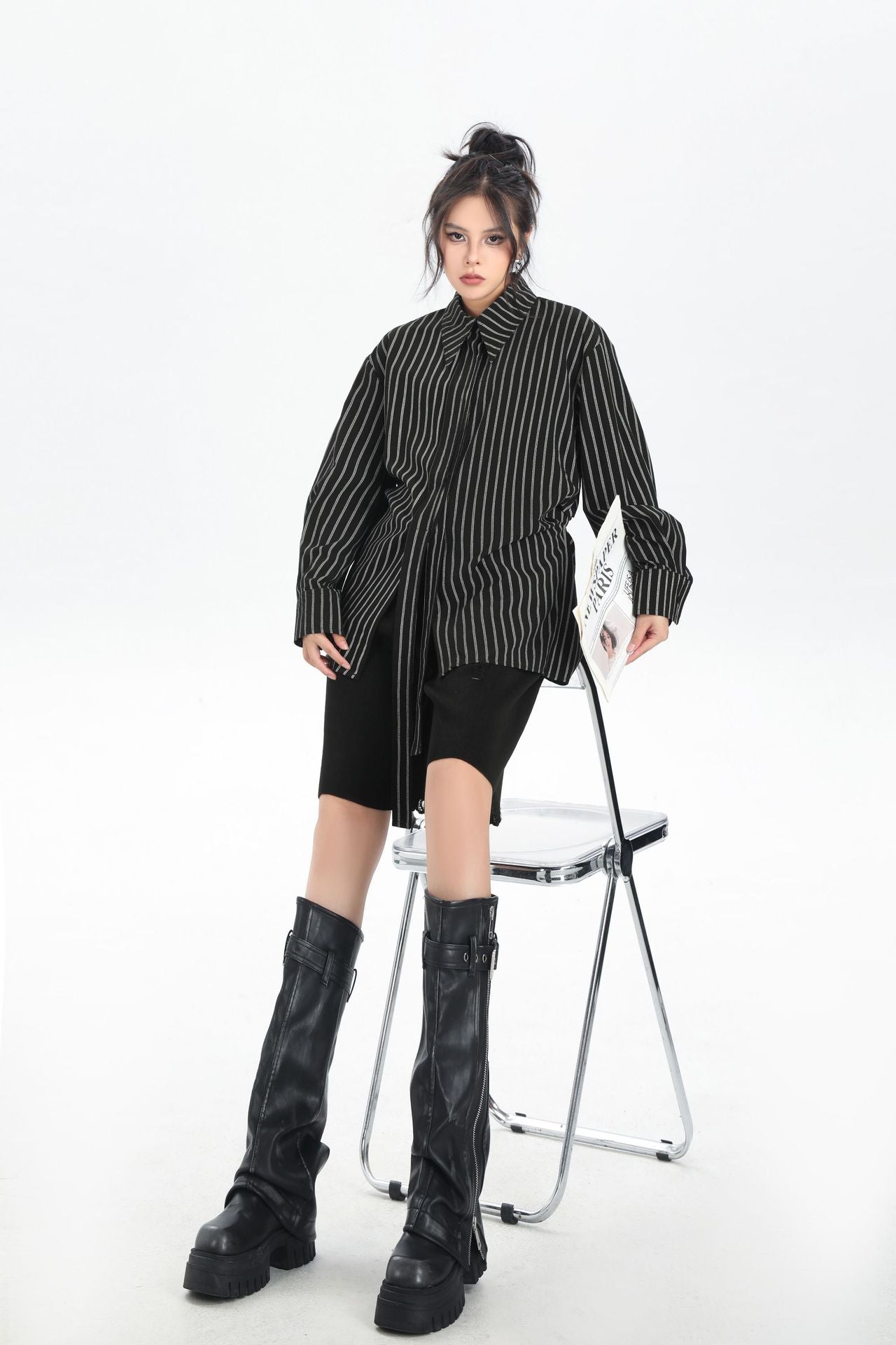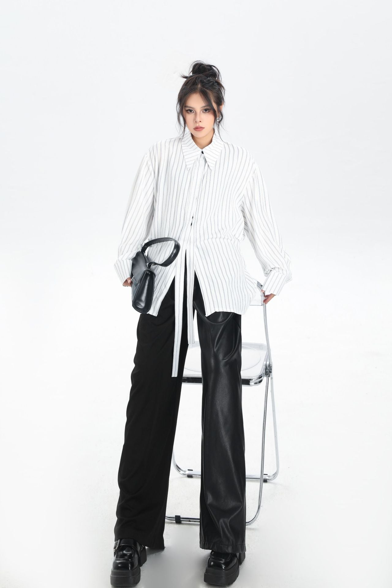 シャープな縦ストライプと程よくゆとりのあるルーズシルエットが印象的なドロップショルダーシャツ。大きめにとられた襟と、胸元から裾にかけて垂れる細リボンがアクセントになり、着こなしに動きをもたらす。両袖にはカフスディテールを施し、全体の印象を引き締めている。しなやかで通気性のあるコットンリネンの素材感が、見た目にも軽やかな仕上がり。パンツともスカートとも相性がよく、レイヤードにも重宝する。