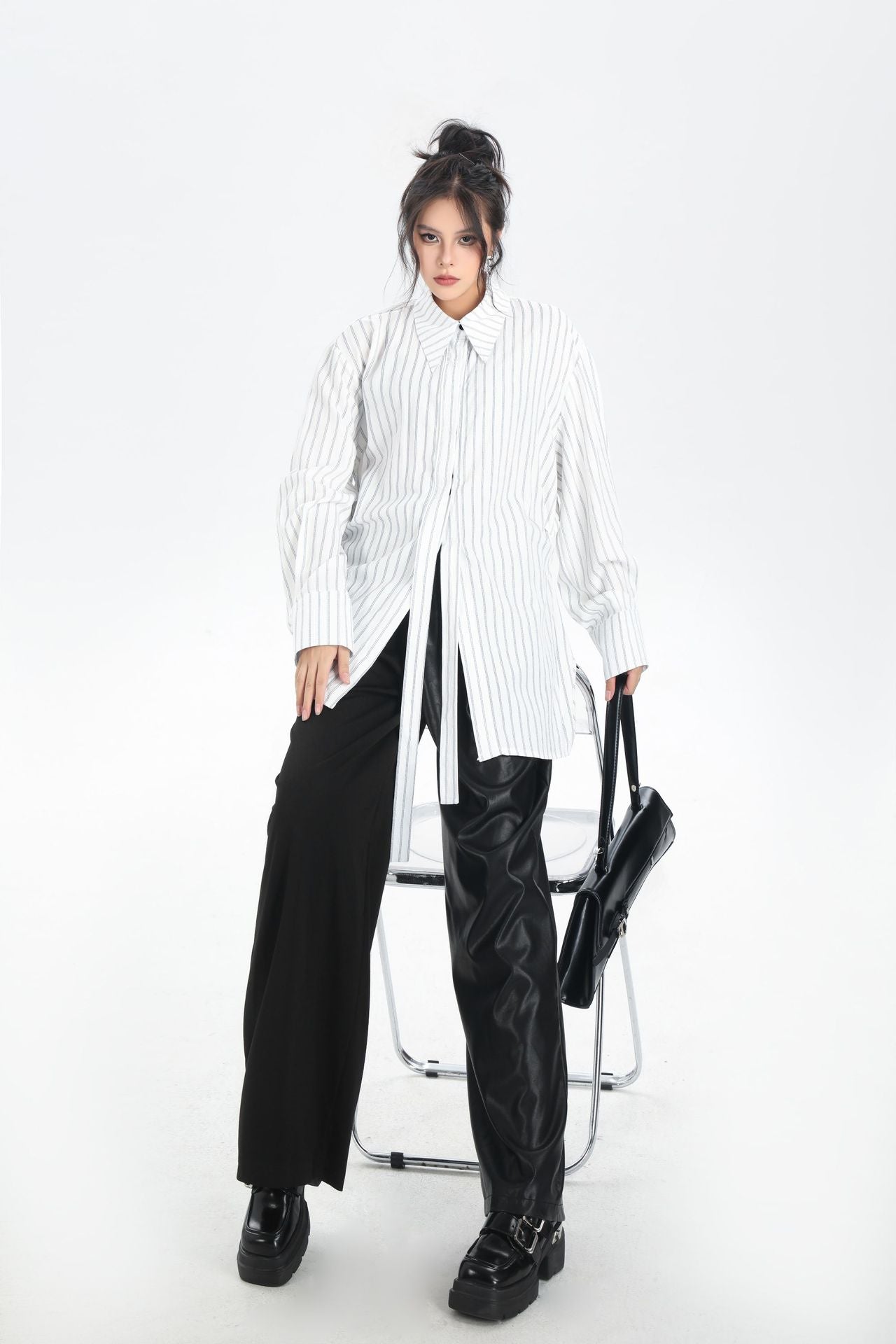 シャープな縦ストライプと程よくゆとりのあるルーズシルエットが印象的なドロップショルダーシャツ。大きめにとられた襟と、胸元から裾にかけて垂れる細リボンがアクセントになり、着こなしに動きをもたらす。両袖にはカフスディテールを施し、全体の印象を引き締めている。しなやかで通気性のあるコットンリネンの素材感が、見た目にも軽やかな仕上がり。パンツともスカートとも相性がよく、レイヤードにも重宝する。