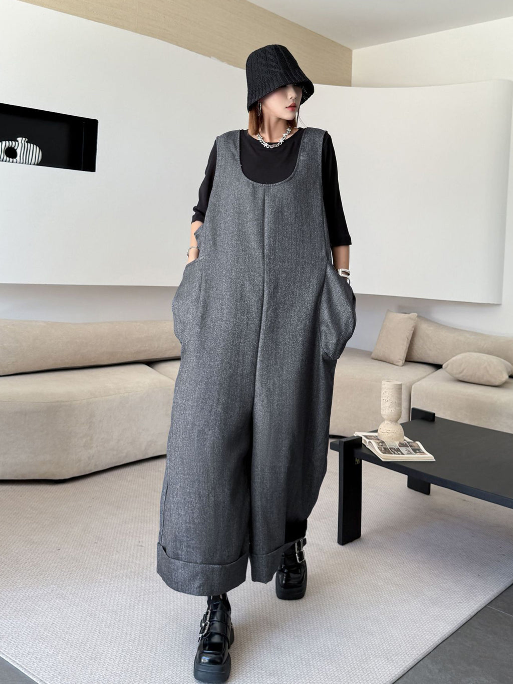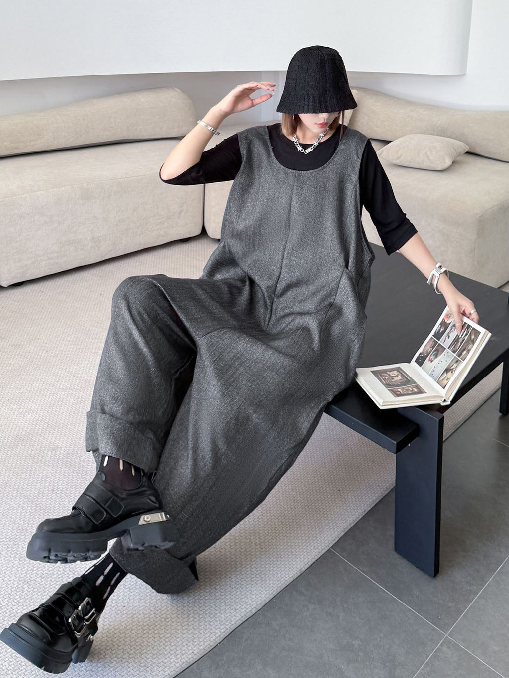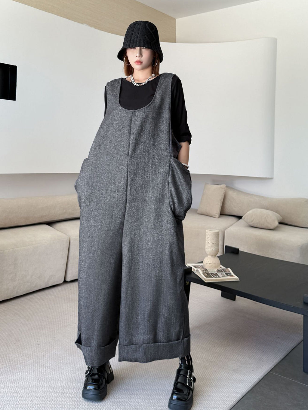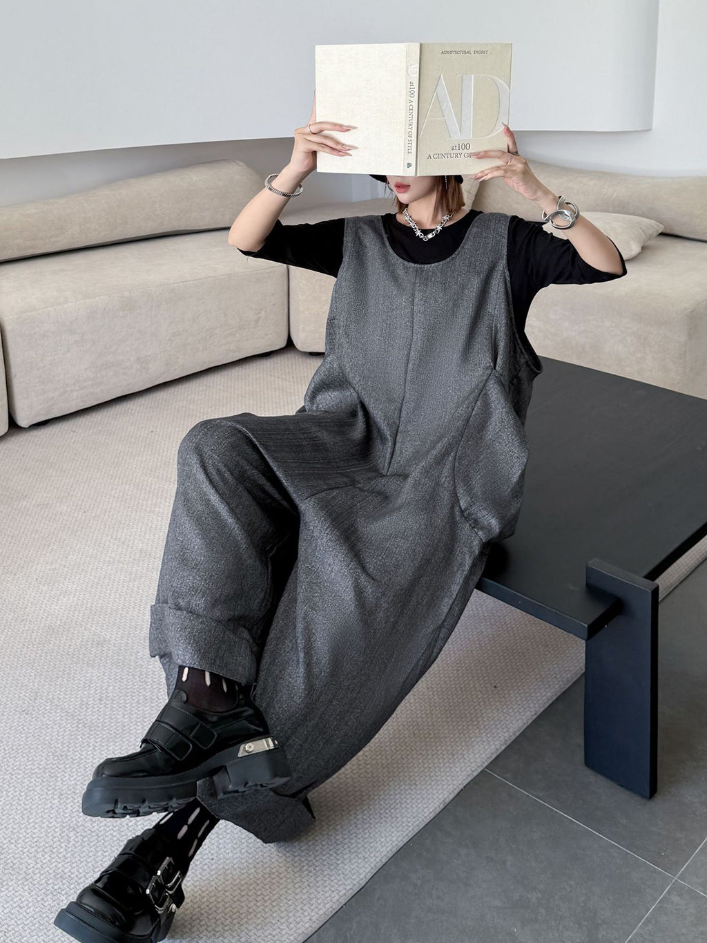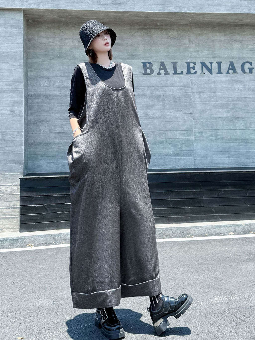ソリッドな質感の生地に、ゆとりあるワイドシルエットが融合したジャンプスーツ。フロントに大ぶりな立体ポケットを配し、構築的でインパクトのあるルックスに仕上げられている。肩からストンと落ちるシルエットが体のラインを拾わず、レイヤードも自在。裾のカーブデザインが軽やかさを演出し、個性的なシルエットを引き立てる。