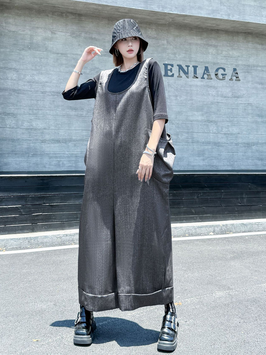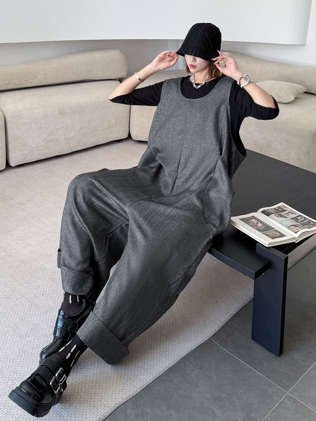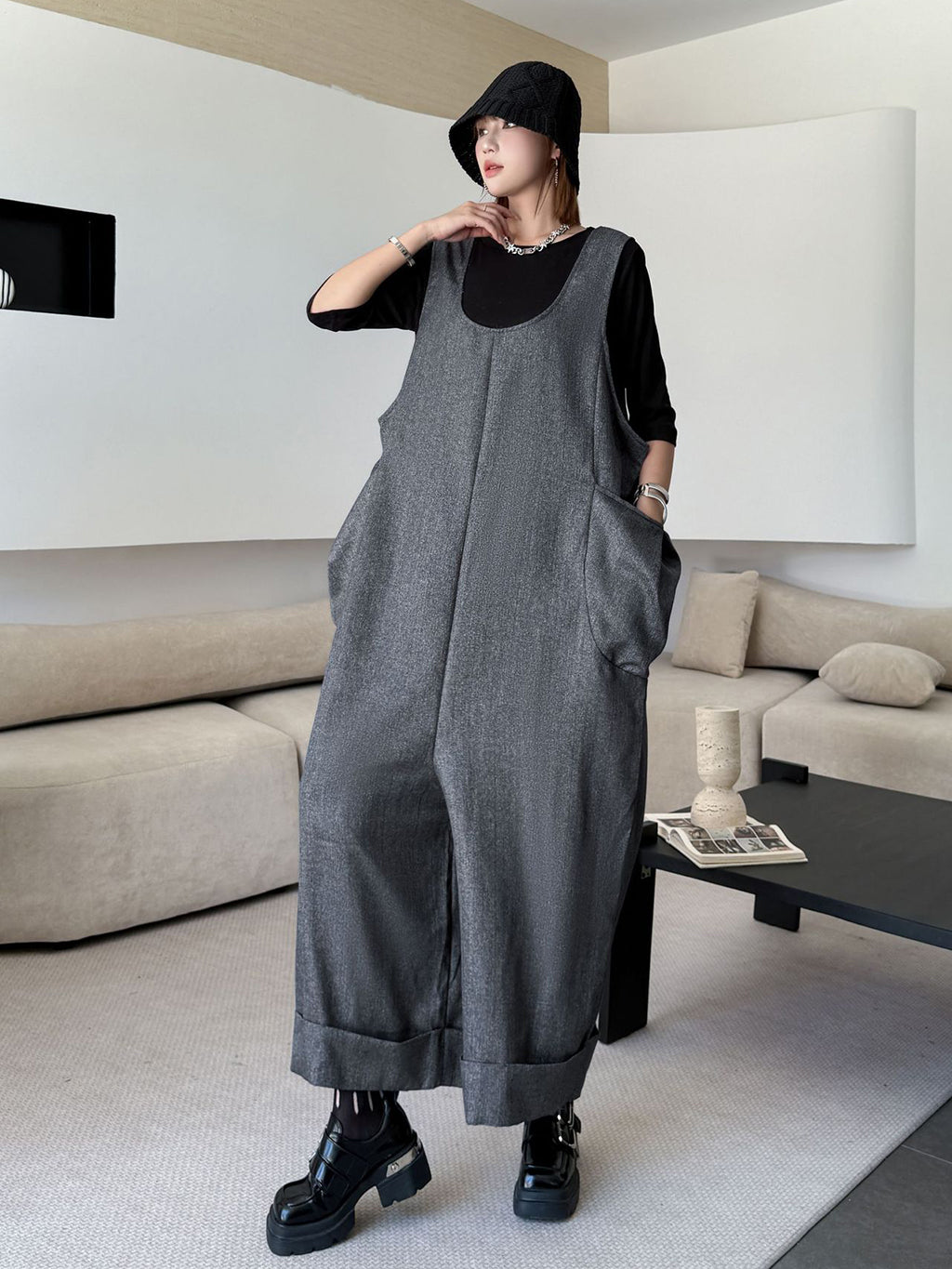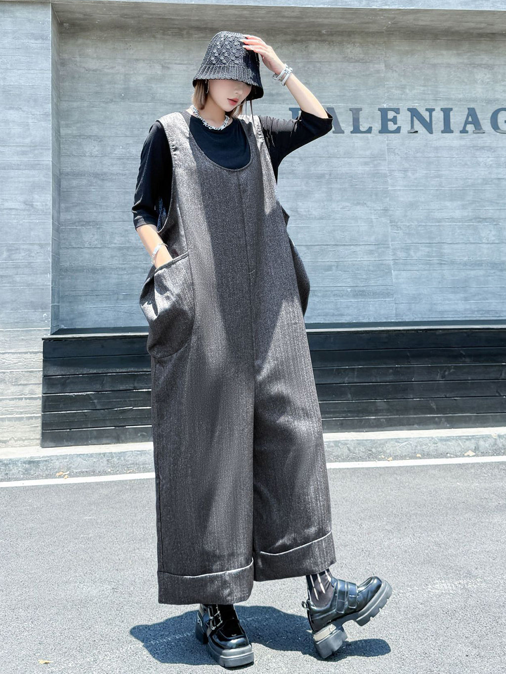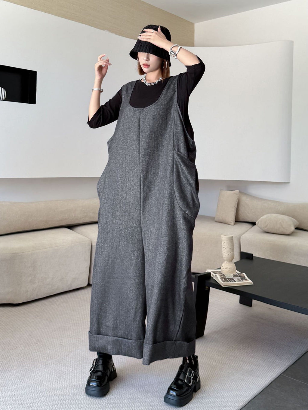 ソリッドな質感の生地に、ゆとりあるワイドシルエットが融合したジャンプスーツ。フロントに大ぶりな立体ポケットを配し、構築的でインパクトのあるルックスに仕上げられている。肩からストンと落ちるシルエットが体のラインを拾わず、レイヤードも自在。裾のカーブデザインが軽やかさを演出し、個性的なシルエットを引き立てる。
