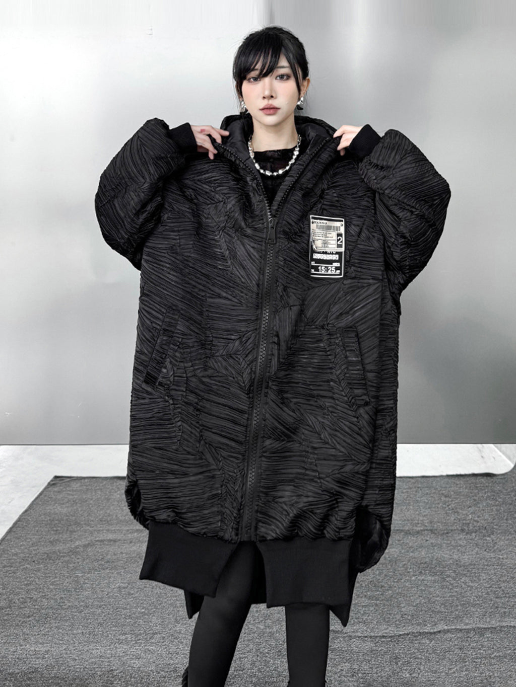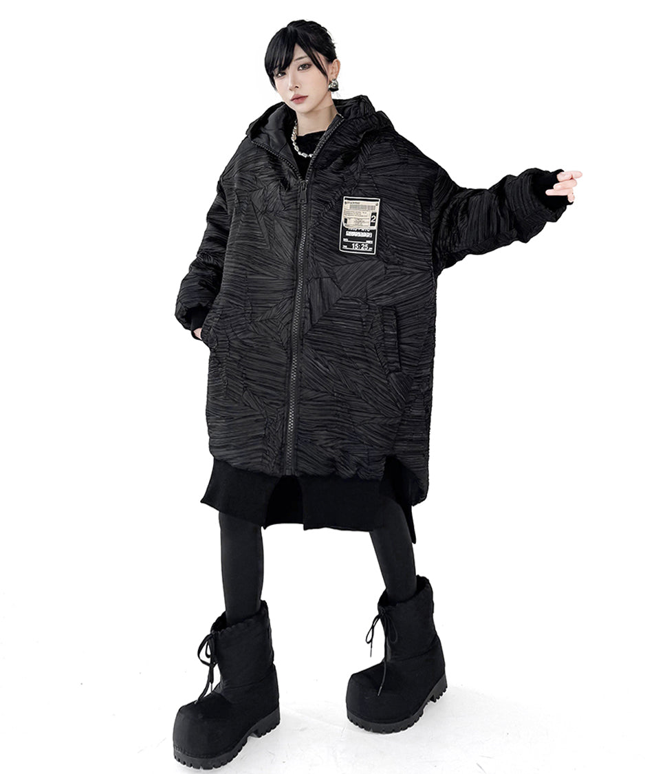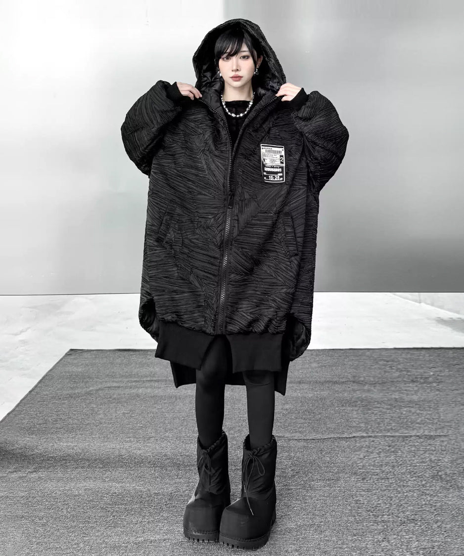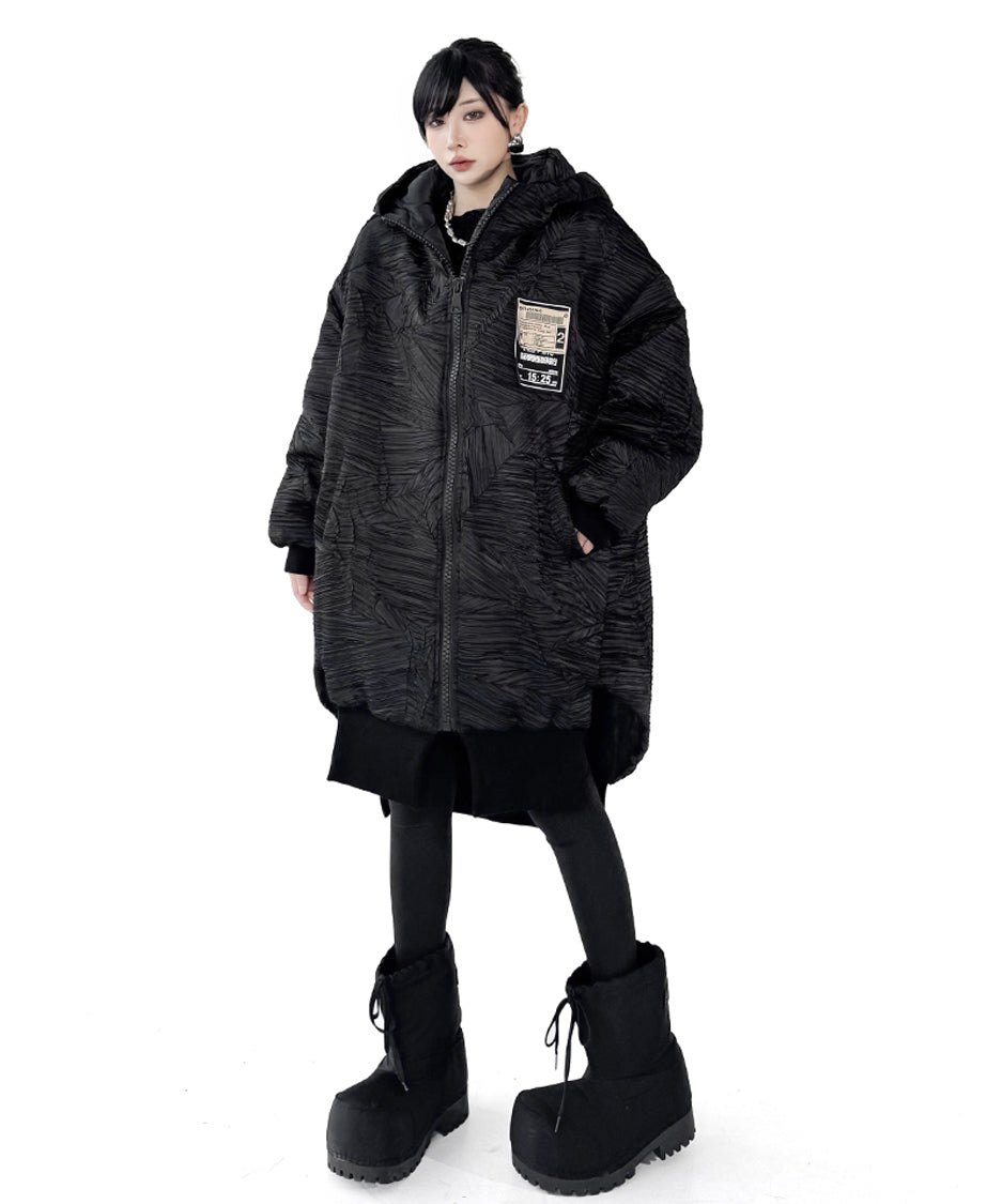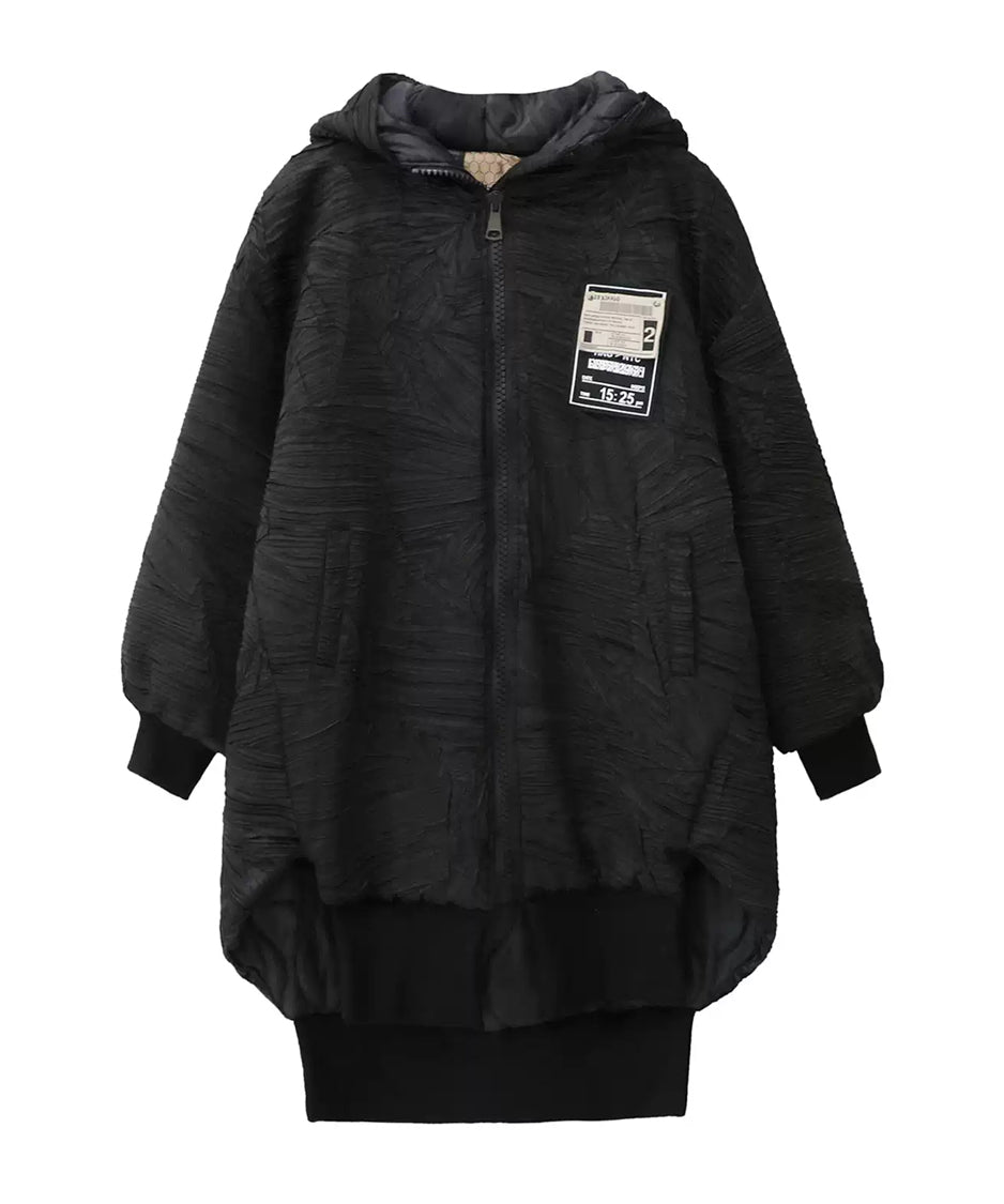 全体に走る立体的なテクスチャーが陰影を強調し、黒の濃淡に深さが生まれる構成。フードは包み込むような厚みを持ち、首回りに柔らかな重心を置く。ドロップした肩と広めの身幅が余白を生み、着用時の空気感を形作る。前面に配されたグラフィックタグが視覚的なアクセントとなり、裾部分はレイヤー構造により流れを持つシルエットへと繋がる。全体のボリュームと縦のラインが共存し、存在感に静かな強さを宿す。