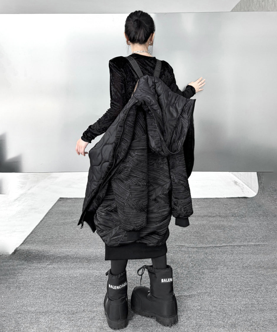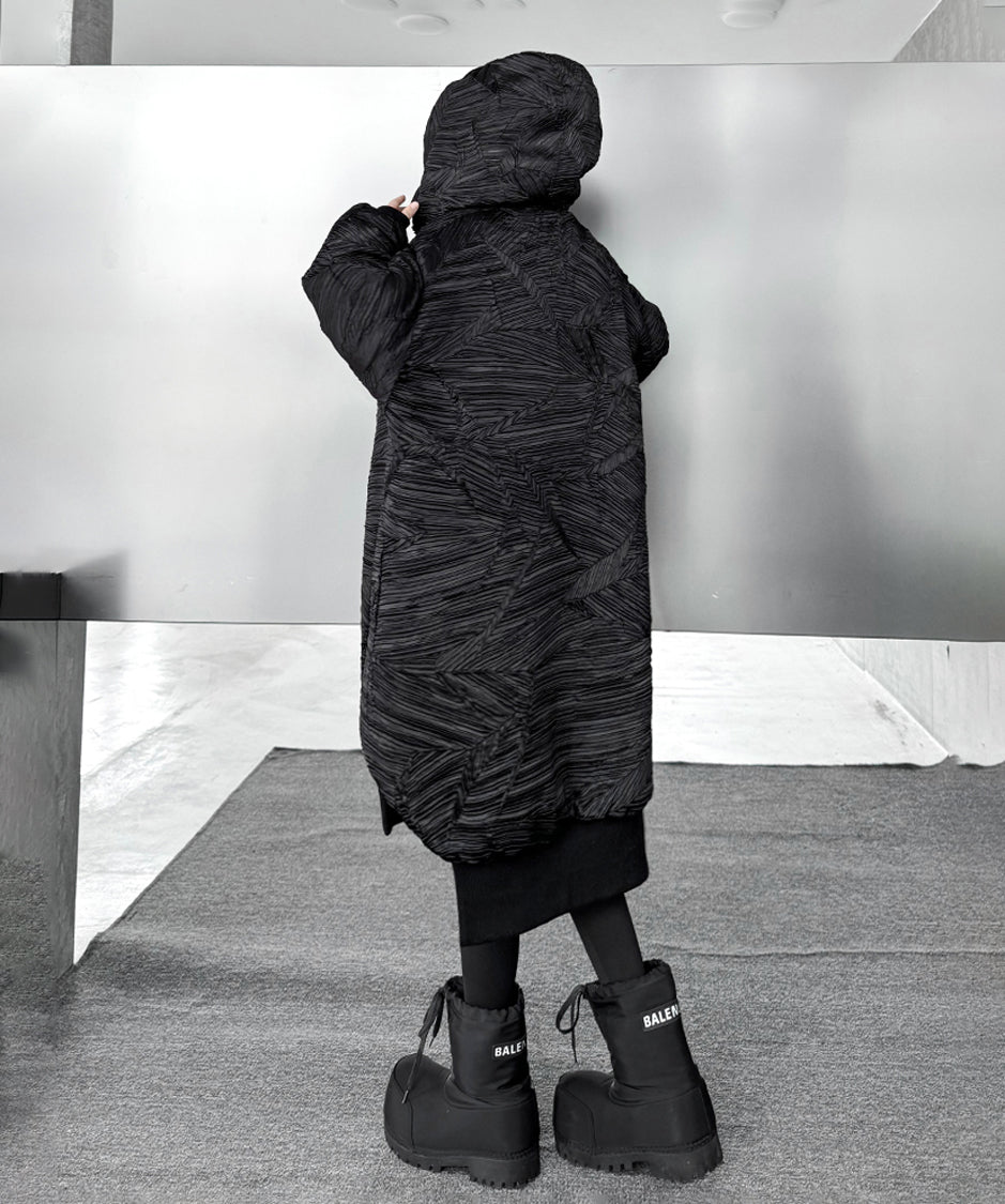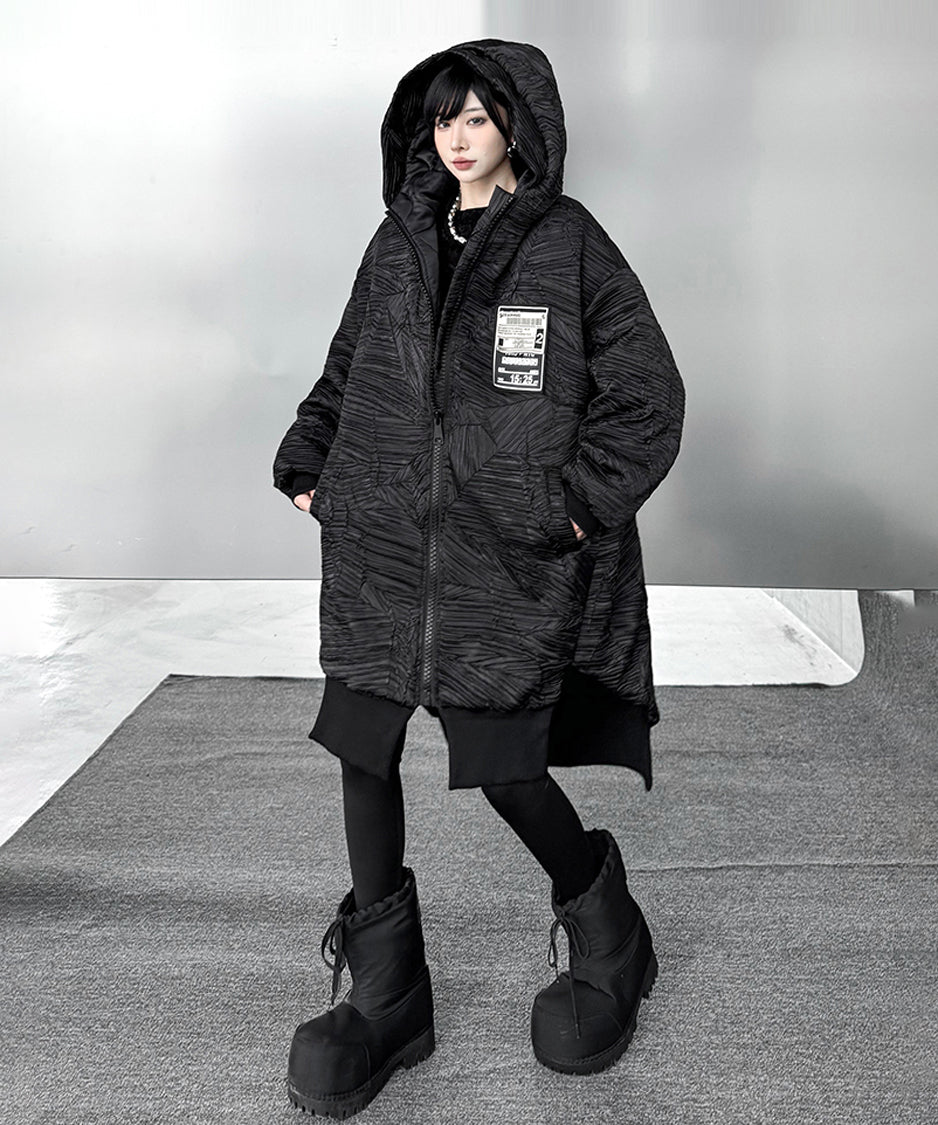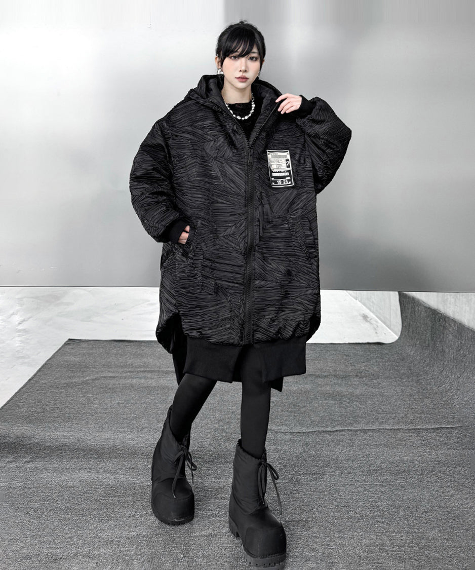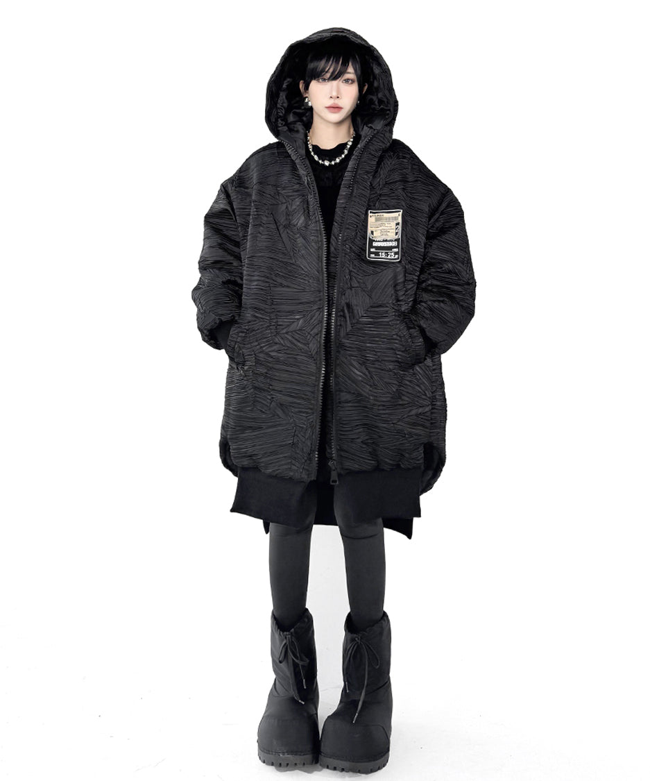 全体に走る立体的なテクスチャーが陰影を強調し、黒の濃淡に深さが生まれる構成。フードは包み込むような厚みを持ち、首回りに柔らかな重心を置く。ドロップした肩と広めの身幅が余白を生み、着用時の空気感を形作る。前面に配されたグラフィックタグが視覚的なアクセントとなり、裾部分はレイヤー構造により流れを持つシルエットへと繋がる。全体のボリュームと縦のラインが共存し、存在感に静かな強さを宿す。