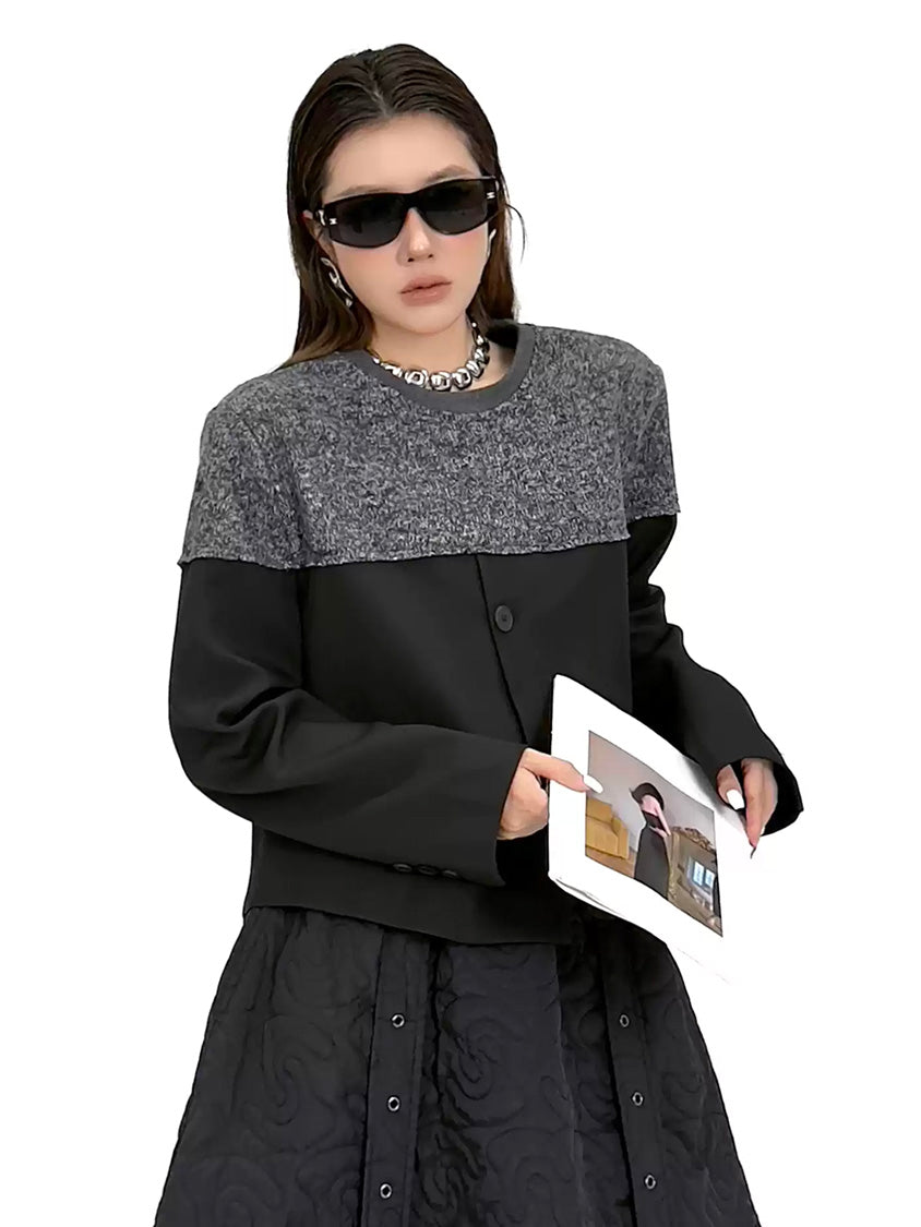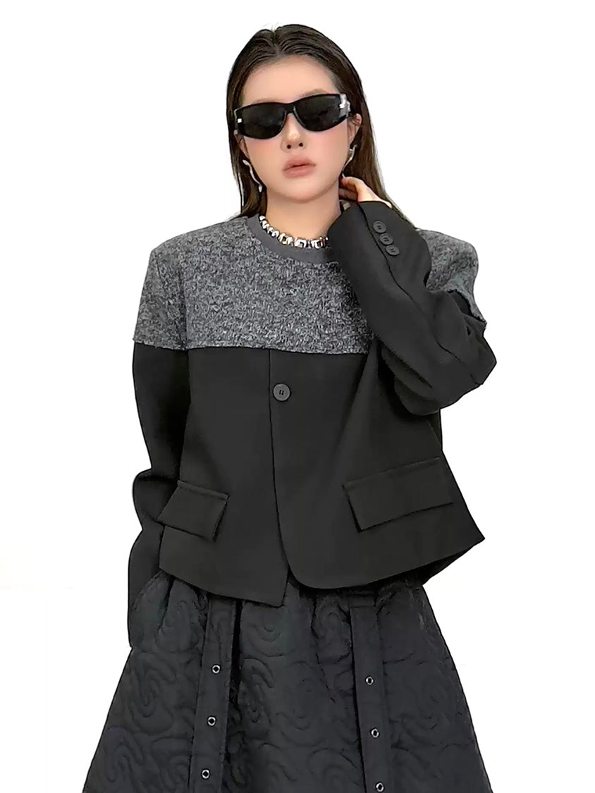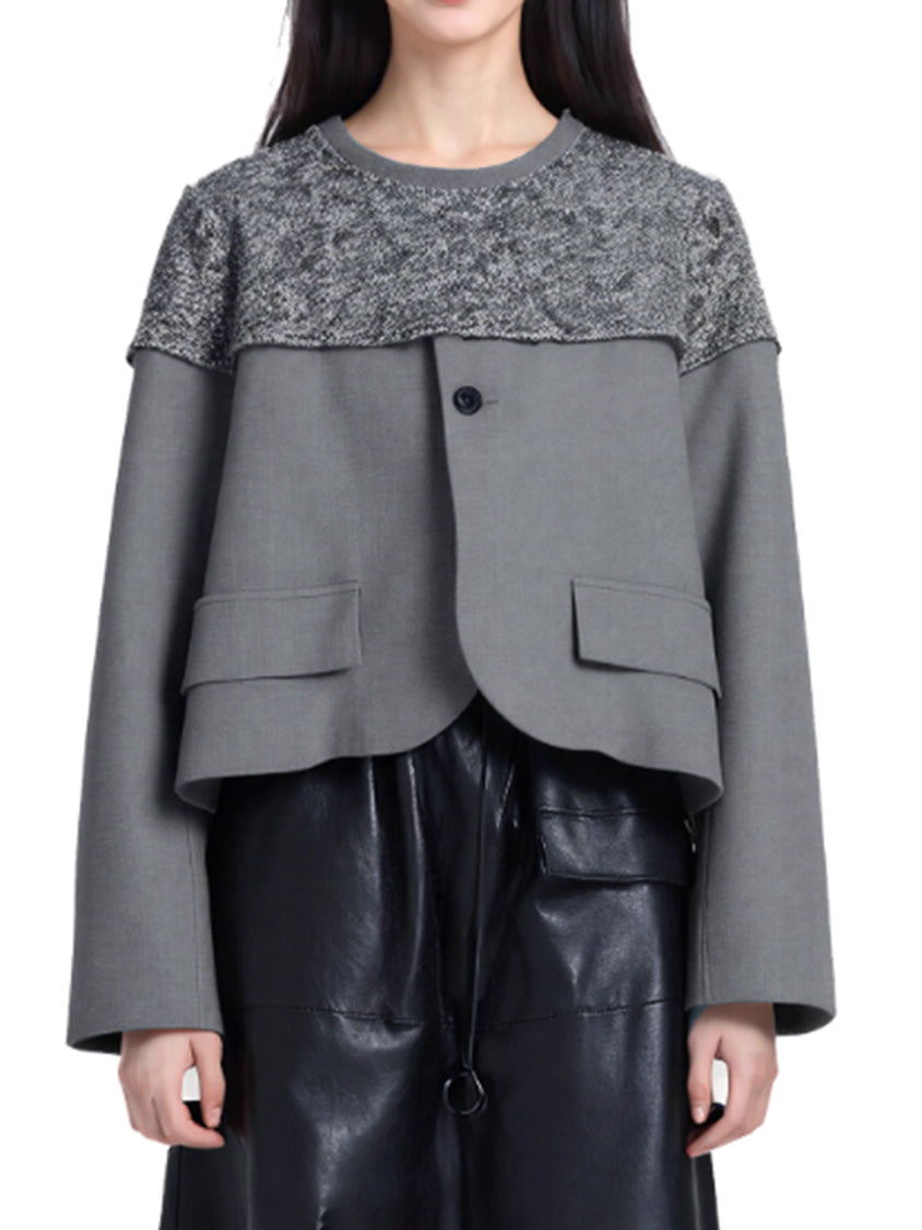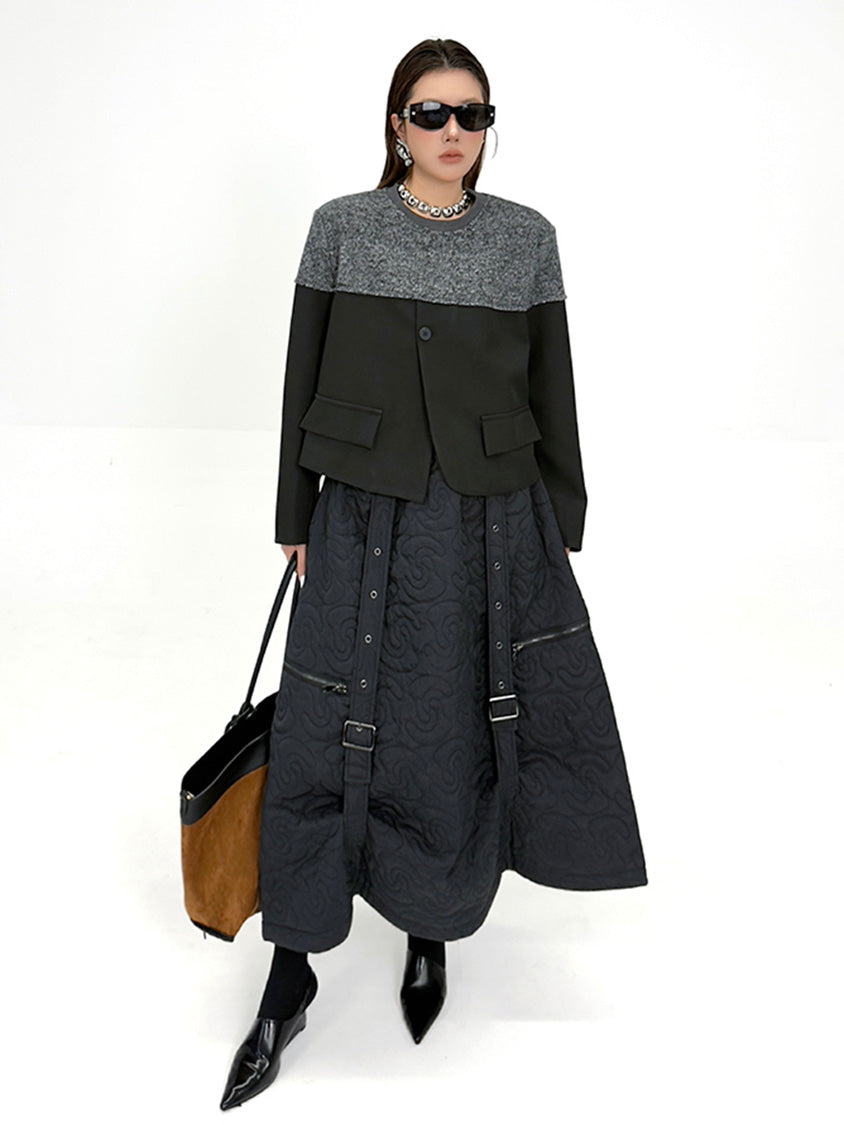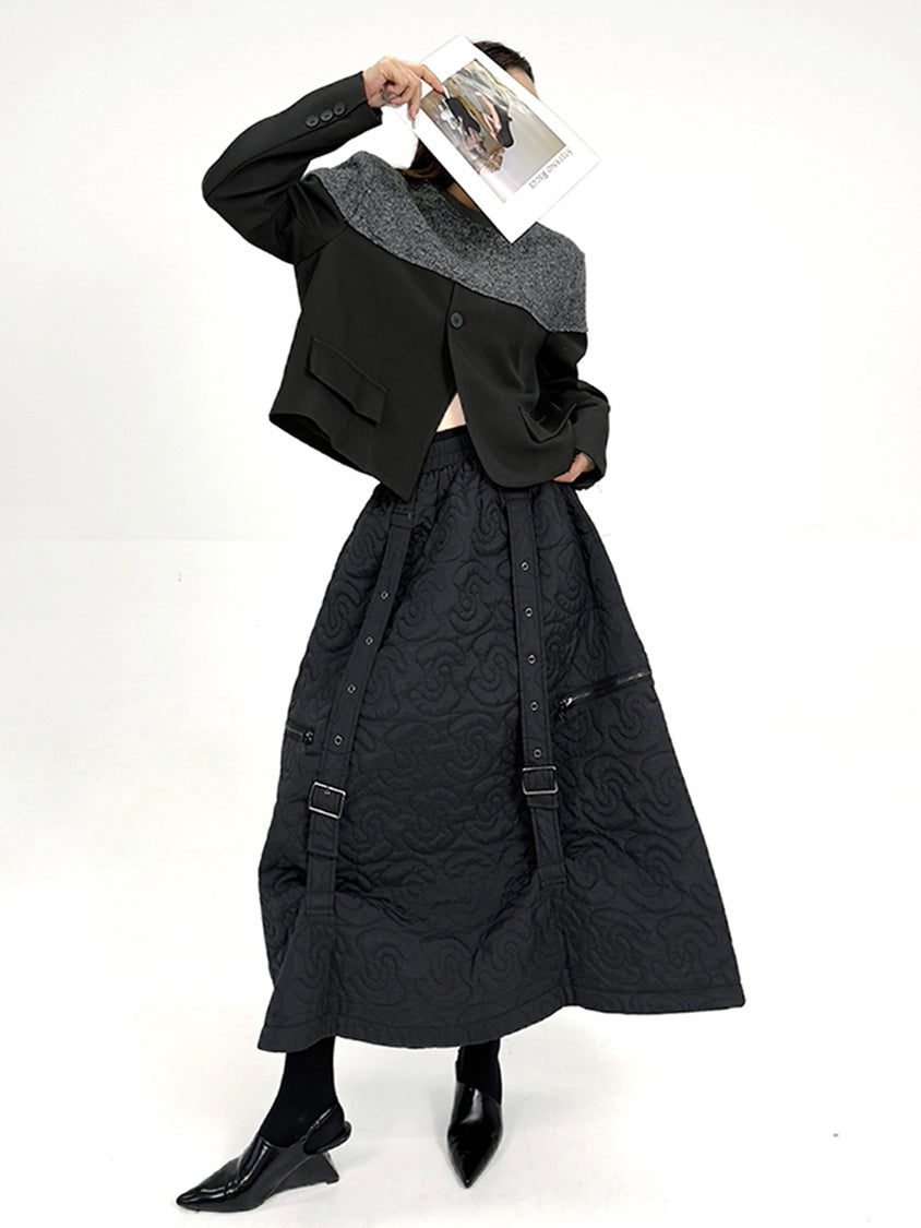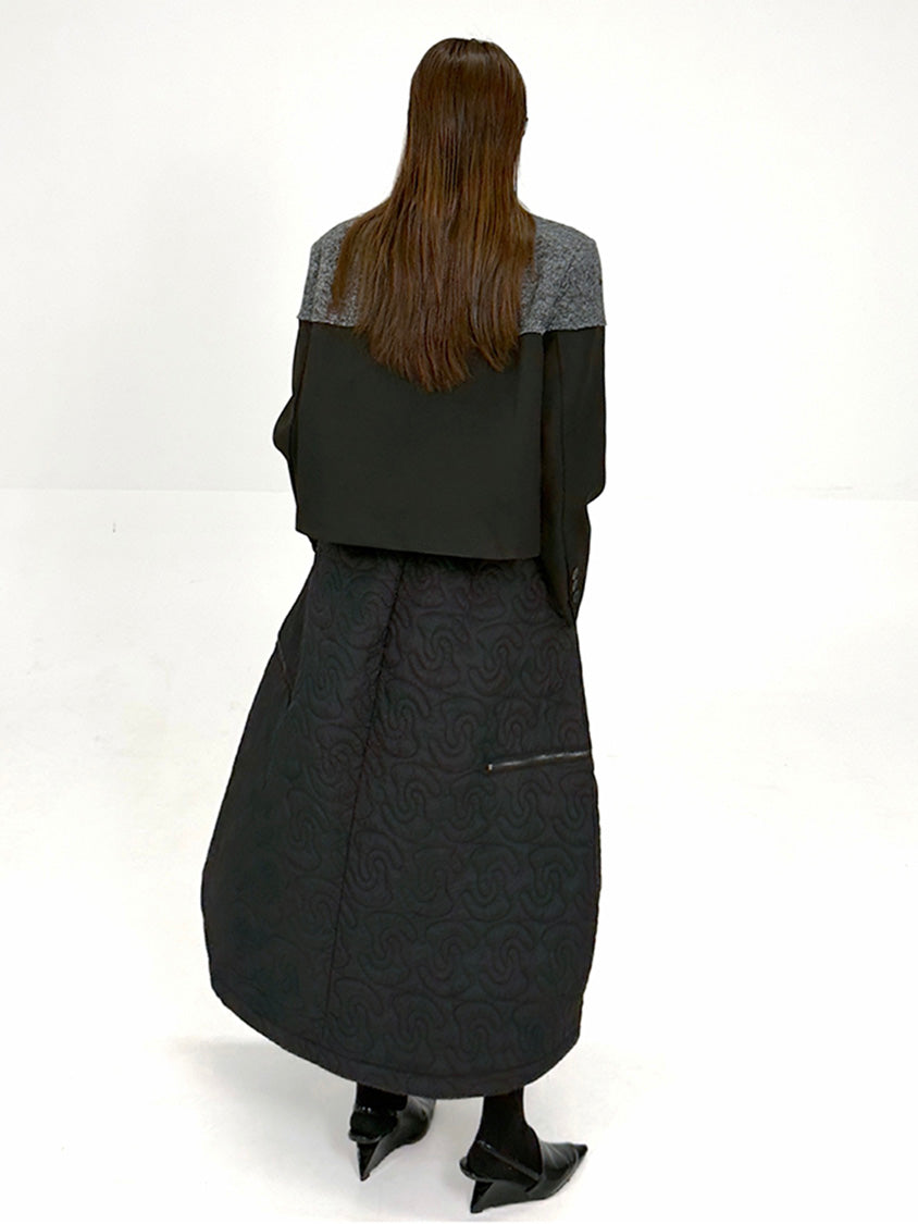トップスは上部にざらりとした表情の素材を配置し、身頃から袖にかけて滑らかな質感へと切り替える構造。直線的な切り替えラインが視線を横に走らせ、コンパクトな丈感が上半身を引き締める。フロントには留め仕様を配し、構築的で静かな印象をつくる。スカートは全面に施されたキルティング加工により、奥行きのある表面を形成。縦方向に配置されたディテールが動作に合わせて陰影を変化させ、裾に向かって広がる輪郭が歩行時に自然な揺れを生む。上下を通してトーンと質感を揃え、モード感のある佇まいへ導くシリーズ構成。