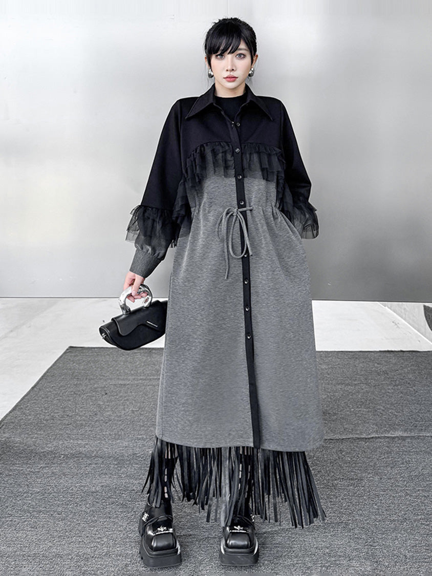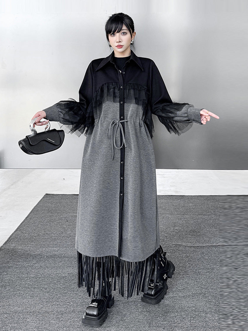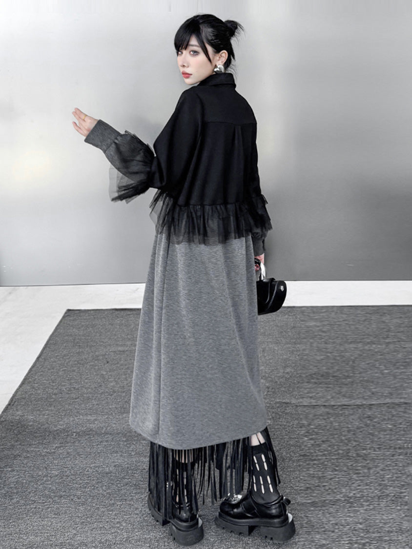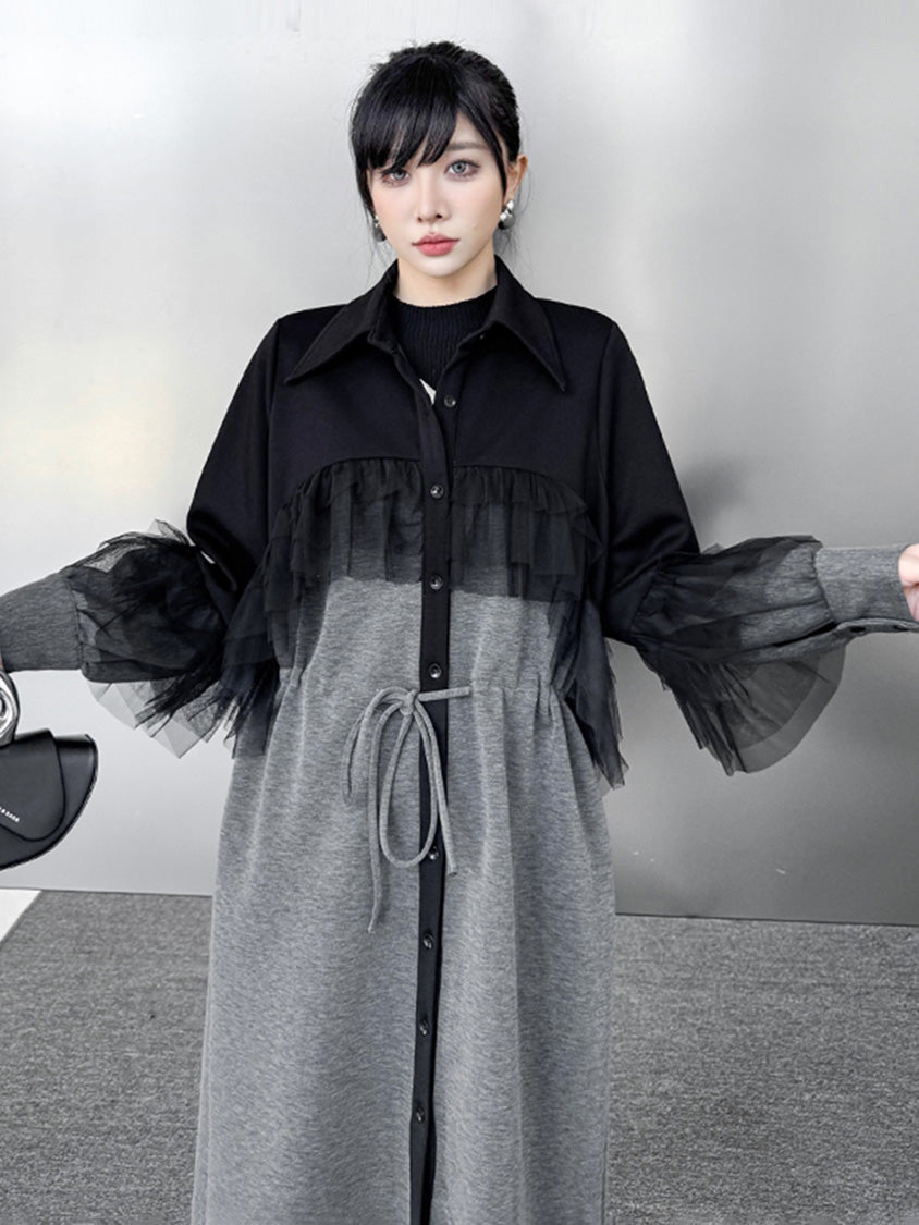 布帛とチュールを組み合わせた異素材切り替えのロングシャツコート。胸元から袖口にかけてのフリルが立体的に広がり、軽やかな動きと奥行きを演出する。前開きボタンで着脱しやすく、ウエストのドローストリングでシルエットを自在に調整可能。マットな質感の生地が落ち着いた印象を与えながらも、チュールの透け感がアクセントとなり、モードな存在感を放つ。