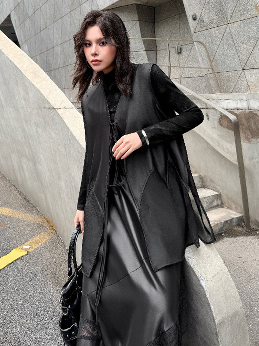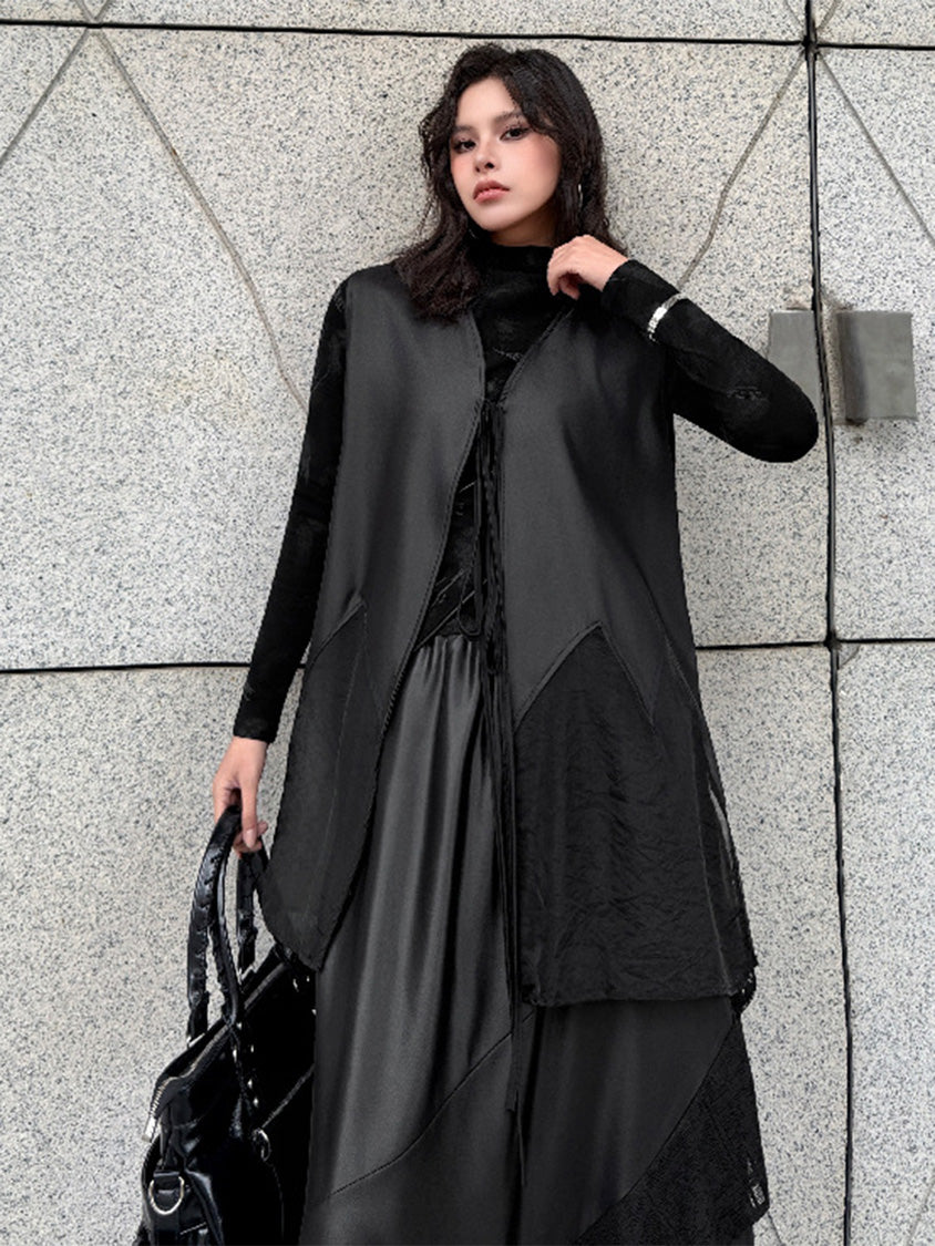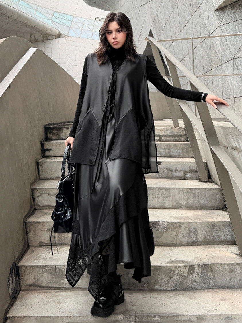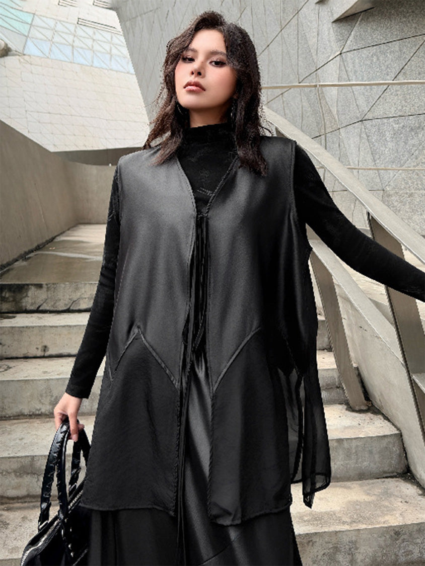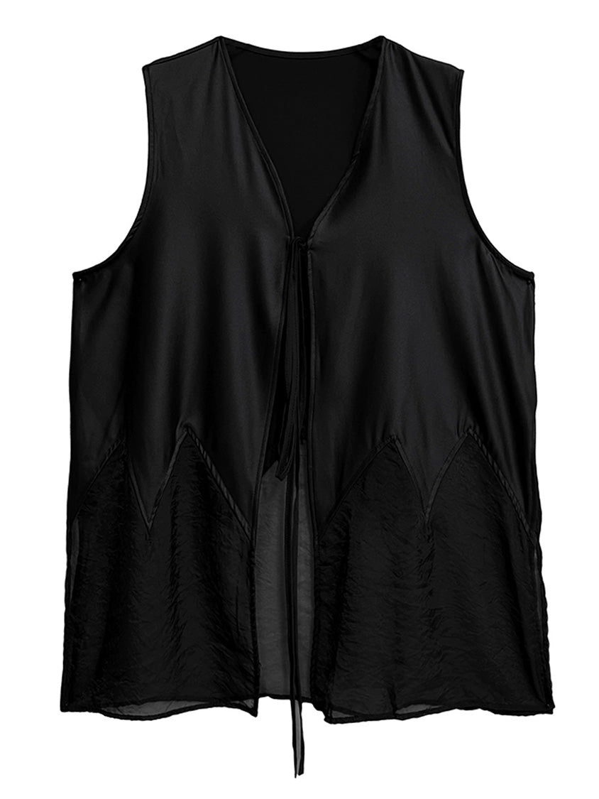 なめらかな表面のボディと透け感のある裾パネルを組み合わせたロングベスト。深く開いたVネックと細いフロントタイコードが縦のラインを強調し、前身頃から裾へ向かって広がるカッティングが柔らかなドレープを形成。軽量なシアー素材がサイドから後方へ流れる構造となり、動きに合わせて揺れる立体的なシルエットを描く。ロングトップスやワンピースとの重なりによって奥行きのあるスタイリングを構築するレイヤードデザイン。