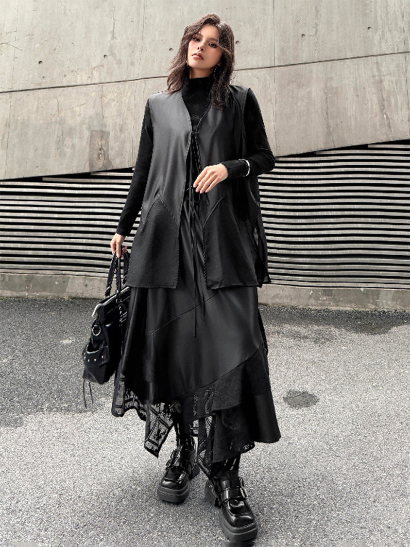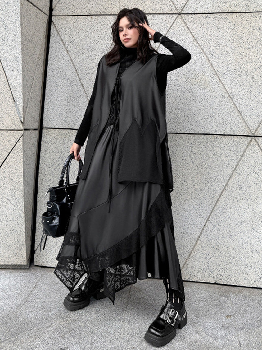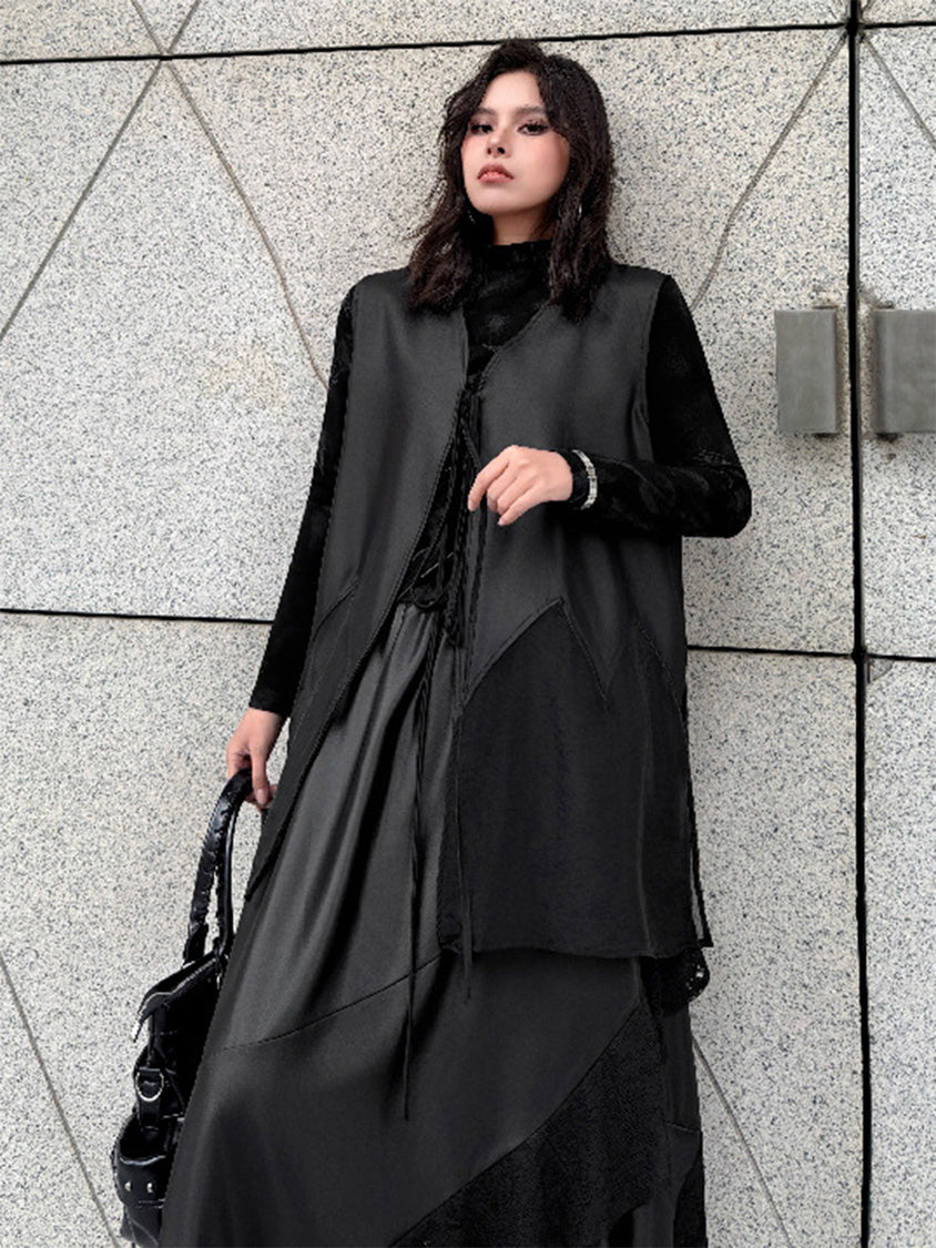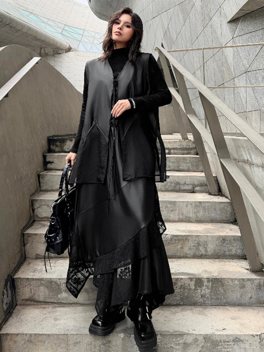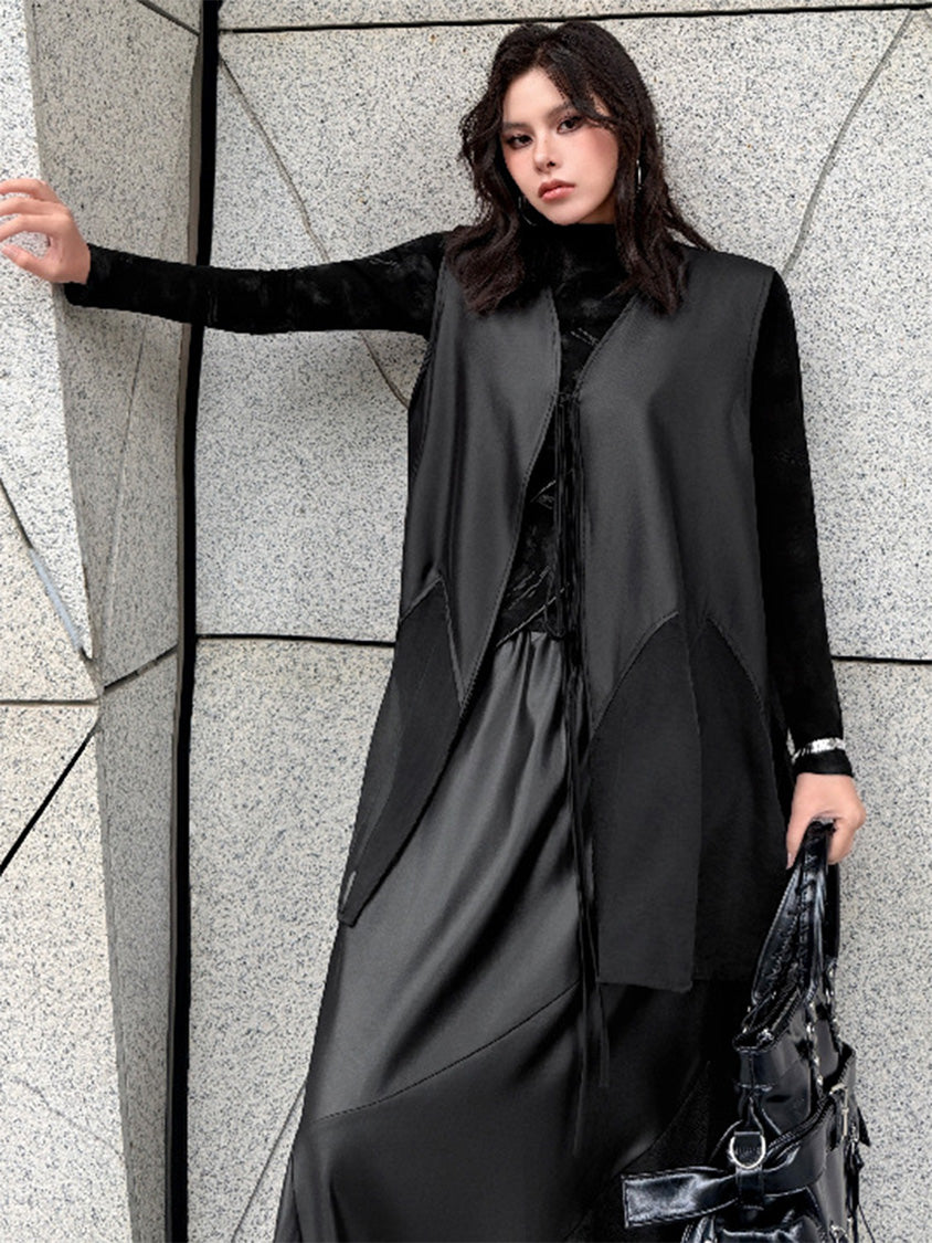 なめらかな表面のボディと透け感のある裾パネルを組み合わせたロングベスト。深く開いたVネックと細いフロントタイコードが縦のラインを強調し、前身頃から裾へ向かって広がるカッティングが柔らかなドレープを形成。軽量なシアー素材がサイドから後方へ流れる構造となり、動きに合わせて揺れる立体的なシルエットを描く。ロングトップスやワンピースとの重なりによって奥行きのあるスタイリングを構築するレイヤードデザイン。