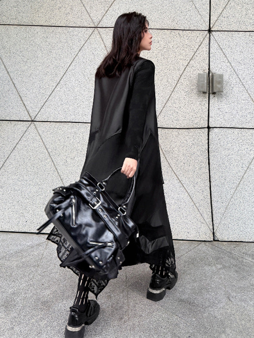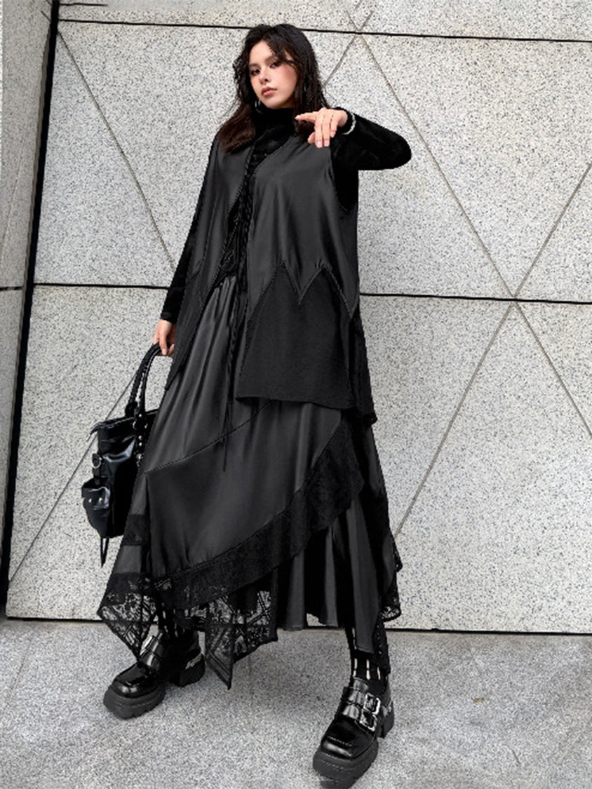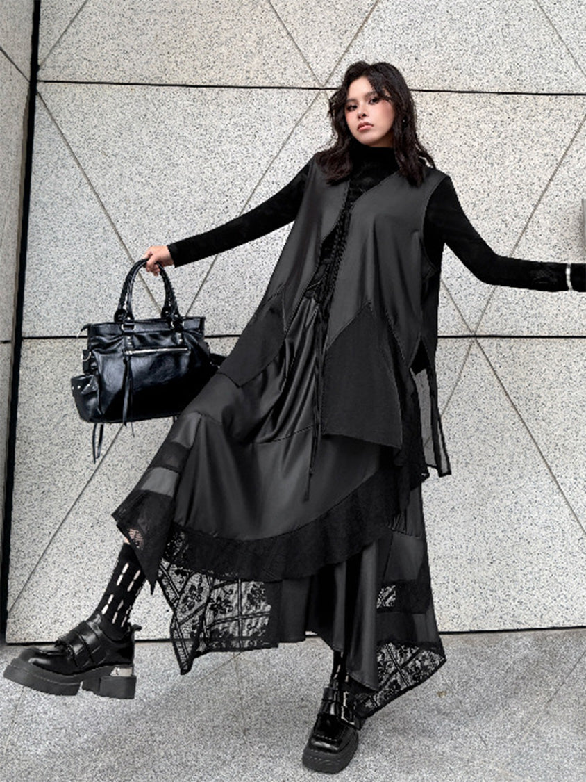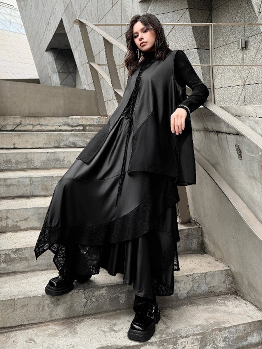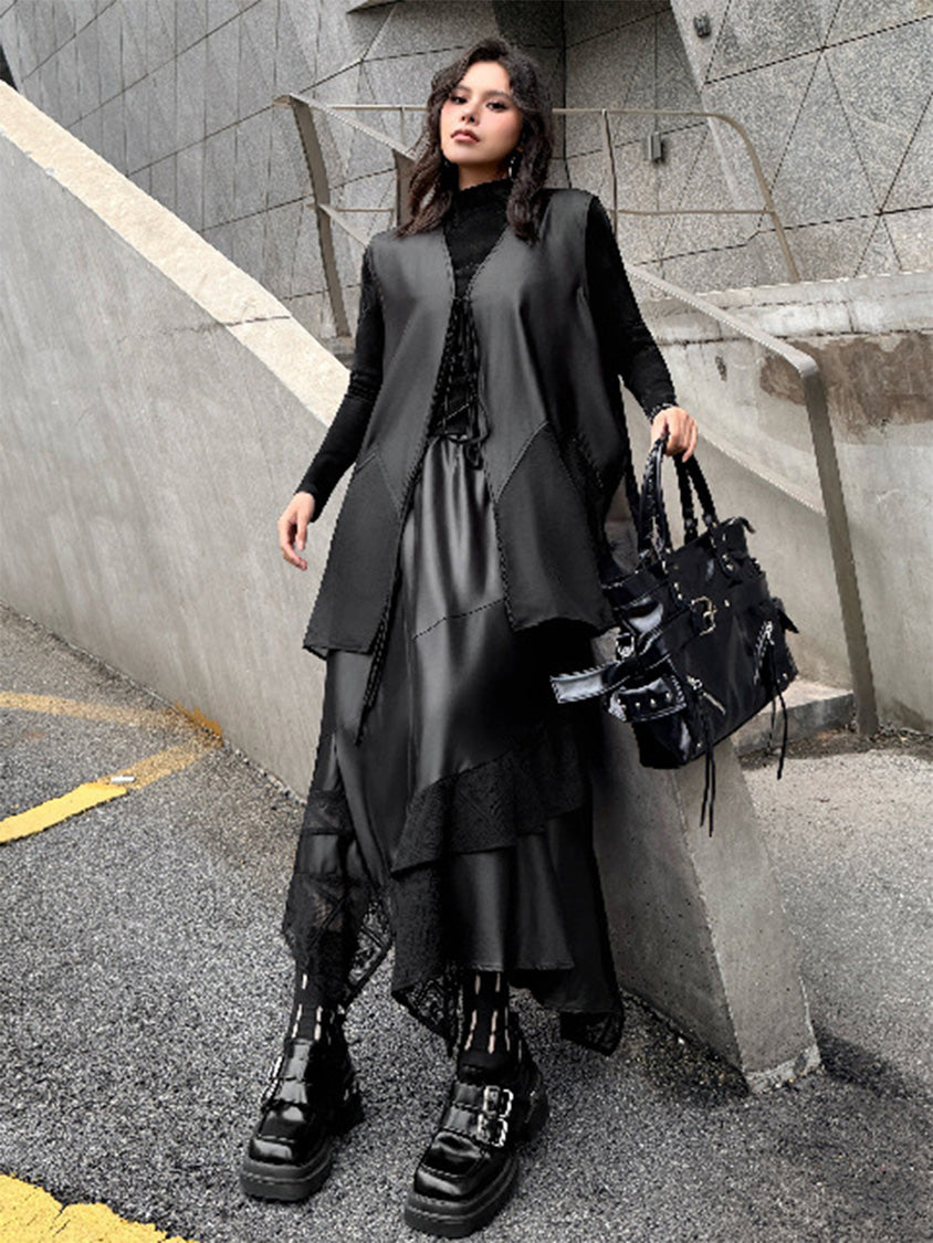 なめらかな表面のボディと透け感のある裾パネルを組み合わせたロングベスト。深く開いたVネックと細いフロントタイコードが縦のラインを強調し、前身頃から裾へ向かって広がるカッティングが柔らかなドレープを形成。軽量なシアー素材がサイドから後方へ流れる構造となり、動きに合わせて揺れる立体的なシルエットを描く。ロングトップスやワンピースとの重なりによって奥行きのあるスタイリングを構築するレイヤードデザイン。