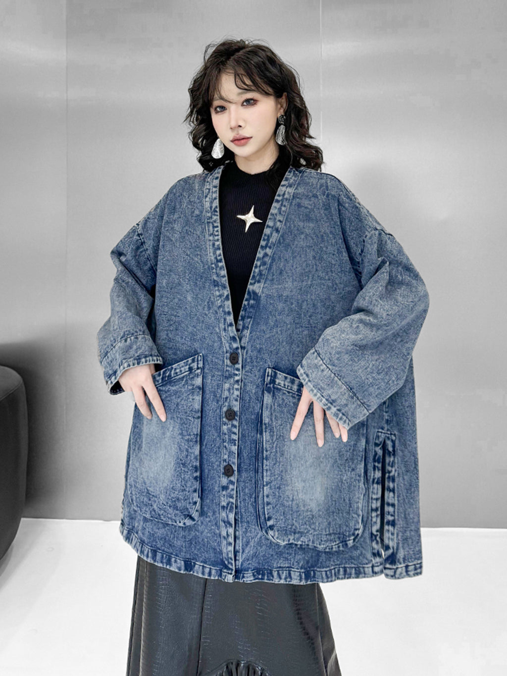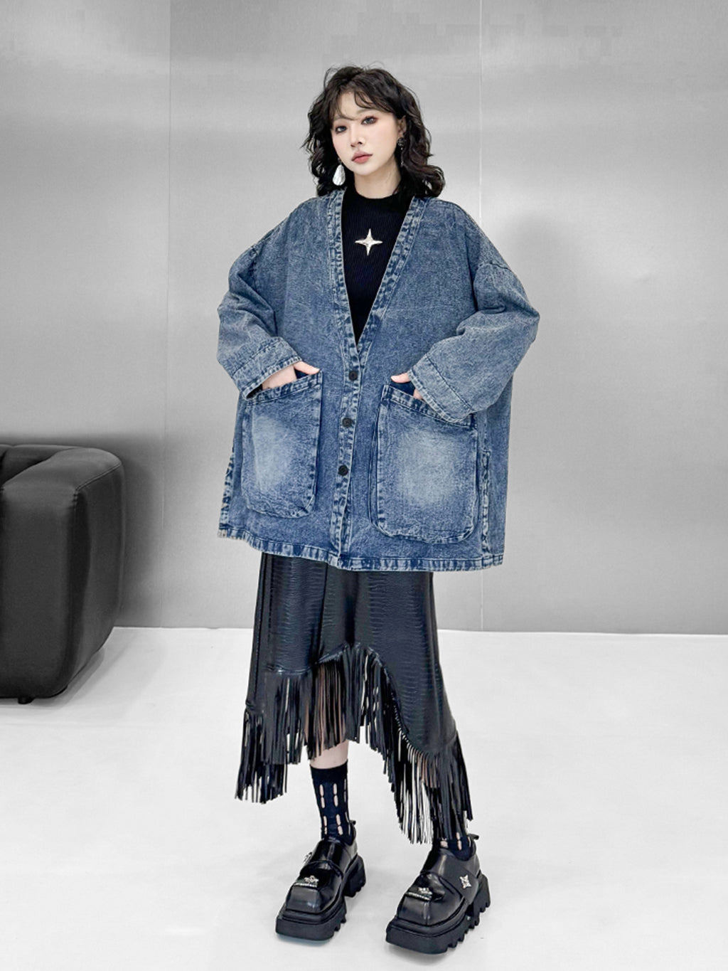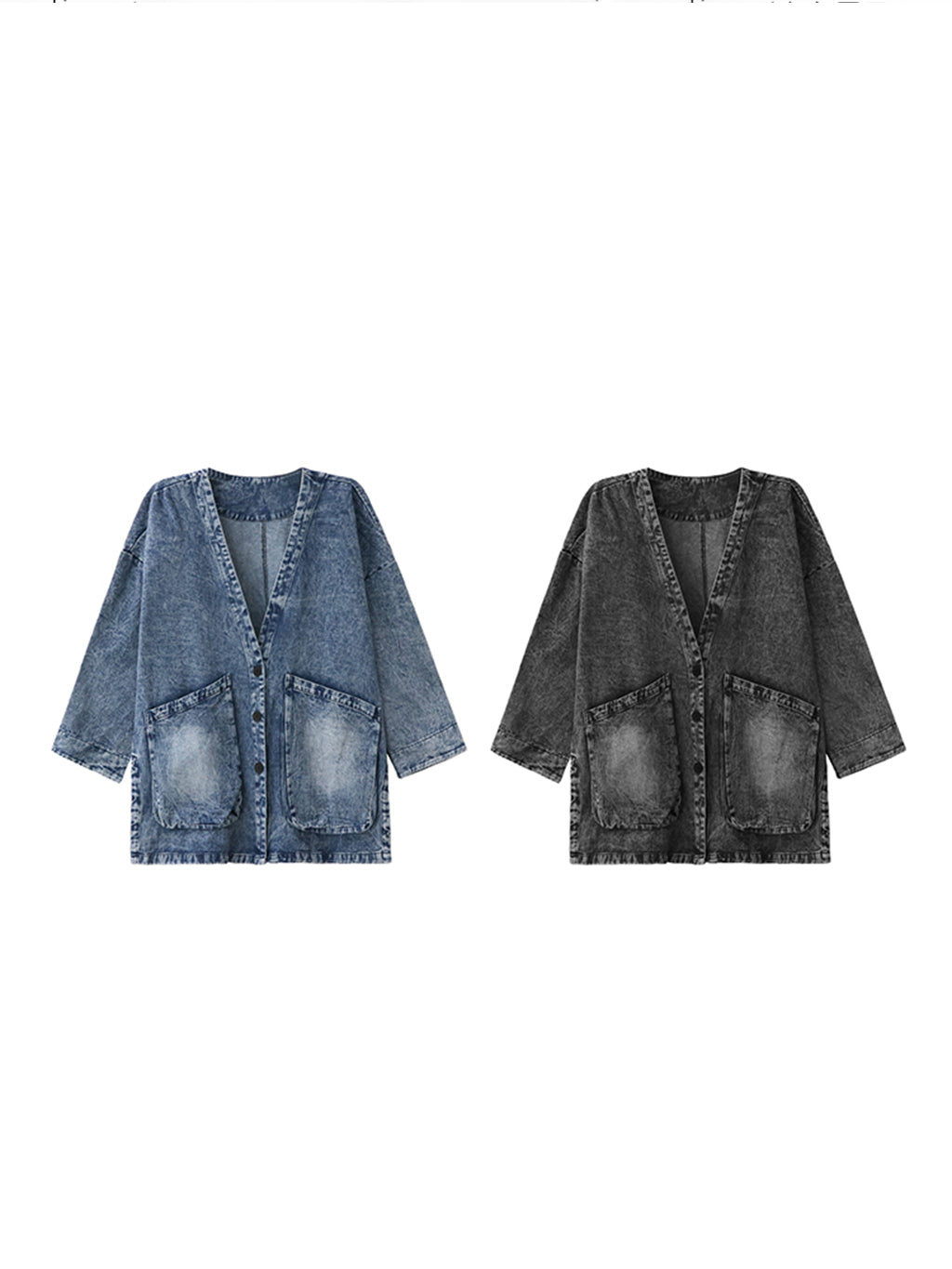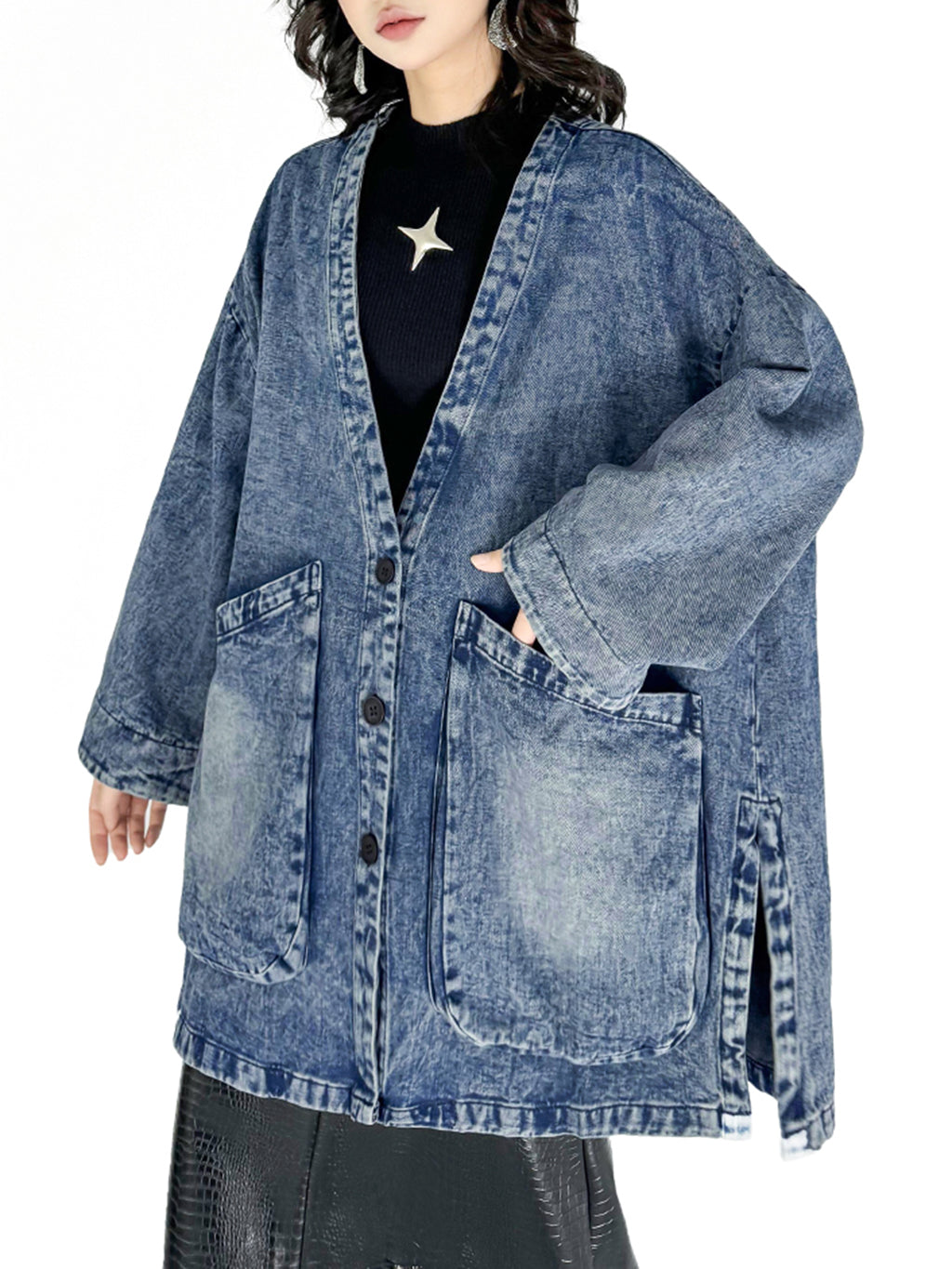 たっぷりとした身幅とドロップショルダーが特徴のルーズシルエットデニムジャケット。フロントはVネック仕様で、インナーを活かしたレイヤードが映える設計。ユーズド感のあるウォッシュ加工がこなれた印象を与え、大ぶりなフロントポケットがアクセントと実用性を兼備。サイドには動きを出すスリット入りで、抜け感を加速。しっかりとしたデニム地ながら、柔らかく肌なじみの良い質感で、ロングシーズン活躍。