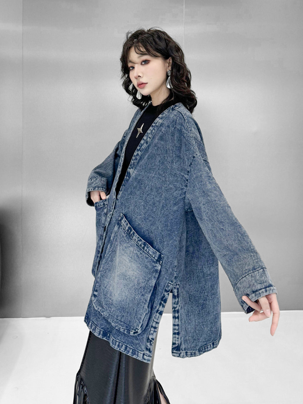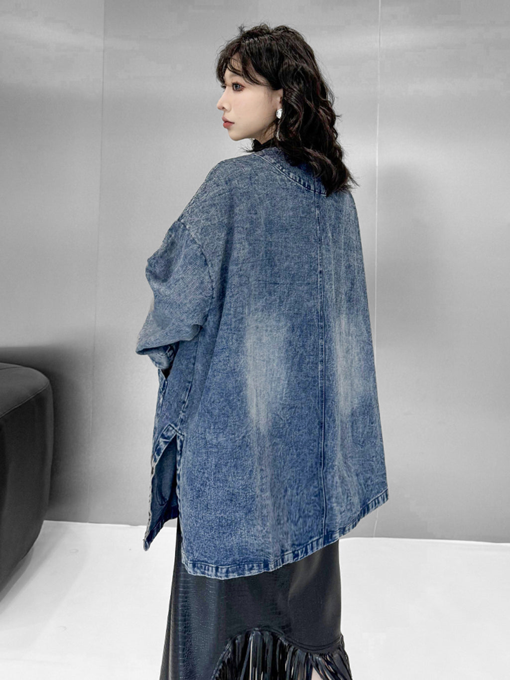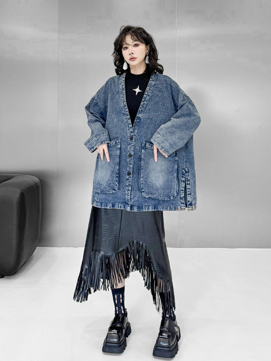 たっぷりとした身幅とドロップショルダーが特徴のルーズシルエットデニムジャケット。フロントはVネック仕様で、インナーを活かしたレイヤードが映える設計。ユーズド感のあるウォッシュ加工がこなれた印象を与え、大ぶりなフロントポケットがアクセントと実用性を兼備。サイドには動きを出すスリット入りで、抜け感を加速。しっかりとしたデニム地ながら、柔らかく肌なじみの良い質感で、ロングシーズン活躍。