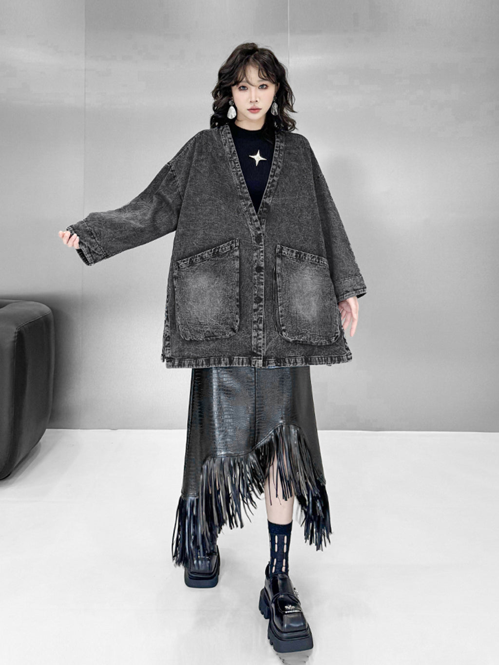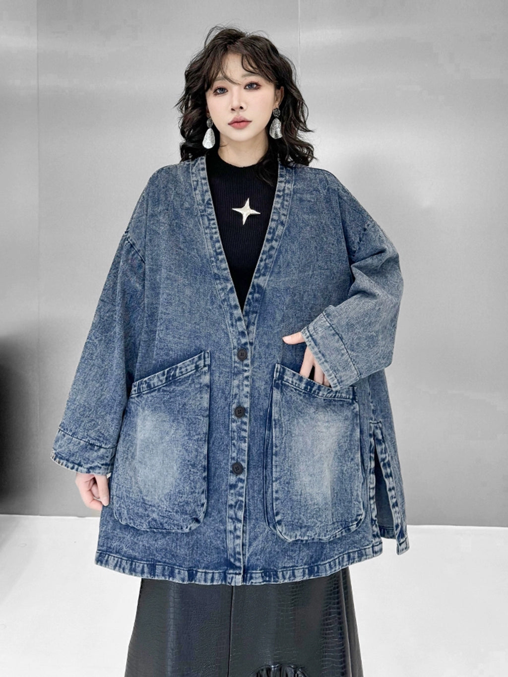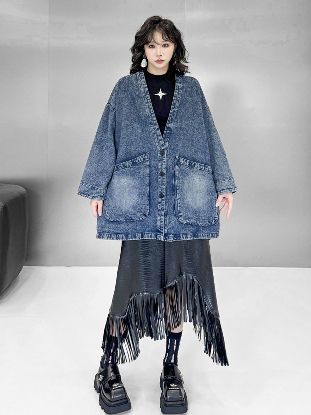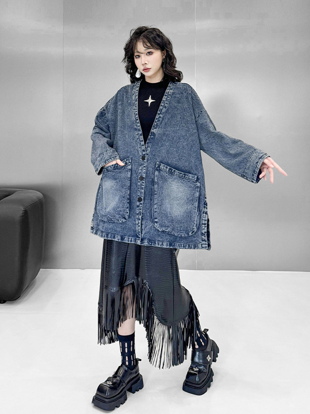 たっぷりとした身幅とドロップショルダーが特徴のルーズシルエットデニムジャケット。フロントはVネック仕様で、インナーを活かしたレイヤードが映える設計。ユーズド感のあるウォッシュ加工がこなれた印象を与え、大ぶりなフロントポケットがアクセントと実用性を兼備。サイドには動きを出すスリット入りで、抜け感を加速。しっかりとしたデニム地ながら、柔らかく肌なじみの良い質感で、ロングシーズン活躍。