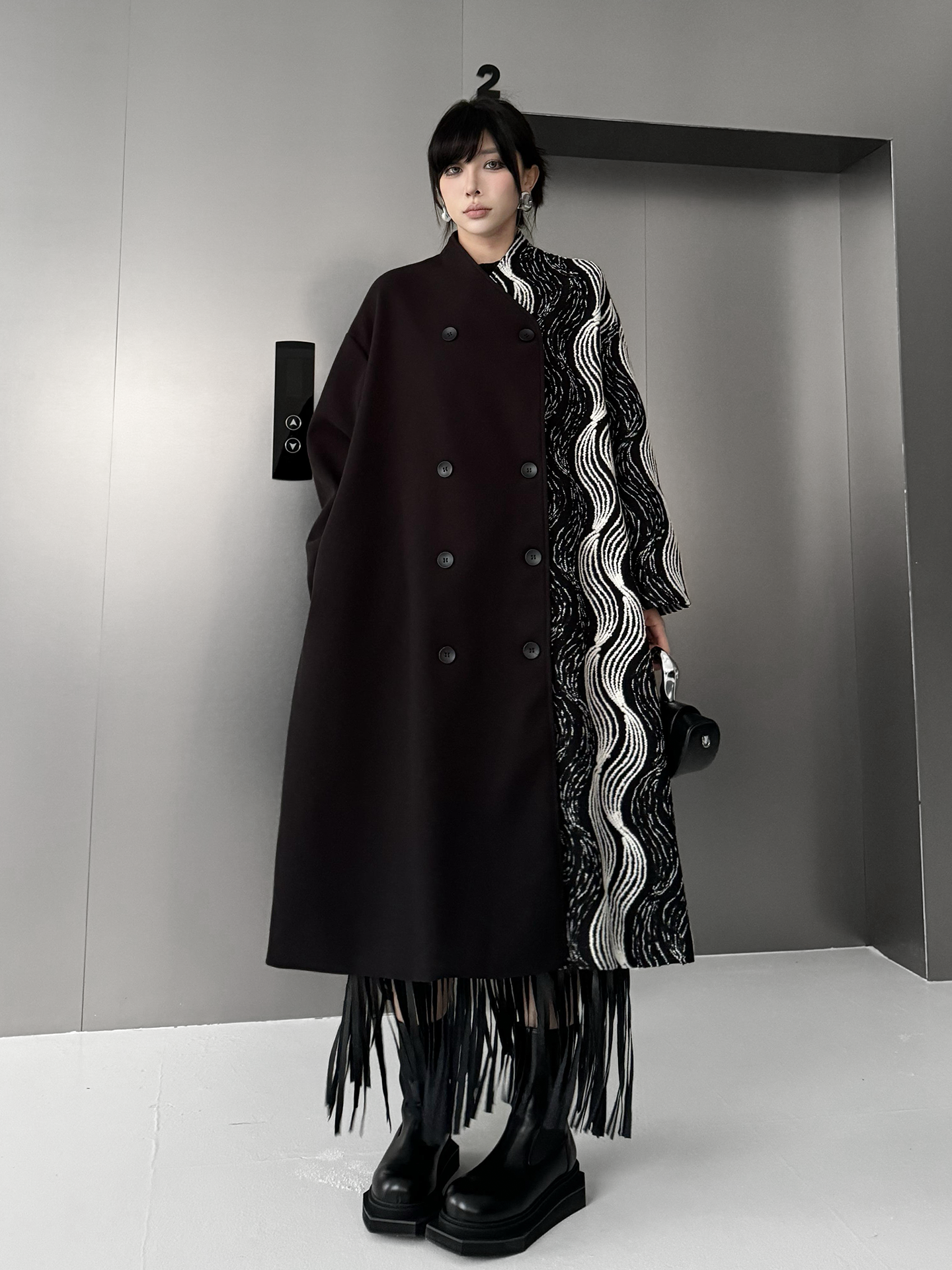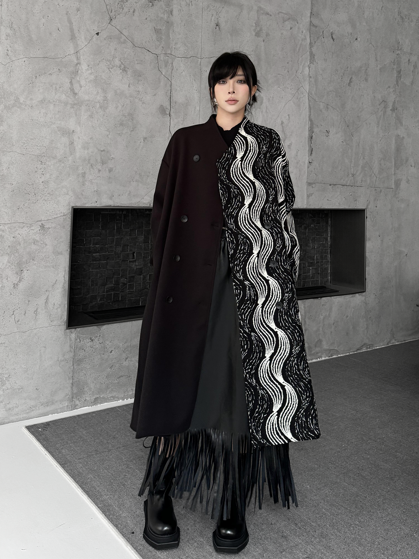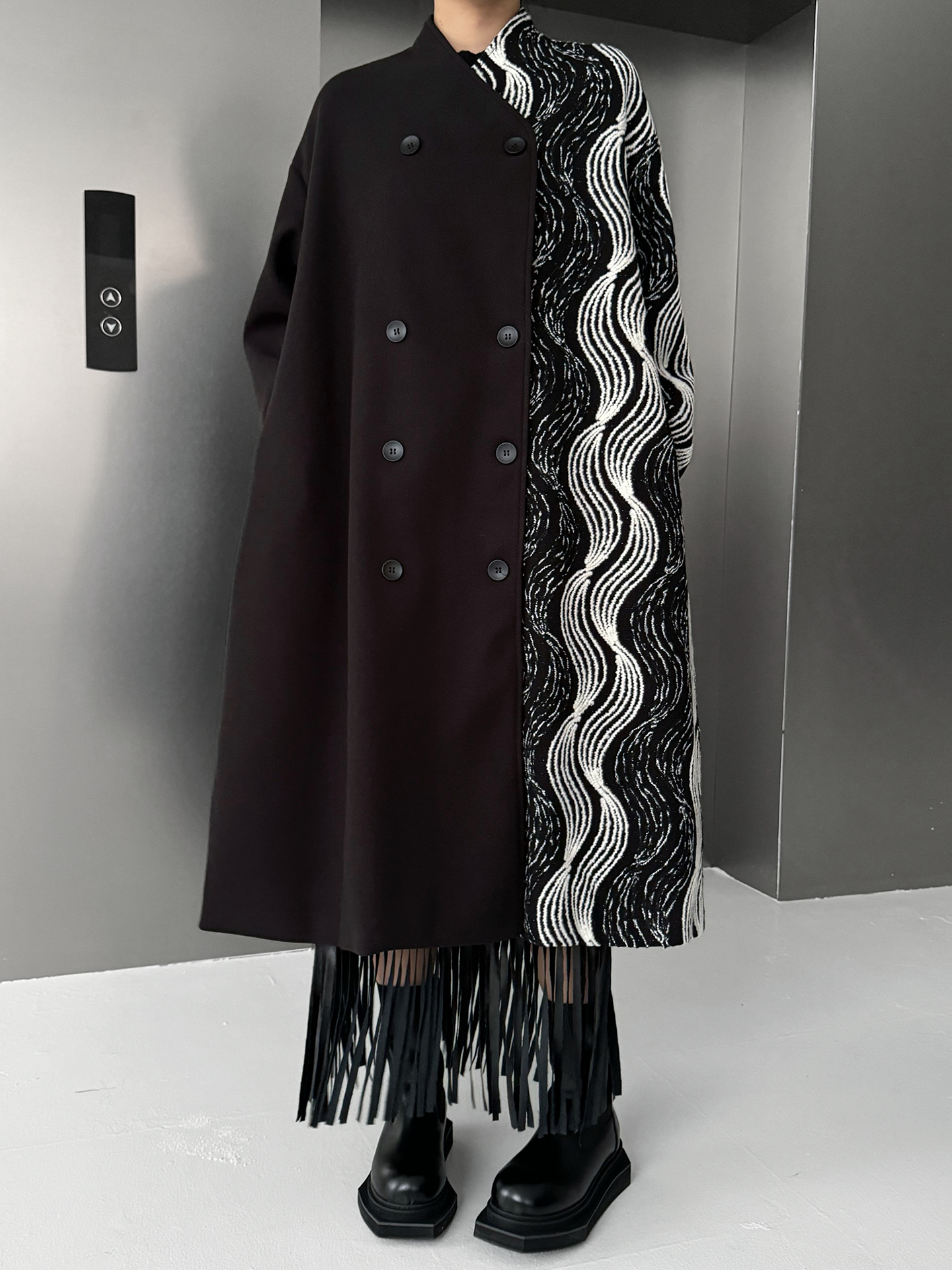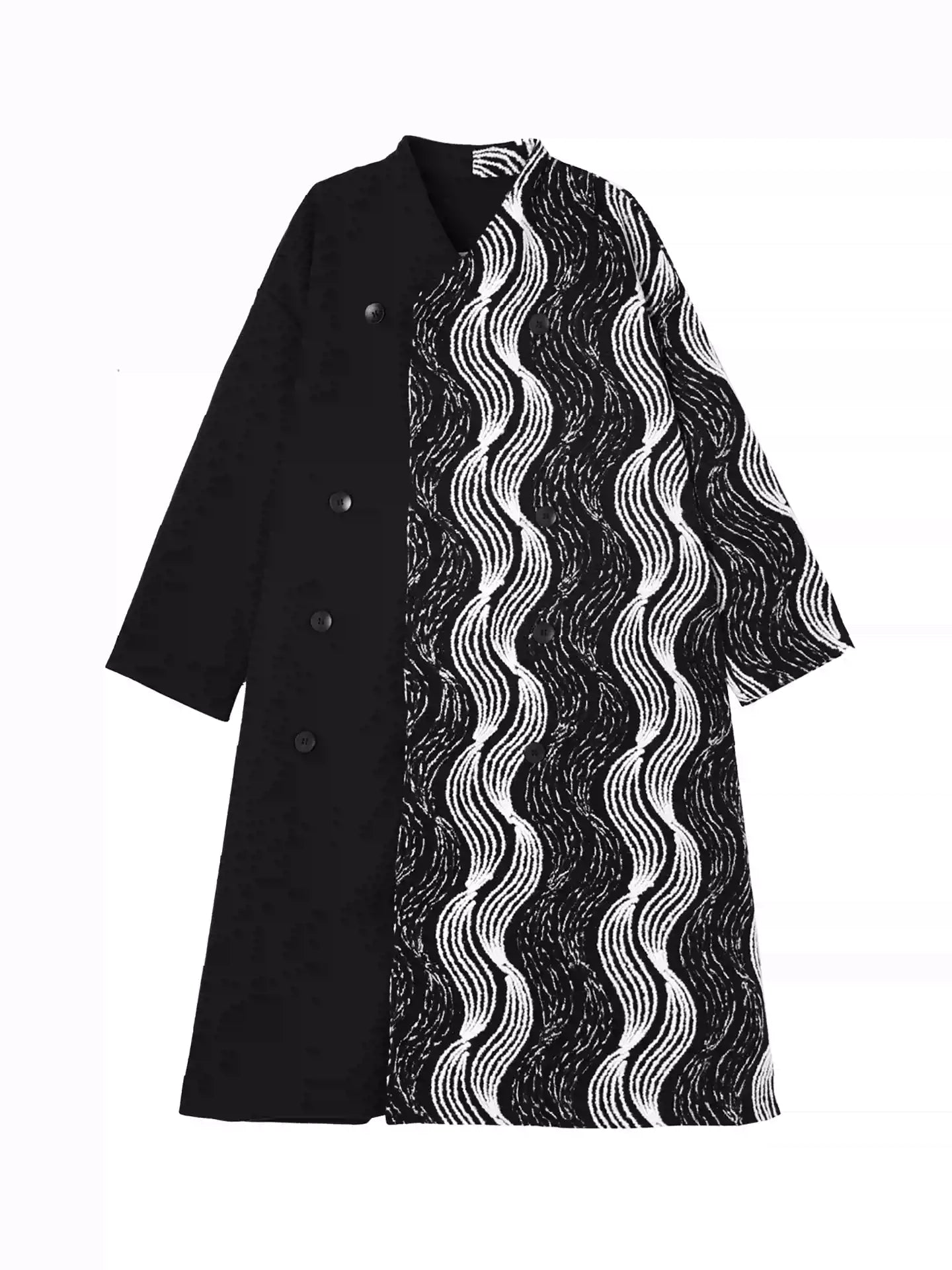 フロントにダブルボタンを備え、片側を大胆なウェーブ模様で切り替えたロングコート。直線的なシルエットと曲線的なパターンのコントラストが視覚的な奥行きを生み出し、洗練された印象を与える。裾にかけての落ち感がシルエットを引き立て、動きに合わせて揺れる表情を楽しめるデザイン。モード感あふれるバランスで、存在感のあるアウタースタイルを構築する。