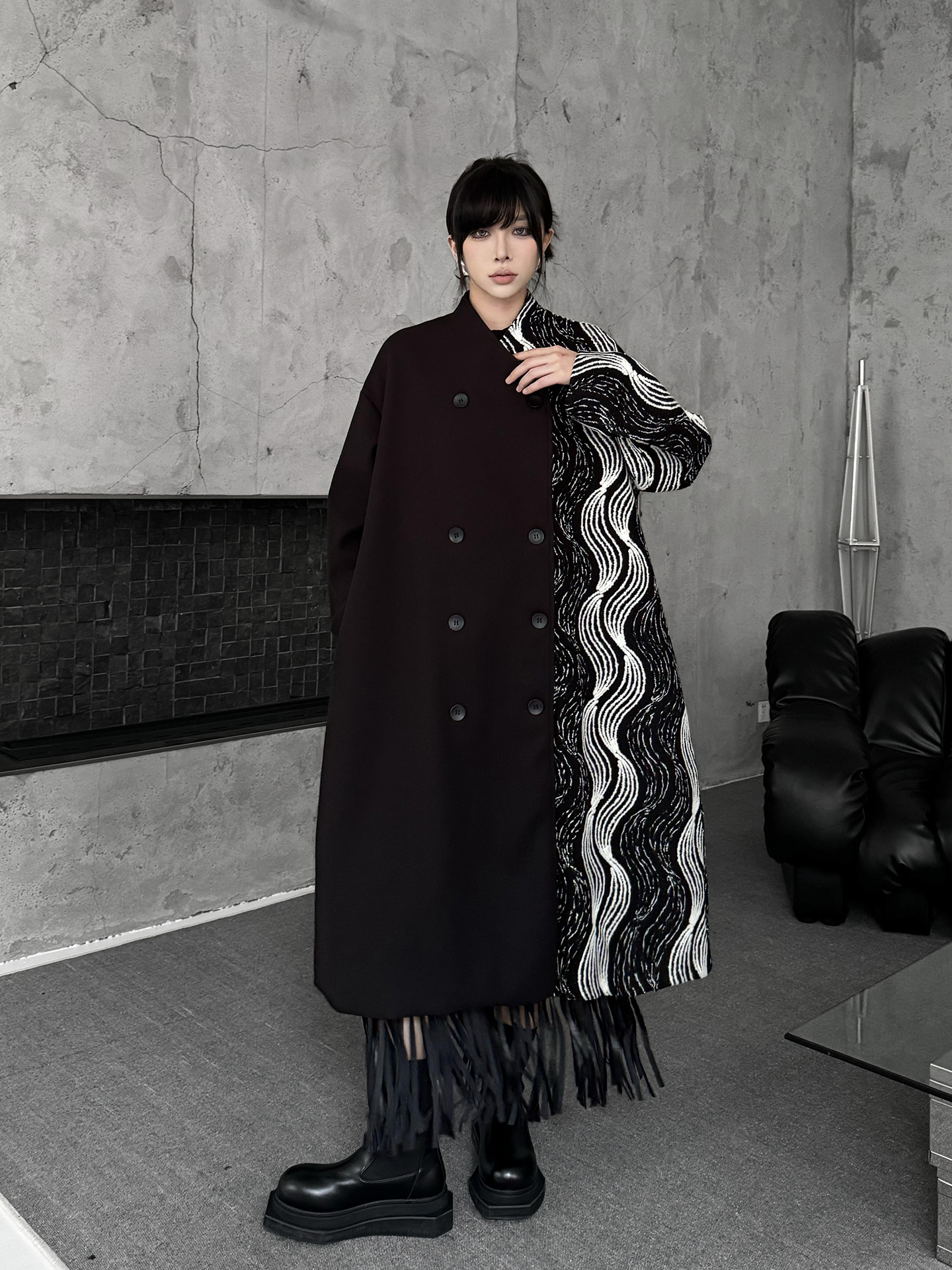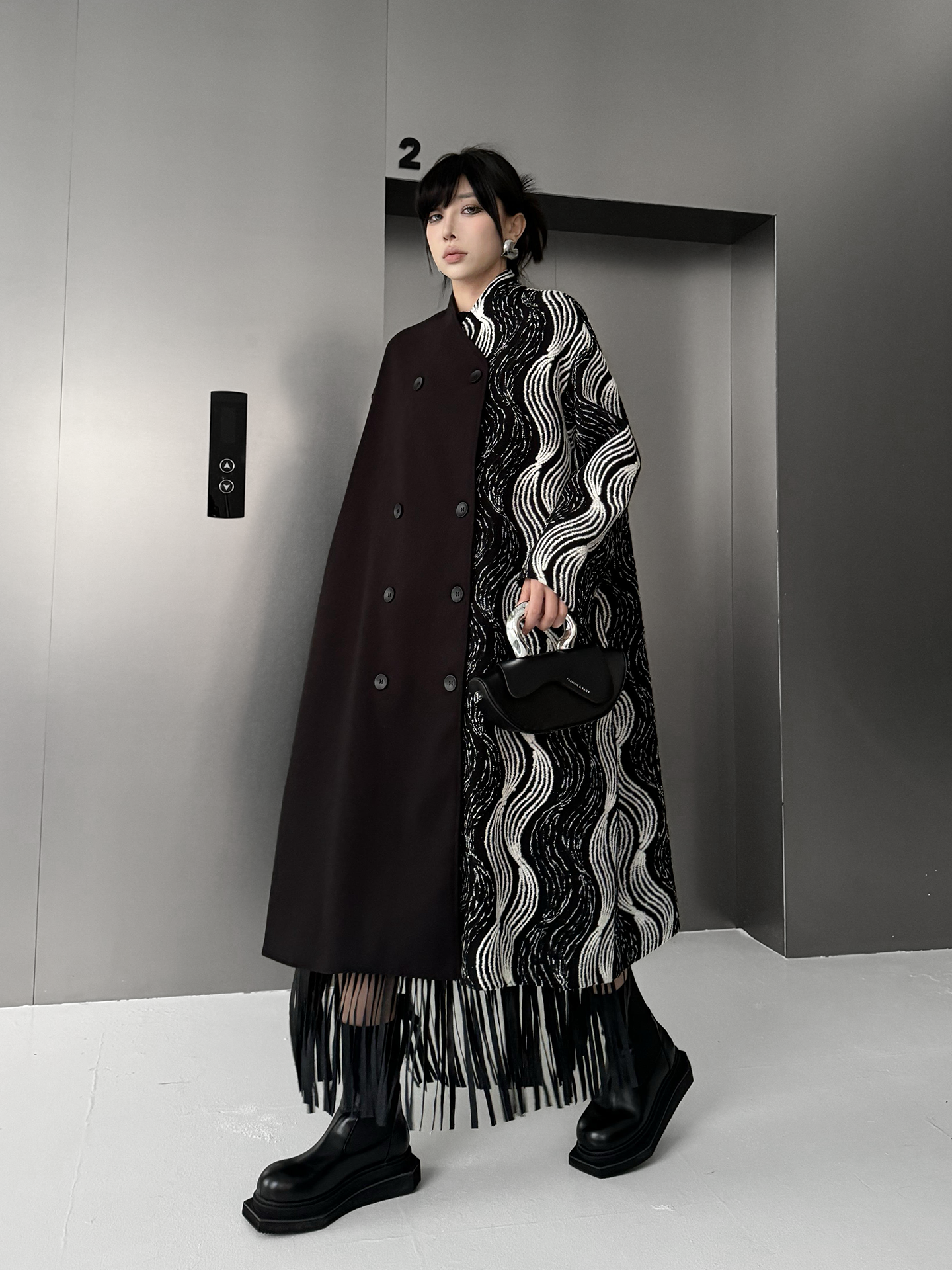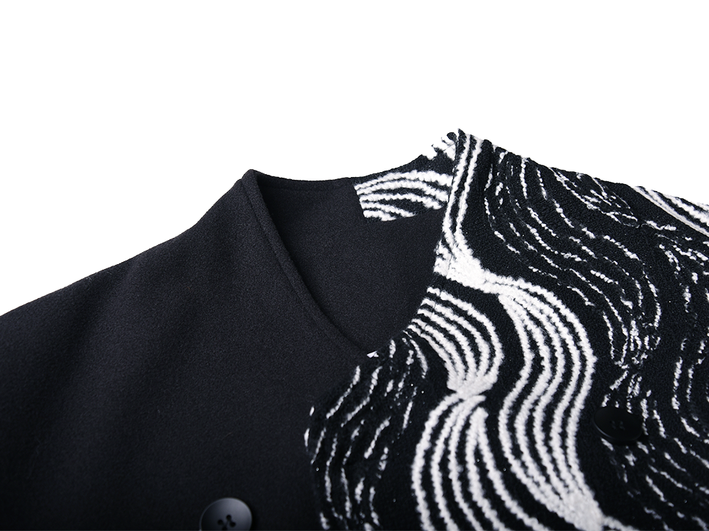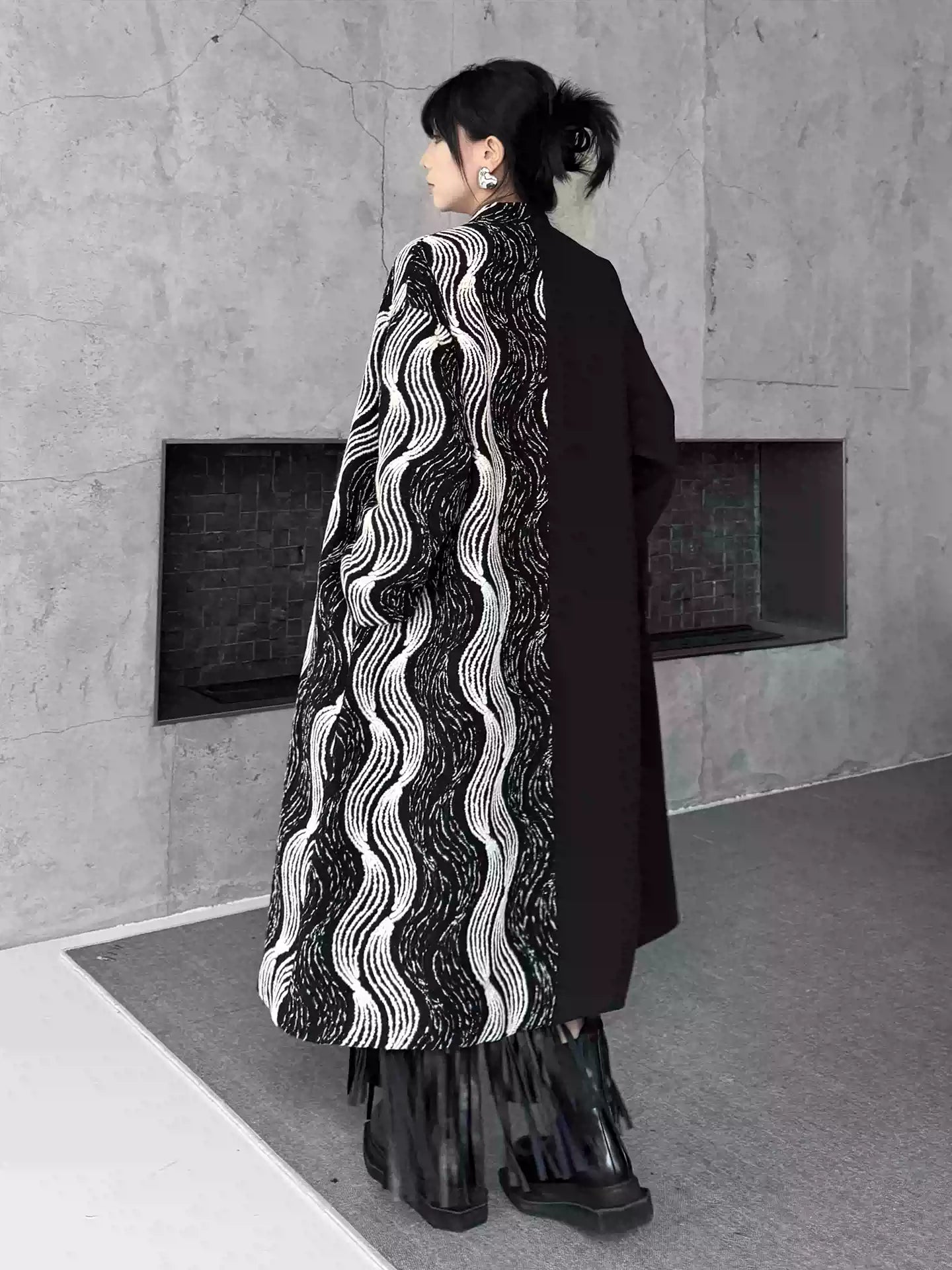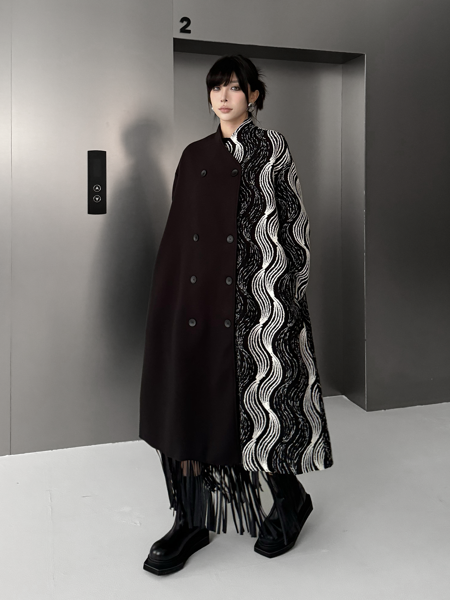 フロントにダブルボタンを備え、片側を大胆なウェーブ模様で切り替えたロングコート。直線的なシルエットと曲線的なパターンのコントラストが視覚的な奥行きを生み出し、洗練された印象を与える。裾にかけての落ち感がシルエットを引き立て、動きに合わせて揺れる表情を楽しめるデザイン。モード感あふれるバランスで、存在感のあるアウタースタイルを構築する。