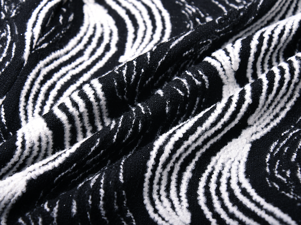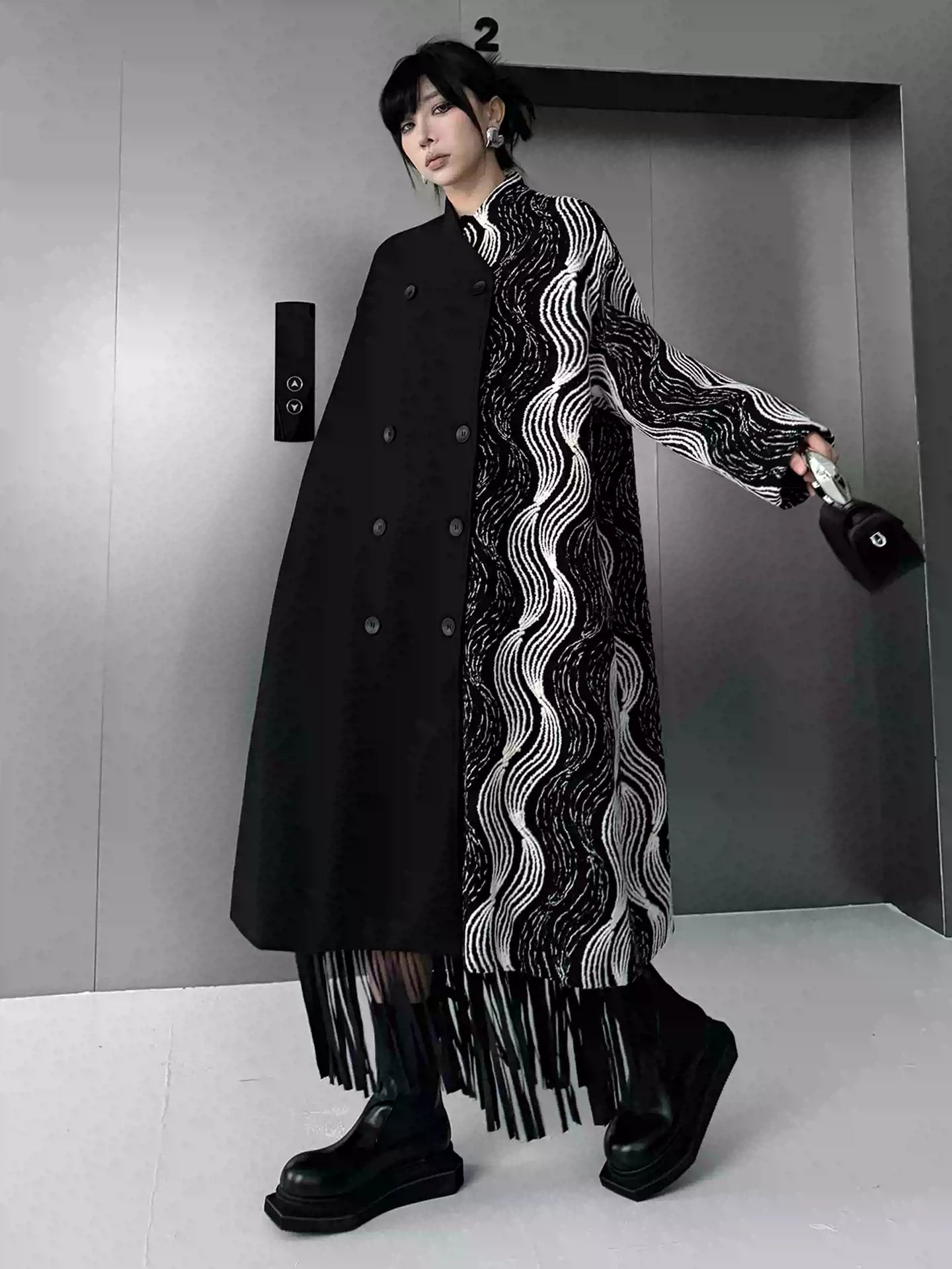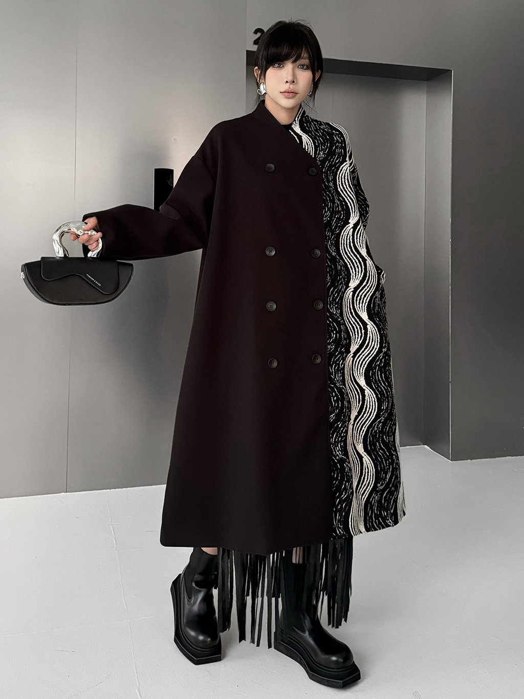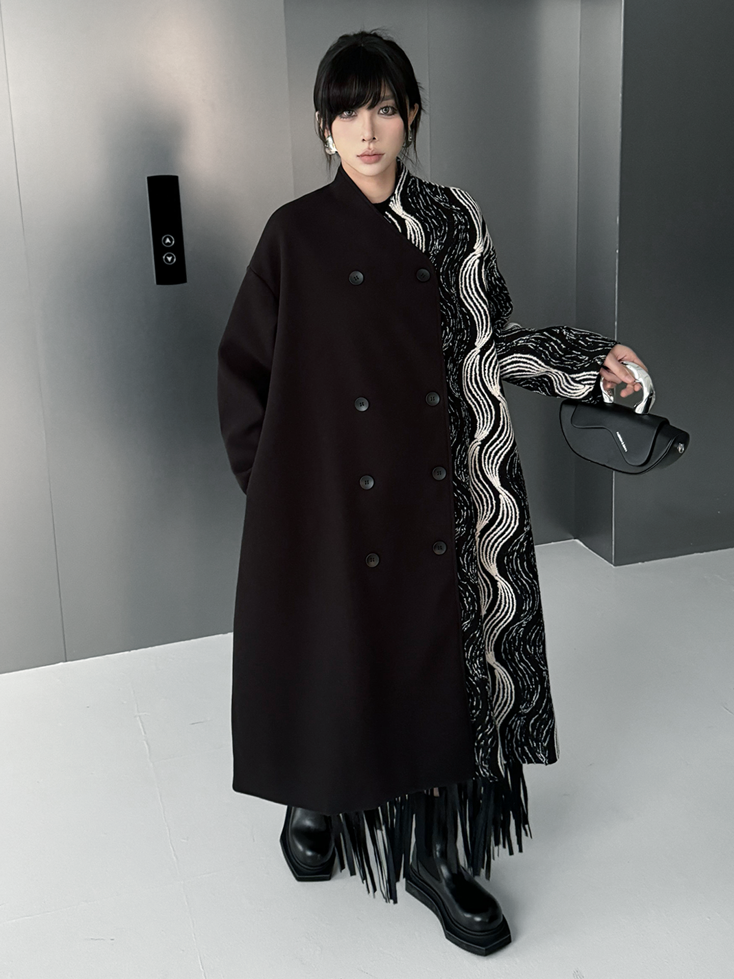 フロントにダブルボタンを備え、片側を大胆なウェーブ模様で切り替えたロングコート。直線的なシルエットと曲線的なパターンのコントラストが視覚的な奥行きを生み出し、洗練された印象を与える。裾にかけての落ち感がシルエットを引き立て、動きに合わせて揺れる表情を楽しめるデザイン。モード感あふれるバランスで、存在感のあるアウタースタイルを構築する。