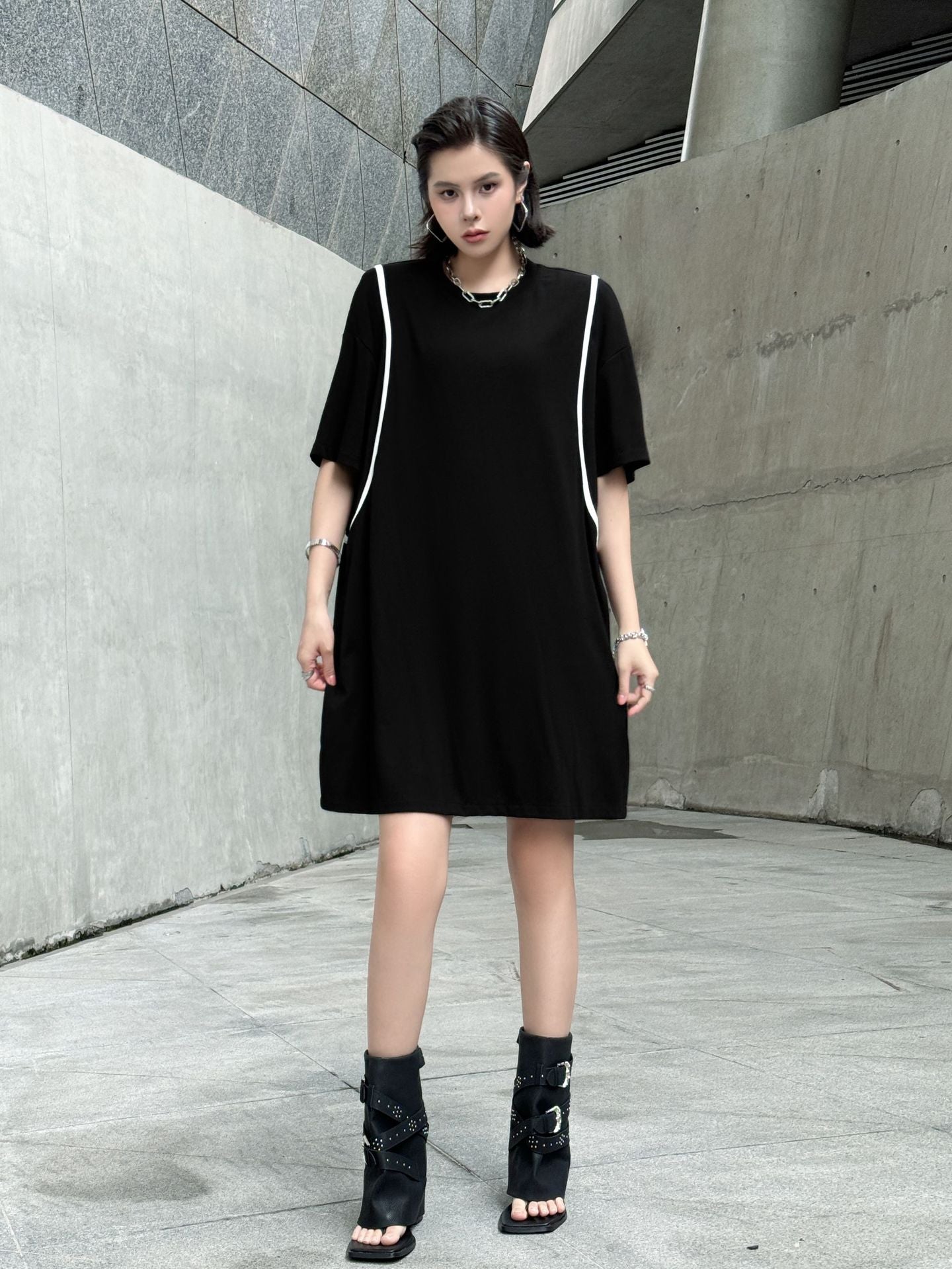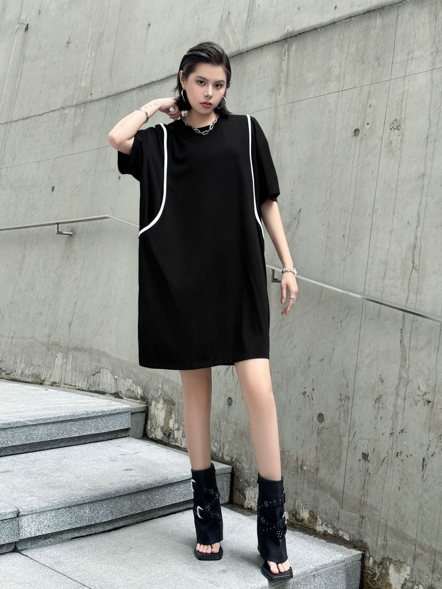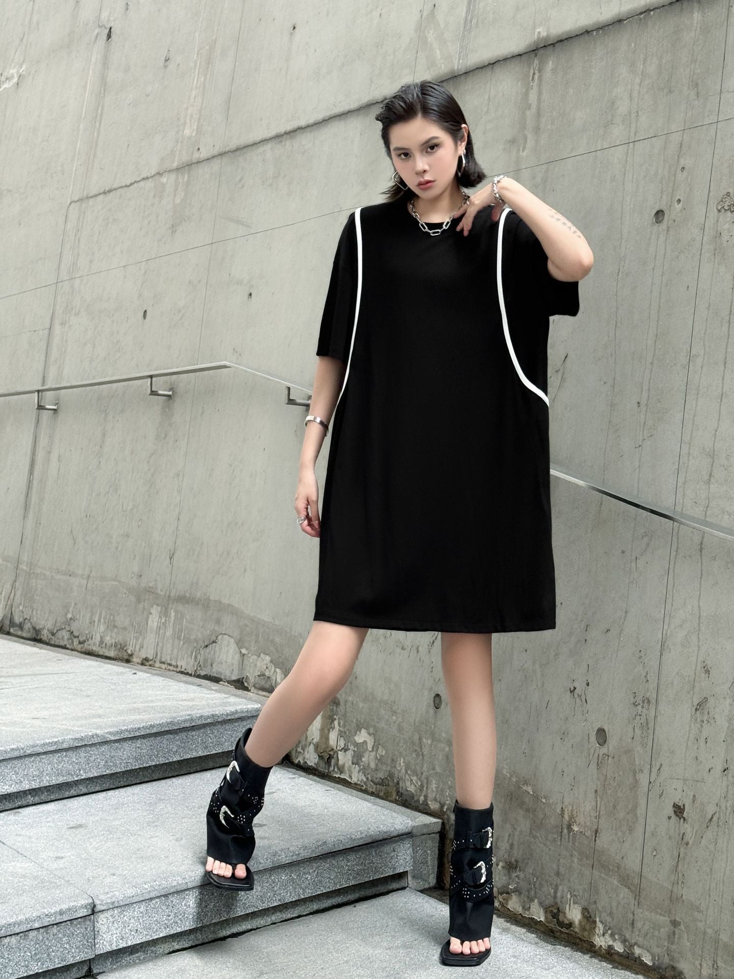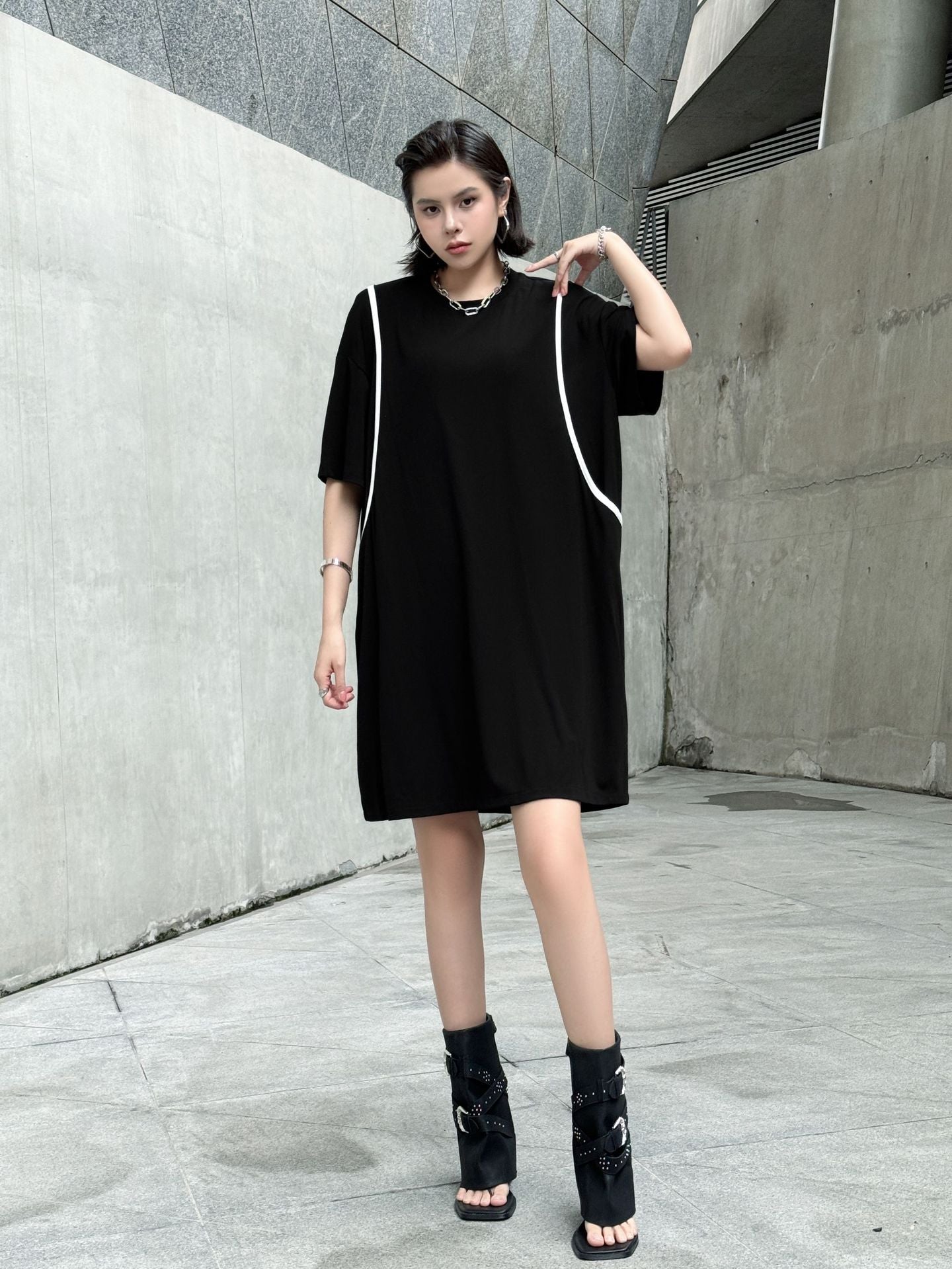 直線的なホワイトラインが印象的なブラックドレス。肩を落としたドロップショルダーにゆとりのある身幅がストリート感を演出し、短め丈で軽やかさもプラス。ローンコットン特有の柔らかさと軽さがあり、シルエットをふわりと引き立てる。背面までラインが回り込み、360度抜かりないデザインが特徴。