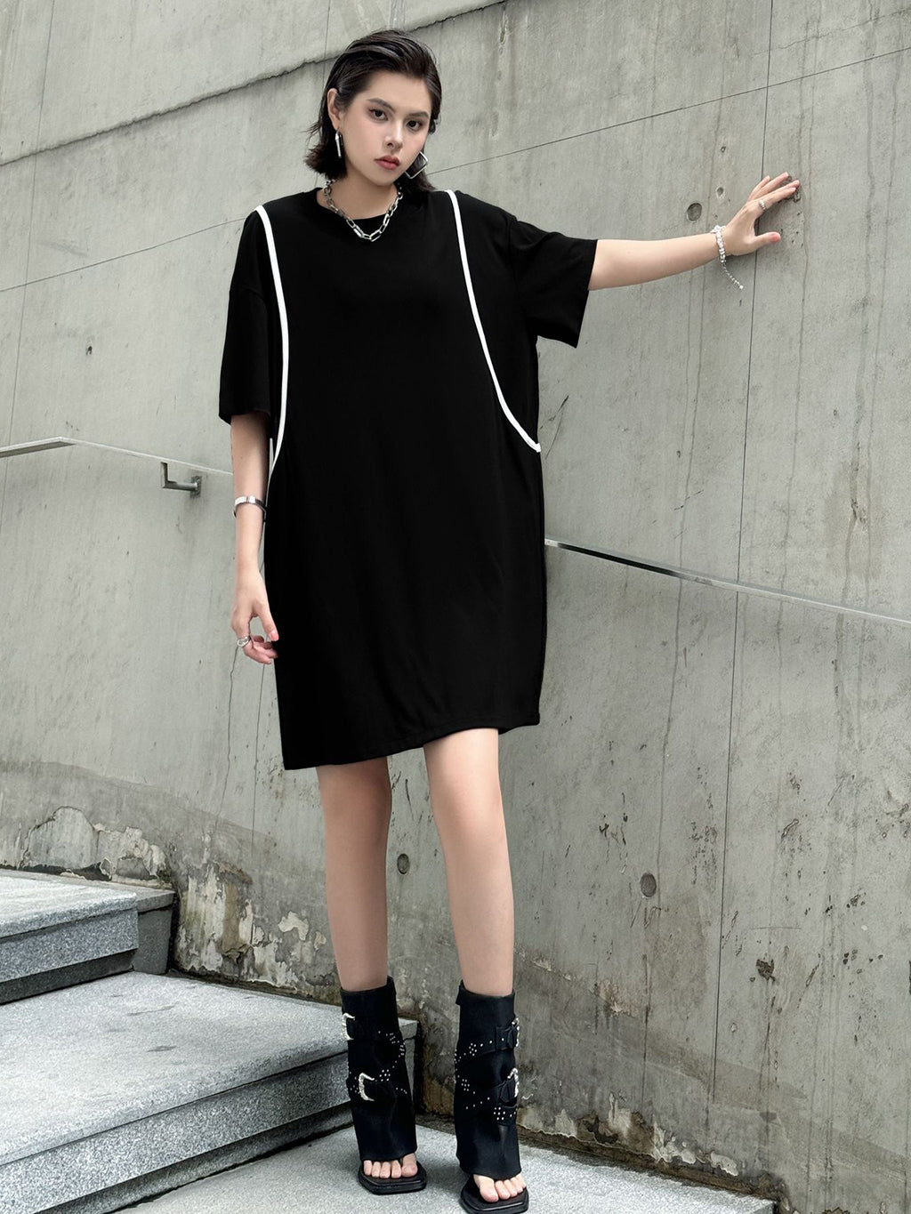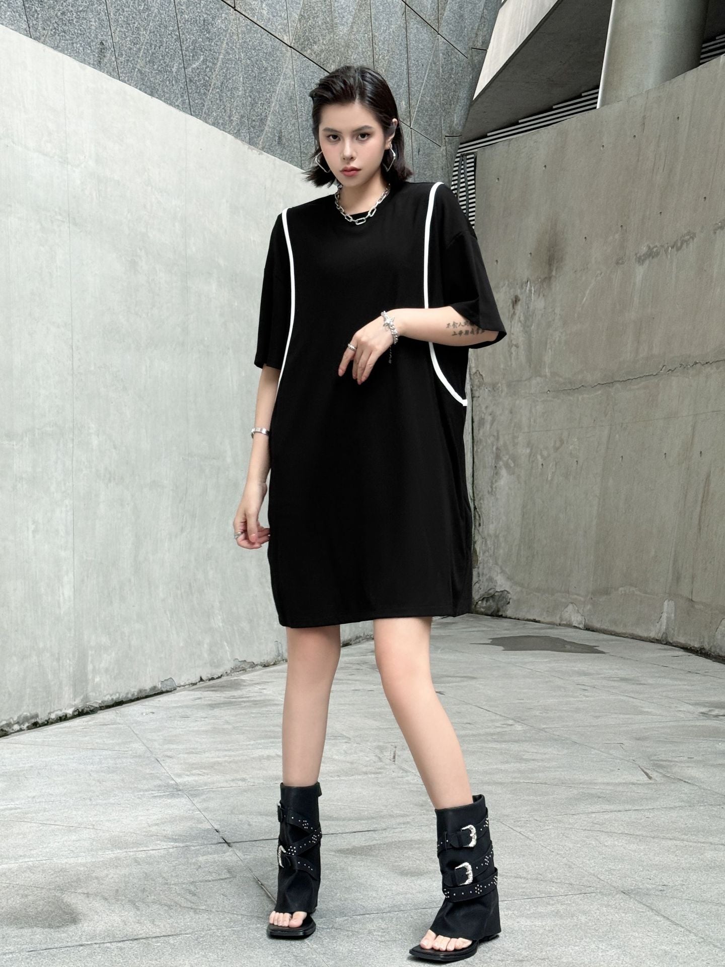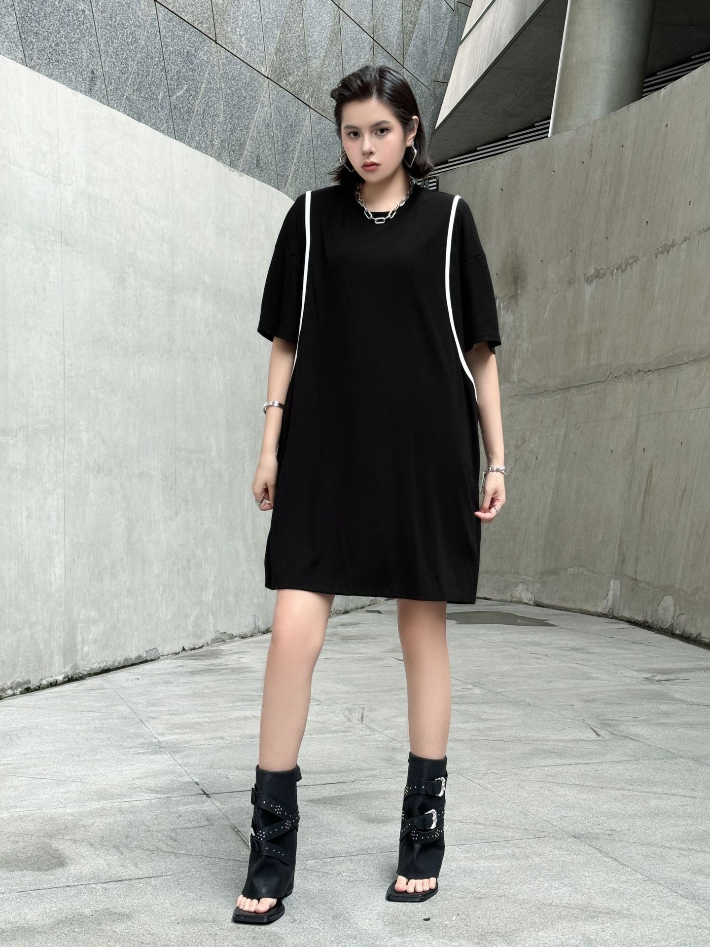 直線的なホワイトラインが印象的なブラックドレス。肩を落としたドロップショルダーにゆとりのある身幅がストリート感を演出し、短め丈で軽やかさもプラス。ローンコットン特有の柔らかさと軽さがあり、シルエットをふわりと引き立てる。背面までラインが回り込み、360度抜かりないデザインが特徴。