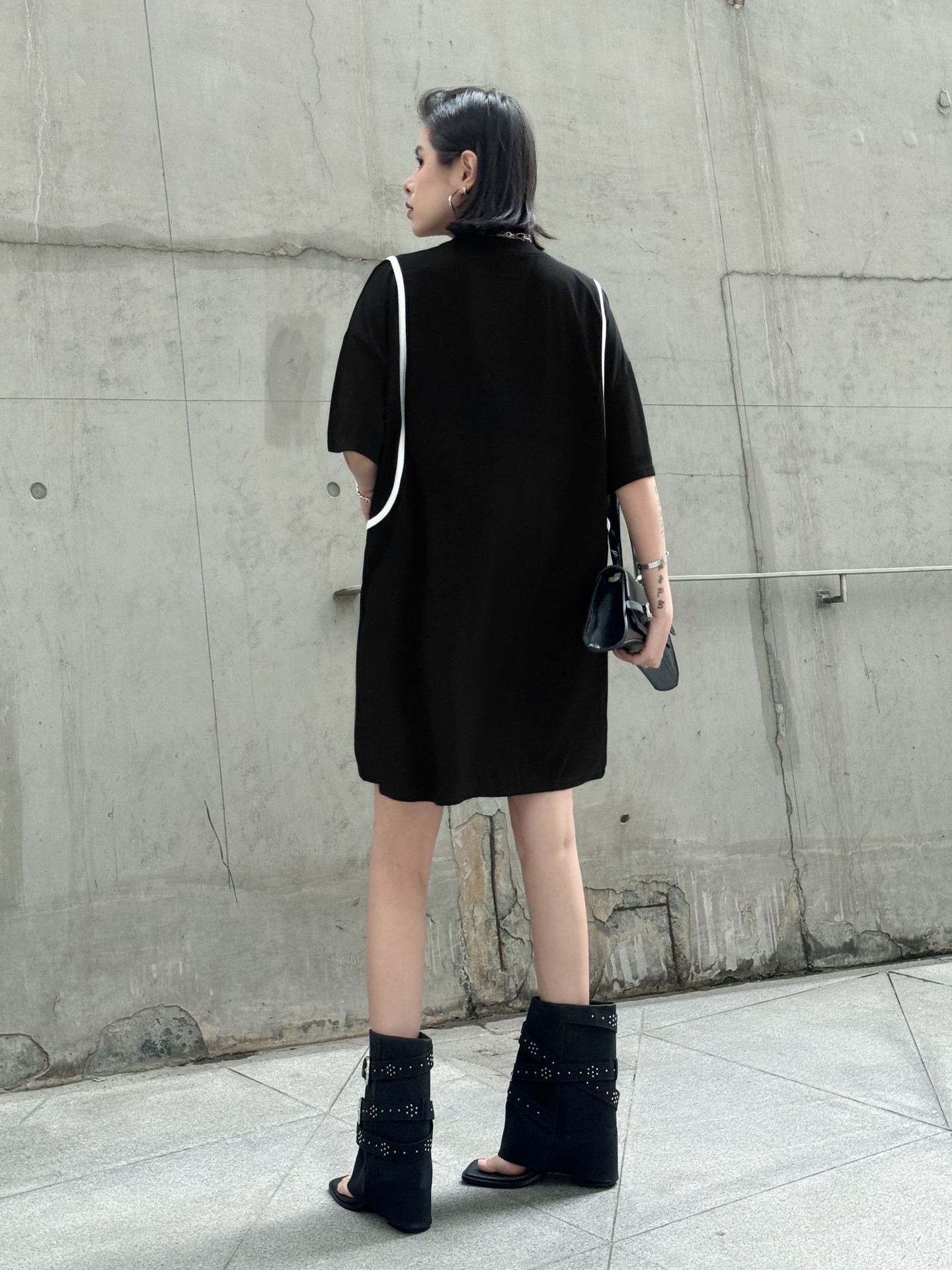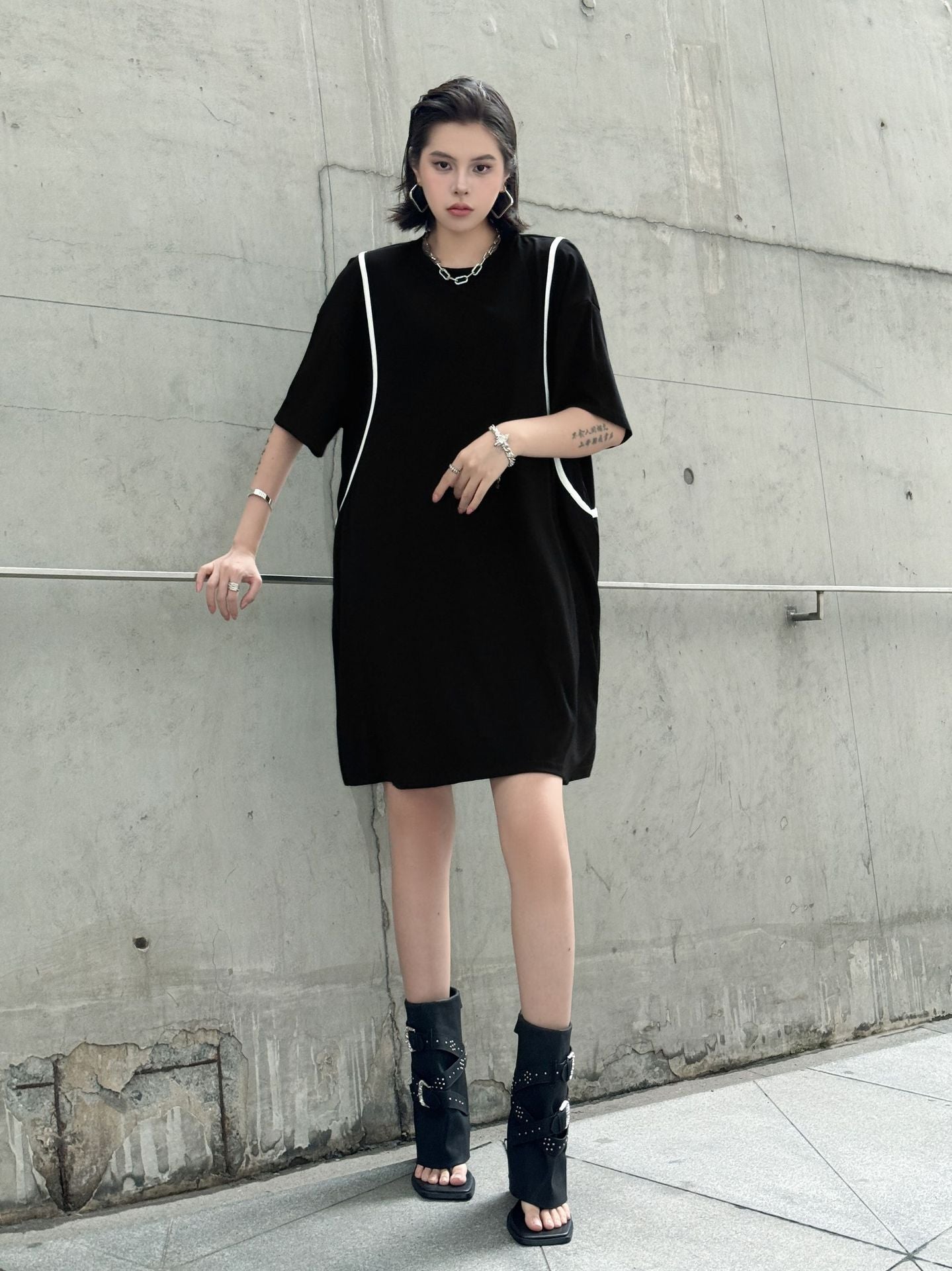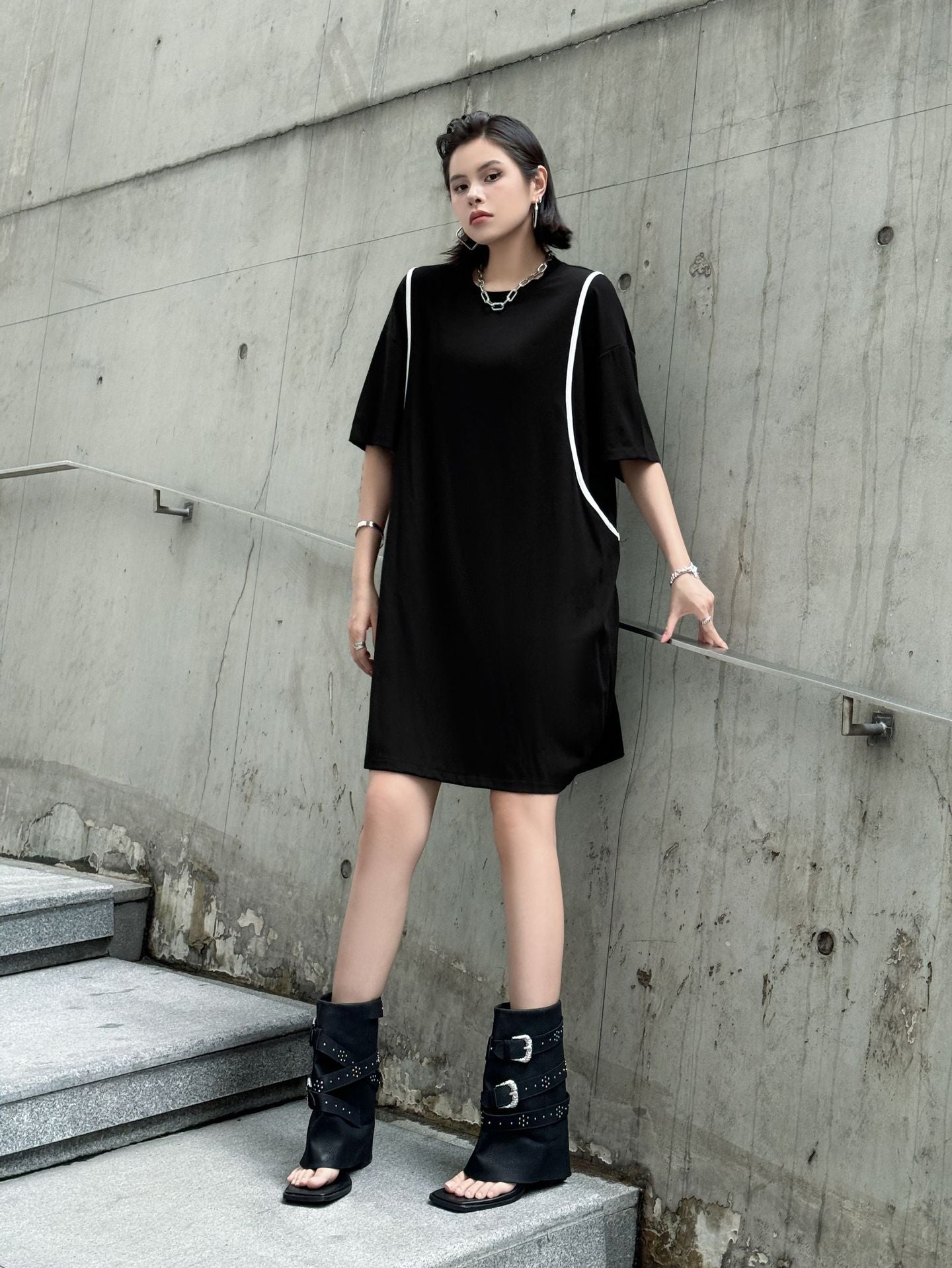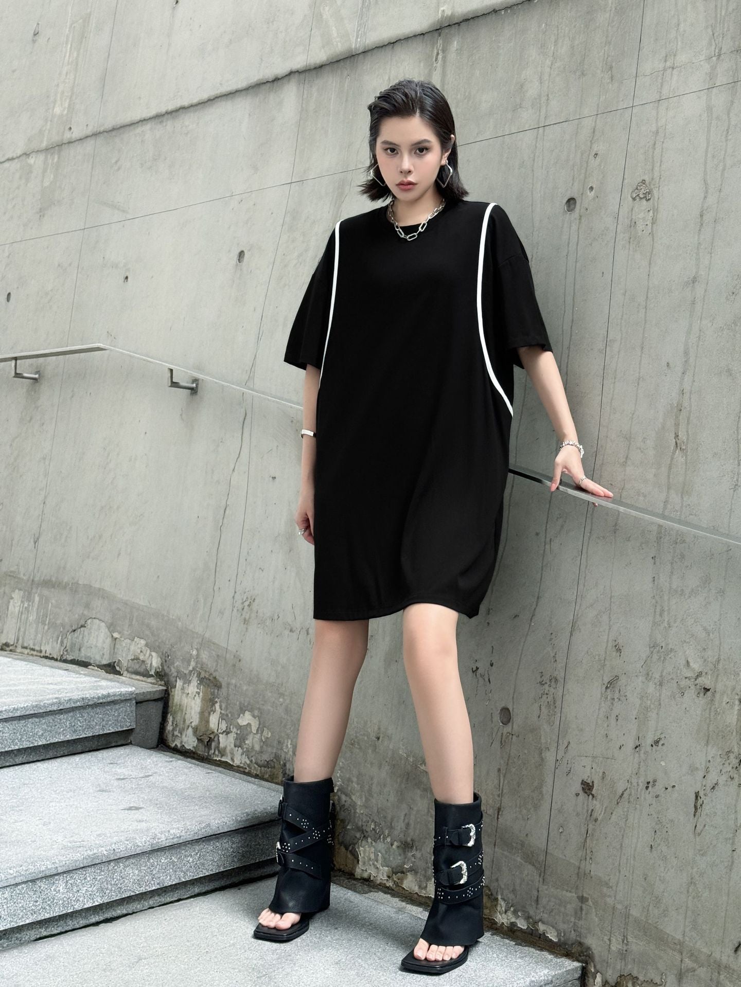 直線的なホワイトラインが印象的なブラックドレス。肩を落としたドロップショルダーにゆとりのある身幅がストリート感を演出し、短め丈で軽やかさもプラス。ローンコットン特有の柔らかさと軽さがあり、シルエットをふわりと引き立てる。背面までラインが回り込み、360度抜かりないデザインが特徴。
