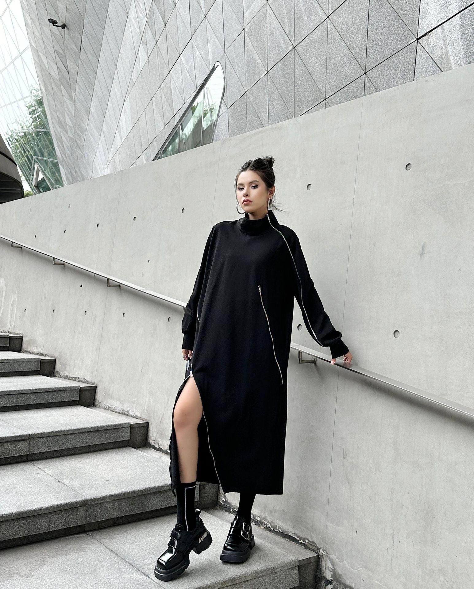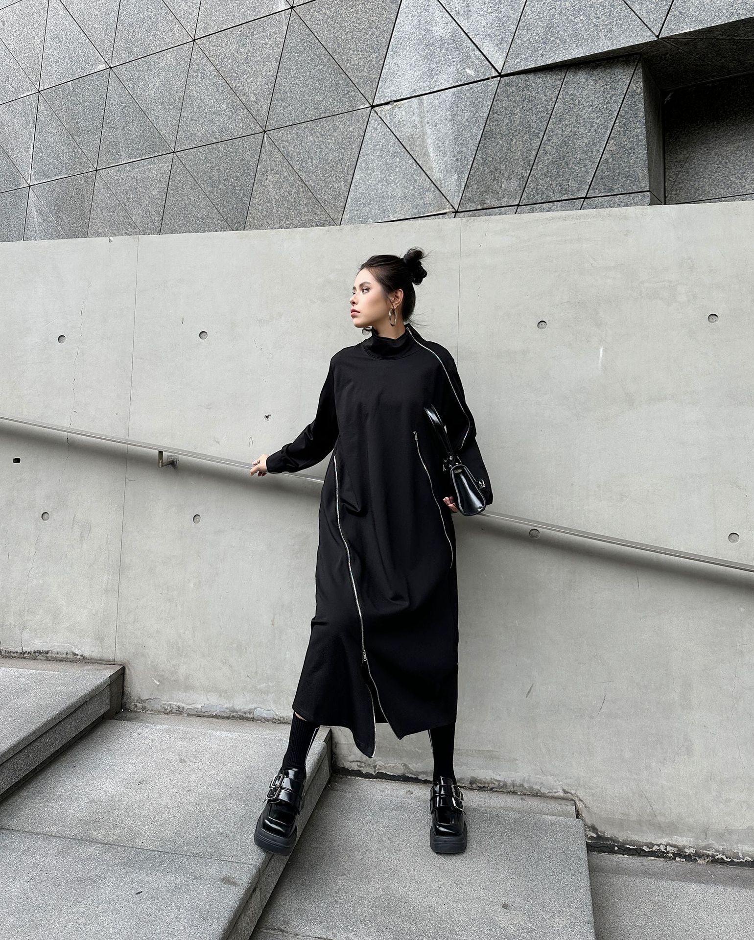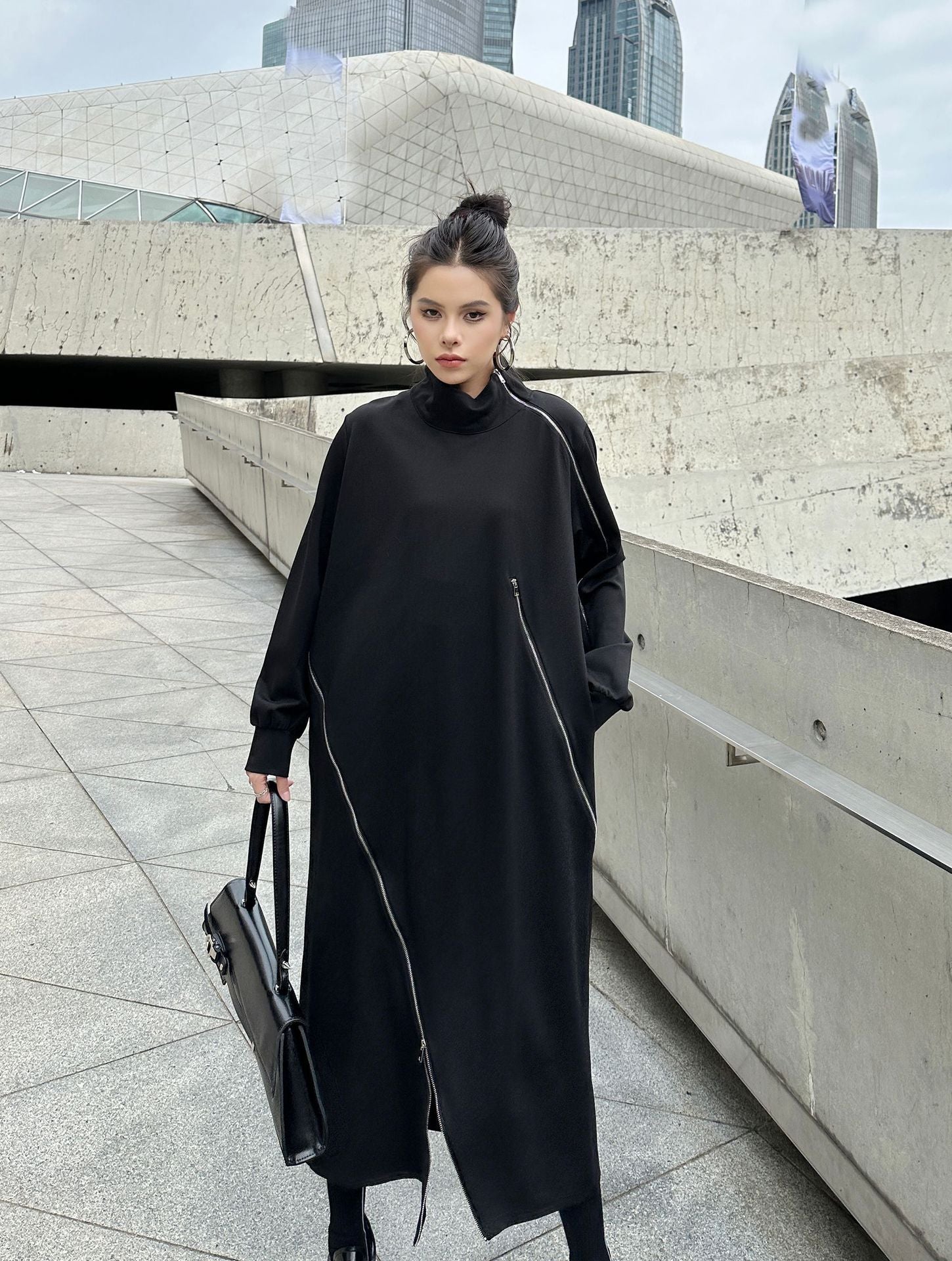 立体的なハイネックラインと大胆なジップが印象的なロングドレス。肩を落としたリラックスフォルムで、ボディラインを拾わずモードな佇まいを描く。ジップを開閉することでスリットを調整でき、スタイリングの幅を広げることができる。厚みのある羅馬綿素材が美しい落ち感を生み、シンプルながら構築的なデザインに仕上がっている。