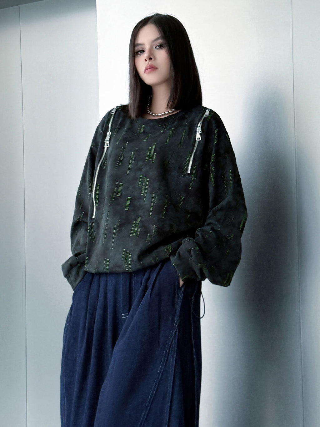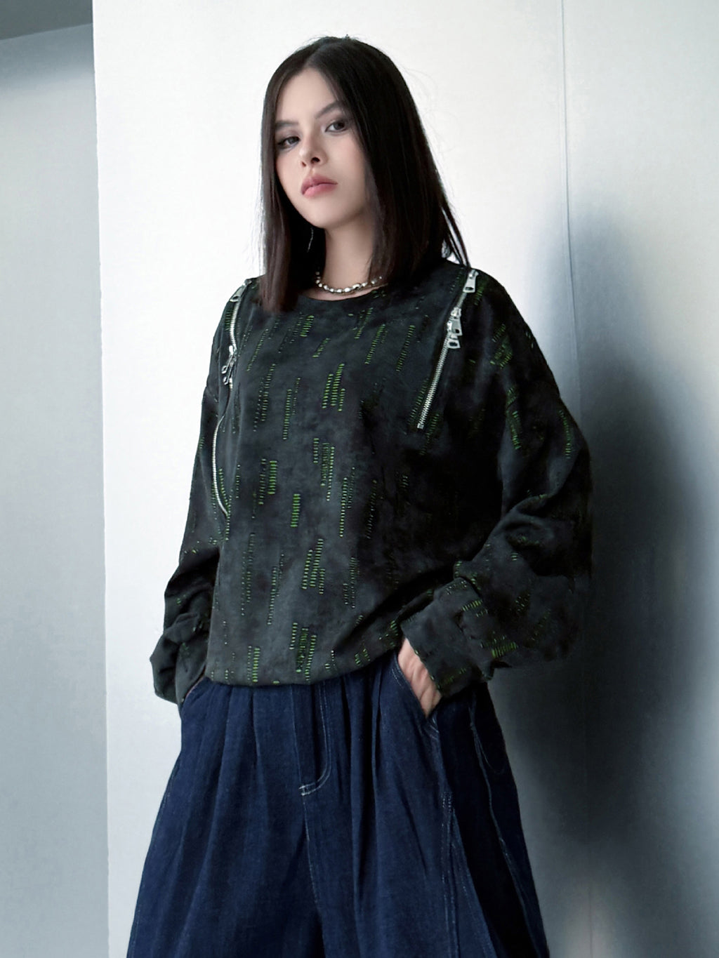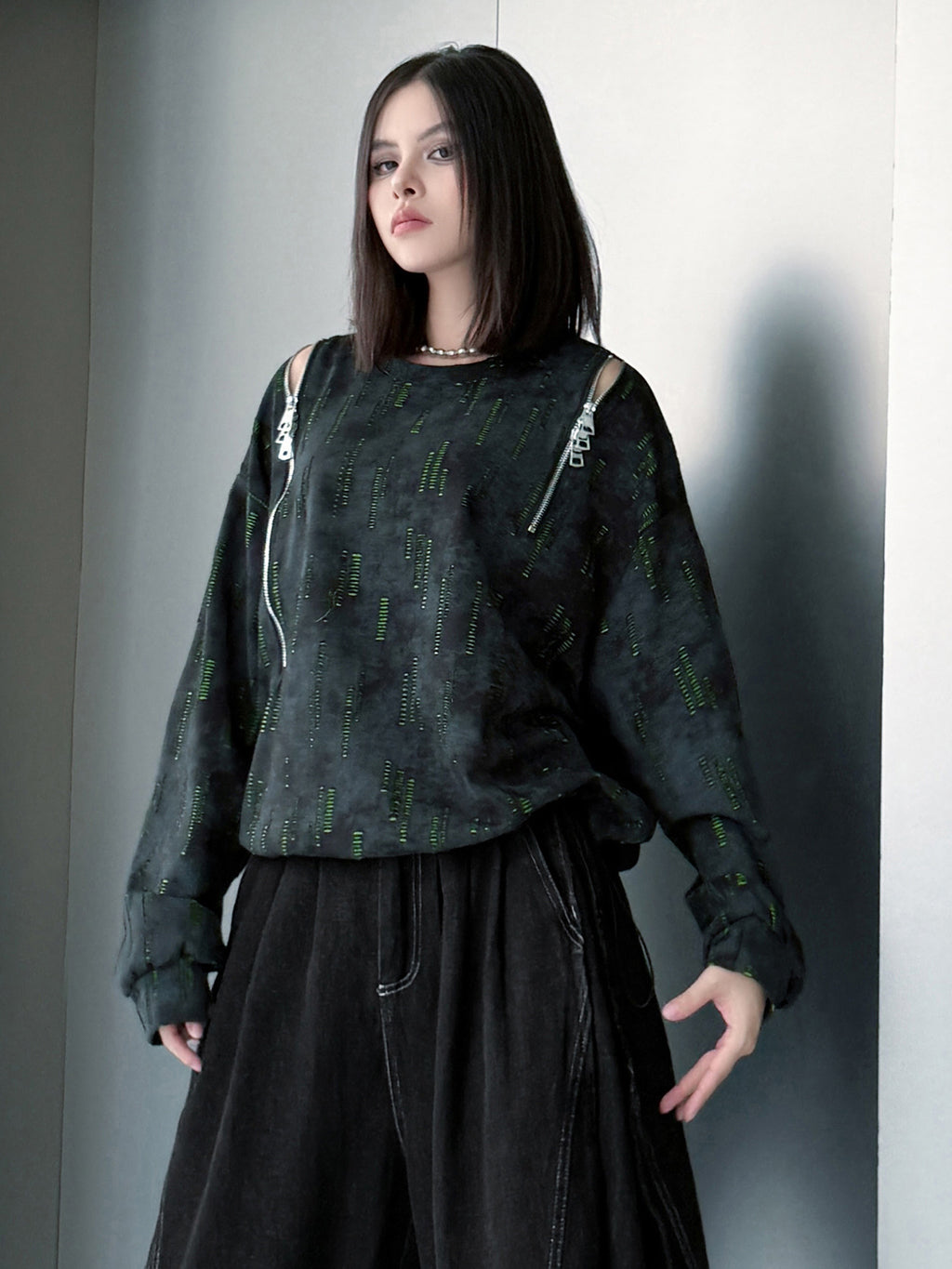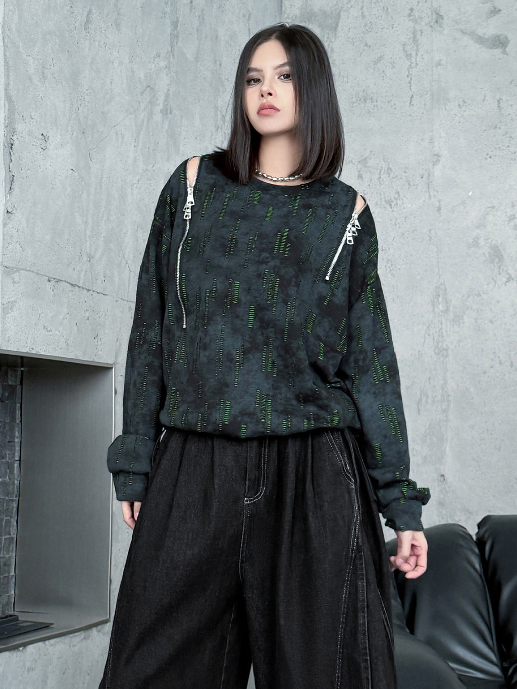 全体に縦方向のプリントパターンを施したルーズフィットトップ。ショルダー部分には開閉可能なメタルジップを配置し、シルエットや肌見せのバランスを自由に調整できる構造。軽量なコットン混素材を採用し、ほどよいハリと柔らかさを両立。裾のドローストリングでシルエット変化も楽しめる。シックなトーンの中に浮かぶグリーンのアクセントが印象的で、インダストリアルな空気を纏った一着。