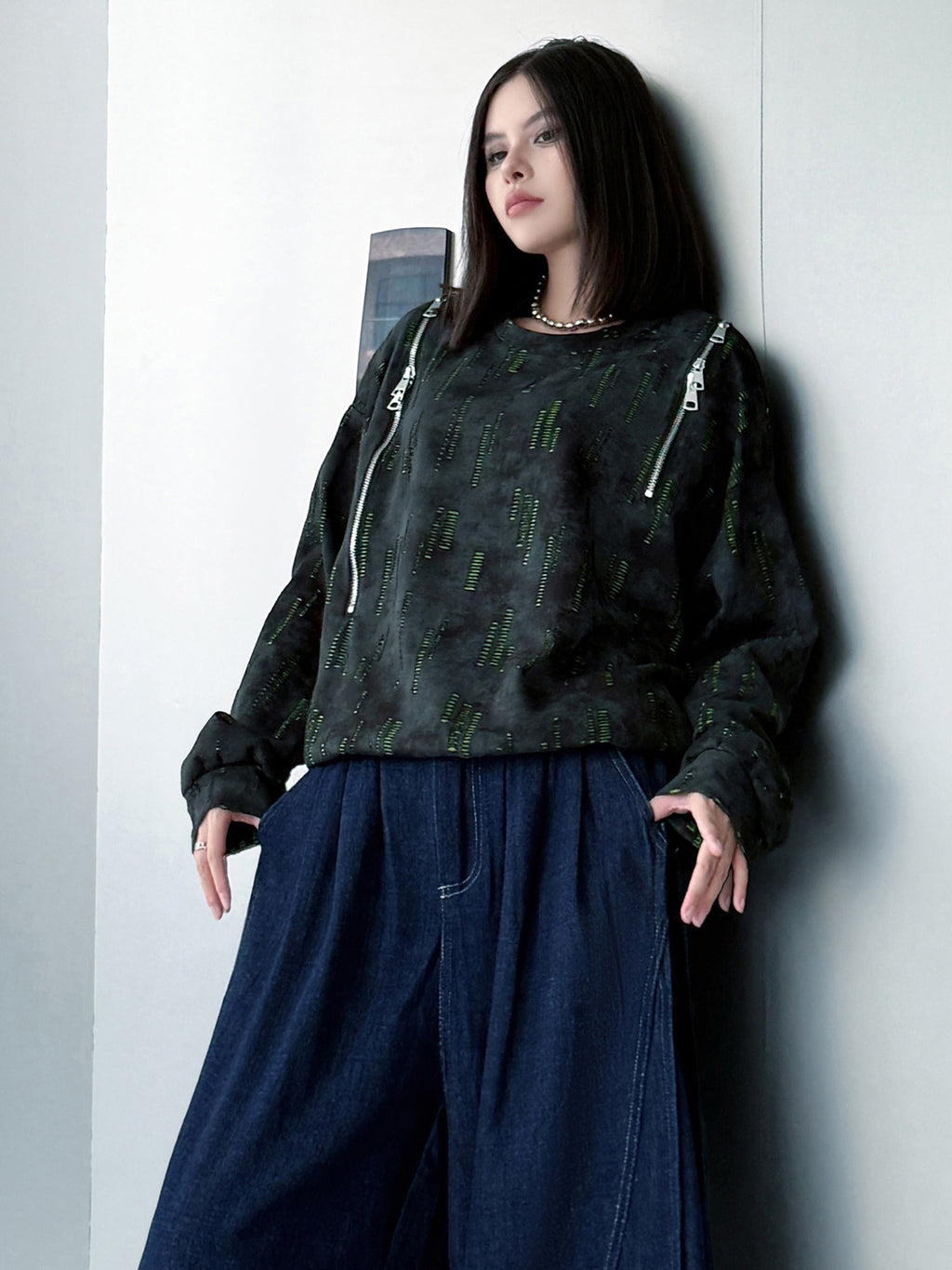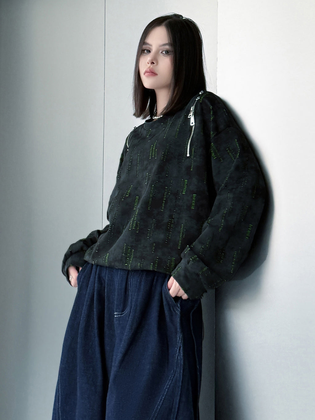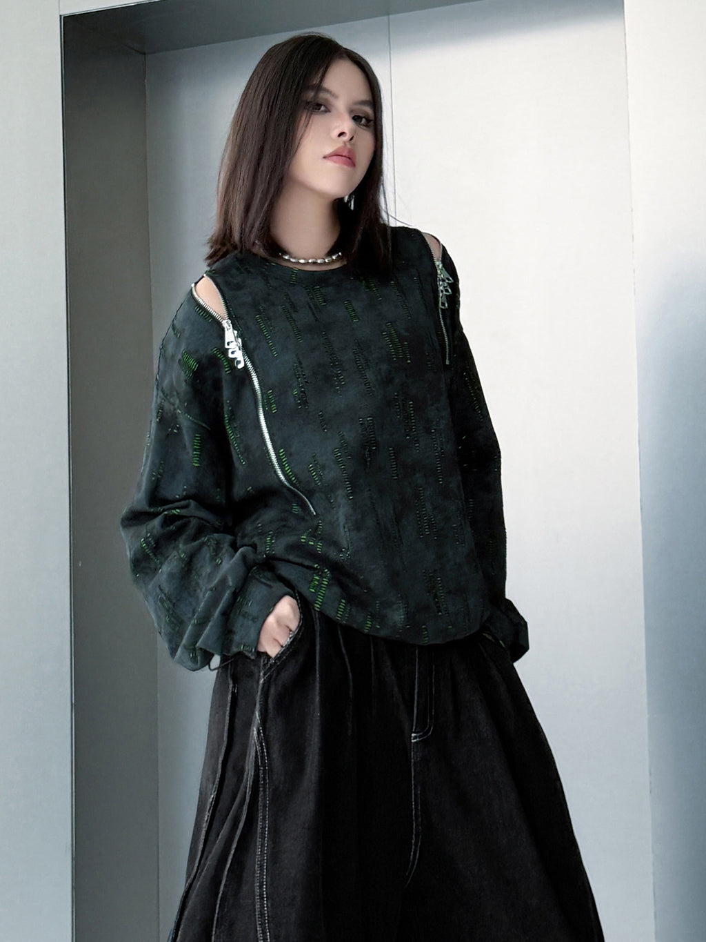 全体に縦方向のプリントパターンを施したルーズフィットトップ。ショルダー部分には開閉可能なメタルジップを配置し、シルエットや肌見せのバランスを自由に調整できる構造。軽量なコットン混素材を採用し、ほどよいハリと柔らかさを両立。裾のドローストリングでシルエット変化も楽しめる。シックなトーンの中に浮かぶグリーンのアクセントが印象的で、インダストリアルな空気を纏った一着。