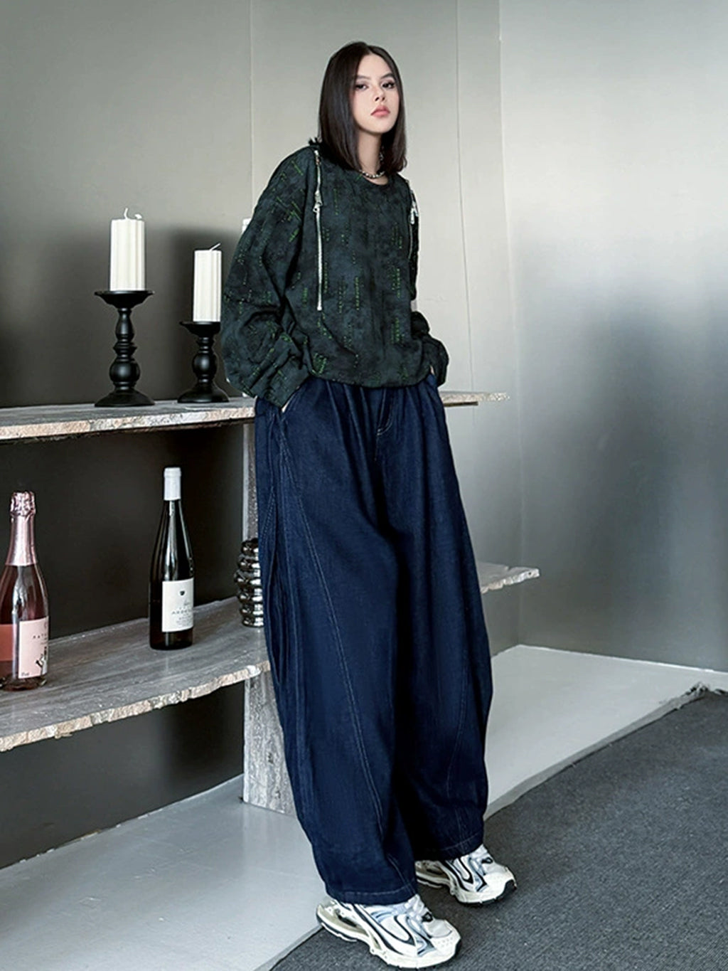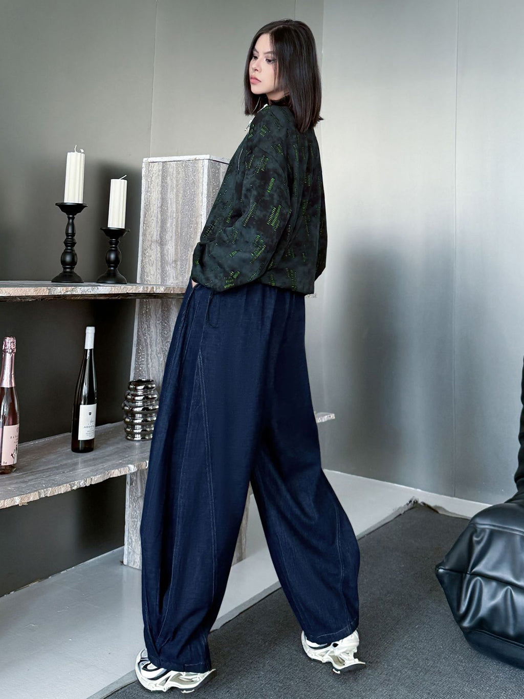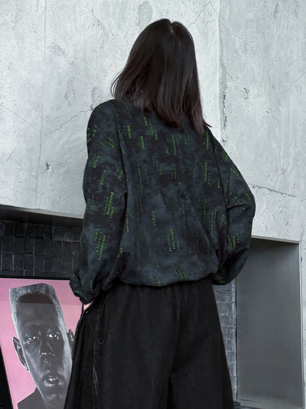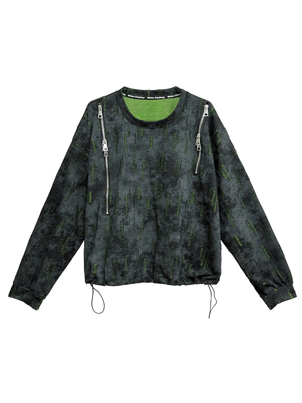 全体に縦方向のプリントパターンを施したルーズフィットトップ。ショルダー部分には開閉可能なメタルジップを配置し、シルエットや肌見せのバランスを自由に調整できる構造。軽量なコットン混素材を採用し、ほどよいハリと柔らかさを両立。裾のドローストリングでシルエット変化も楽しめる。シックなトーンの中に浮かぶグリーンのアクセントが印象的で、インダストリアルな空気を纏った一着。