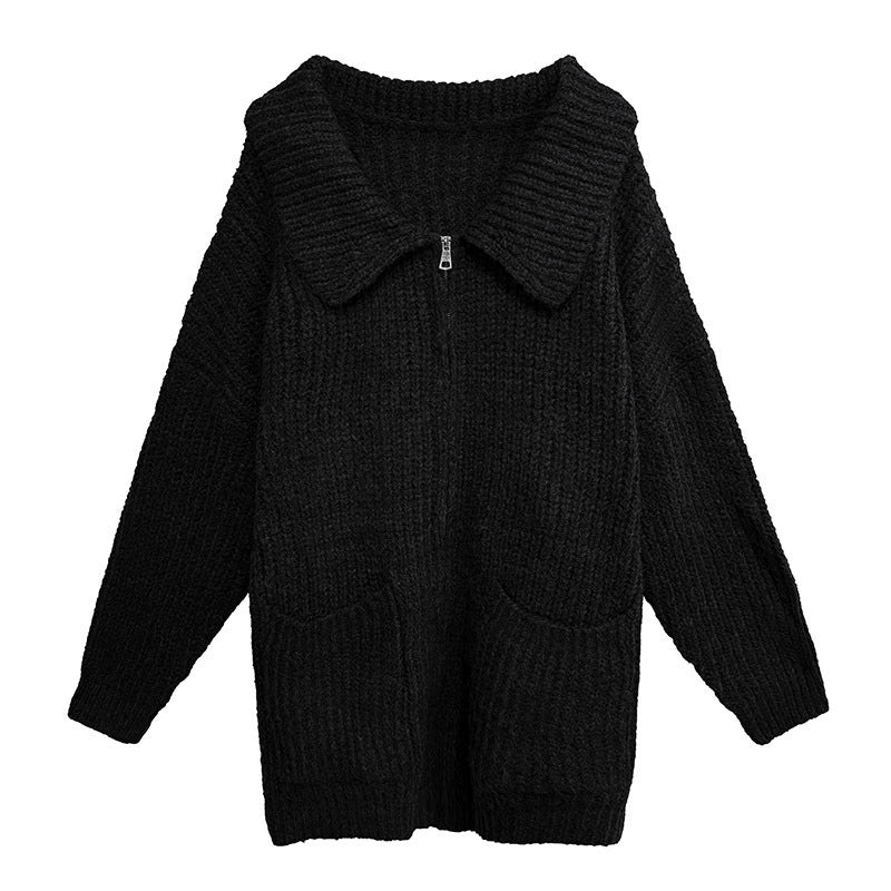 重厚感のあるリブ編みニットで構成されたジップアップカーディガン。広めに設計された襟が首元に柔らかな陰影を作り、モードな印象を引き立てる。ドロップショルダーとゆとりのあるシルエットがリラックスした雰囲気を生み、前面のポケットが程よい実用性を加える構成。厚手の生地が空気を含み、レイヤード次第でアウターとしても着用可能。